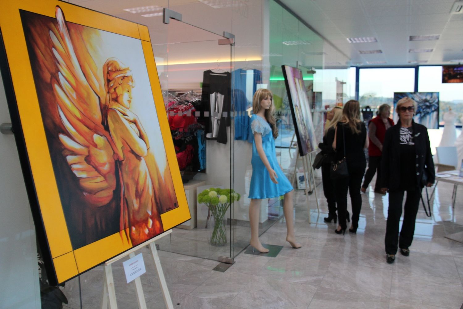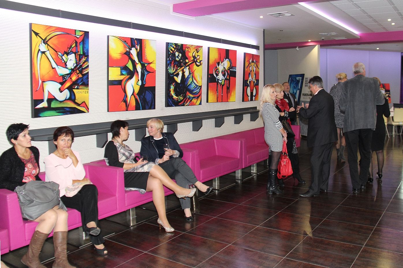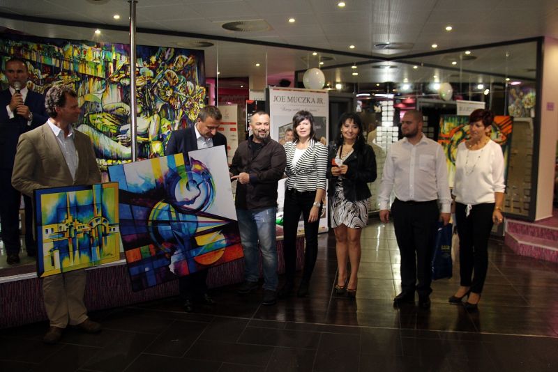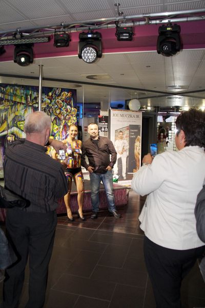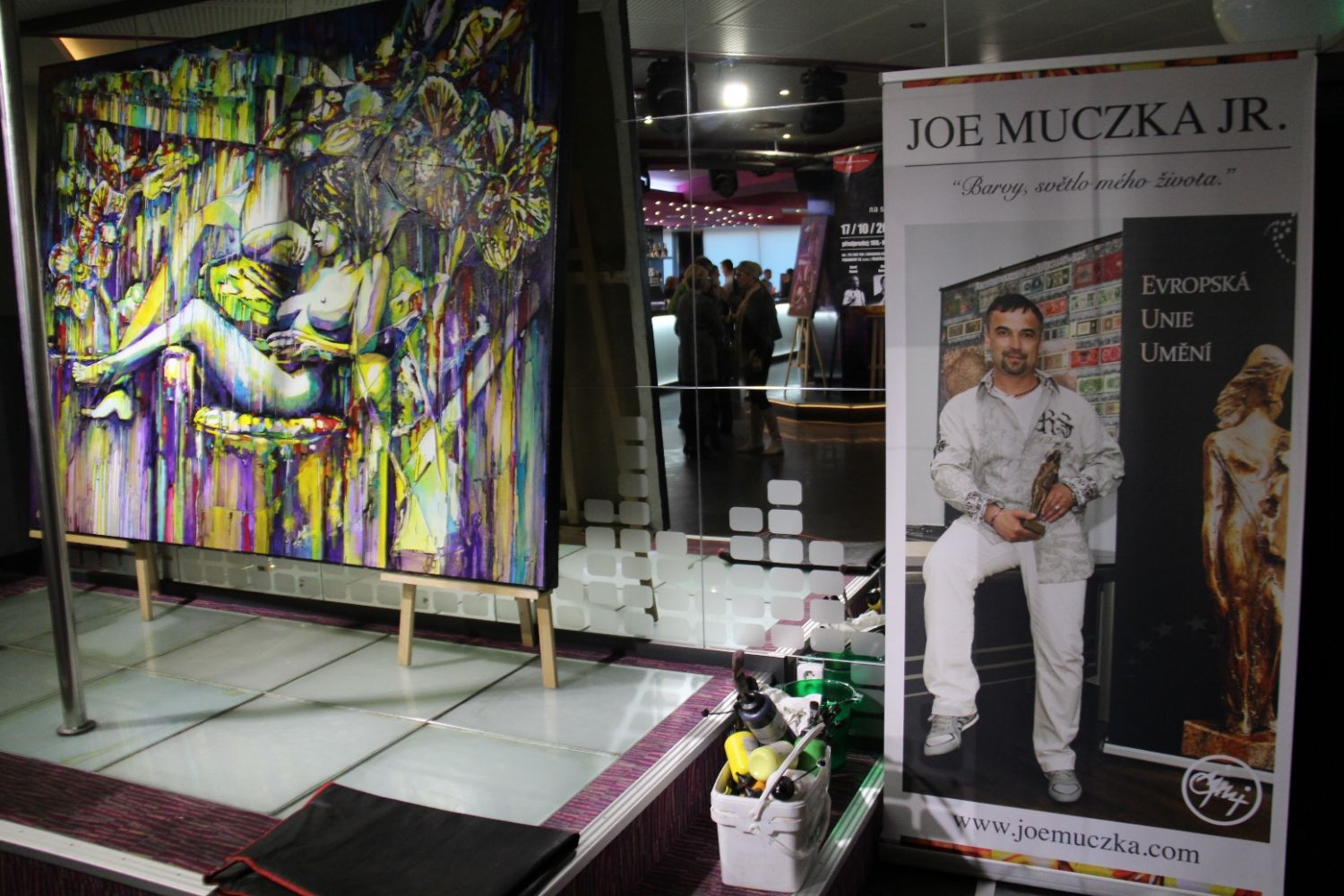 Hosté mohli krom desítek děl vystavených ve všech patrech a prostorách Panoramy včetně terasy zhlédnout třeba i módní přehlídku, nebo bodypainting v podání umělce. Ten při své malbě nanese třeba i sedmapadesát vrstev barvy. Začne tou nejsvětlejší, tedy bílou, a končí černou. Oblíbené má všechny stejně. „Využívám základní barvy červenou, žlutou a modrou a s nimi se dají namíchat všechny další," sdělil Joe Muczka. Ani umělecký směr nemá vyhraněný. Přes expresionismus se dostal ke kubismu, poté k pop artu. „A teď míchám všechno dohromady," uzavírá Muczka.