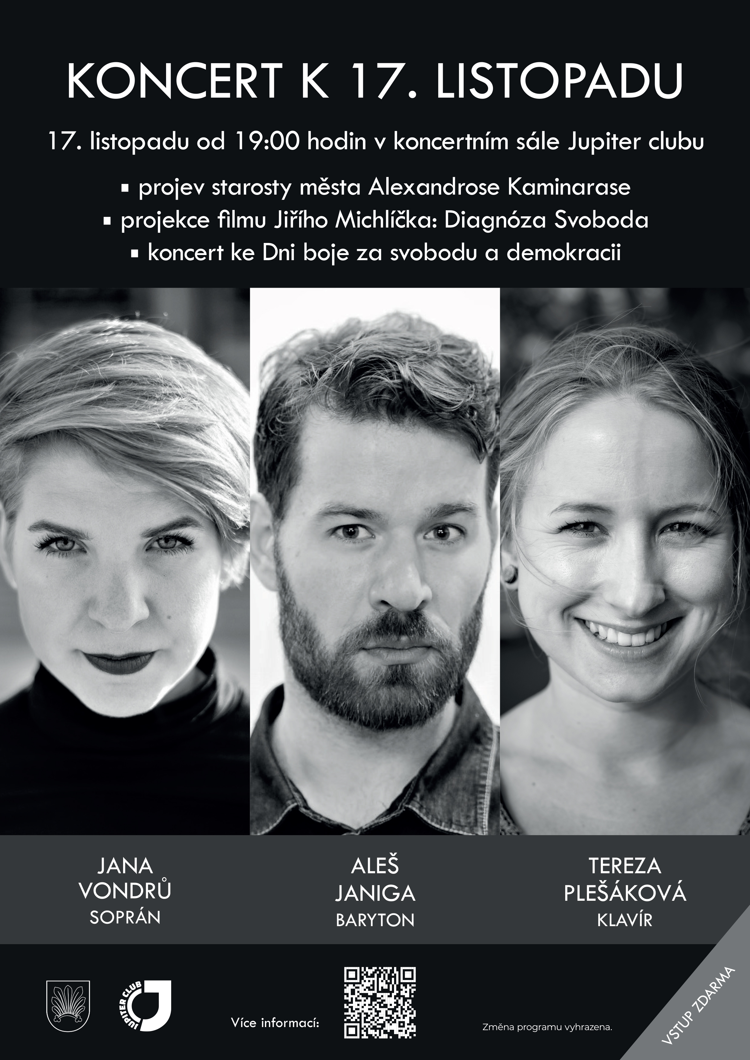 Na dění po 17. listopadu 1989 ve Velkém Meziříčí můžete vzpomenout s filmem Jiřího Michlíčka – Diagnóza Svoboda v koncertním sále Jupiter clubu od 19 hodin. Vzpomínkový večer završí koncert tria talentovaných umělců – Jany Vondrů, Aleše Janigy a Terezy Plešákové.
