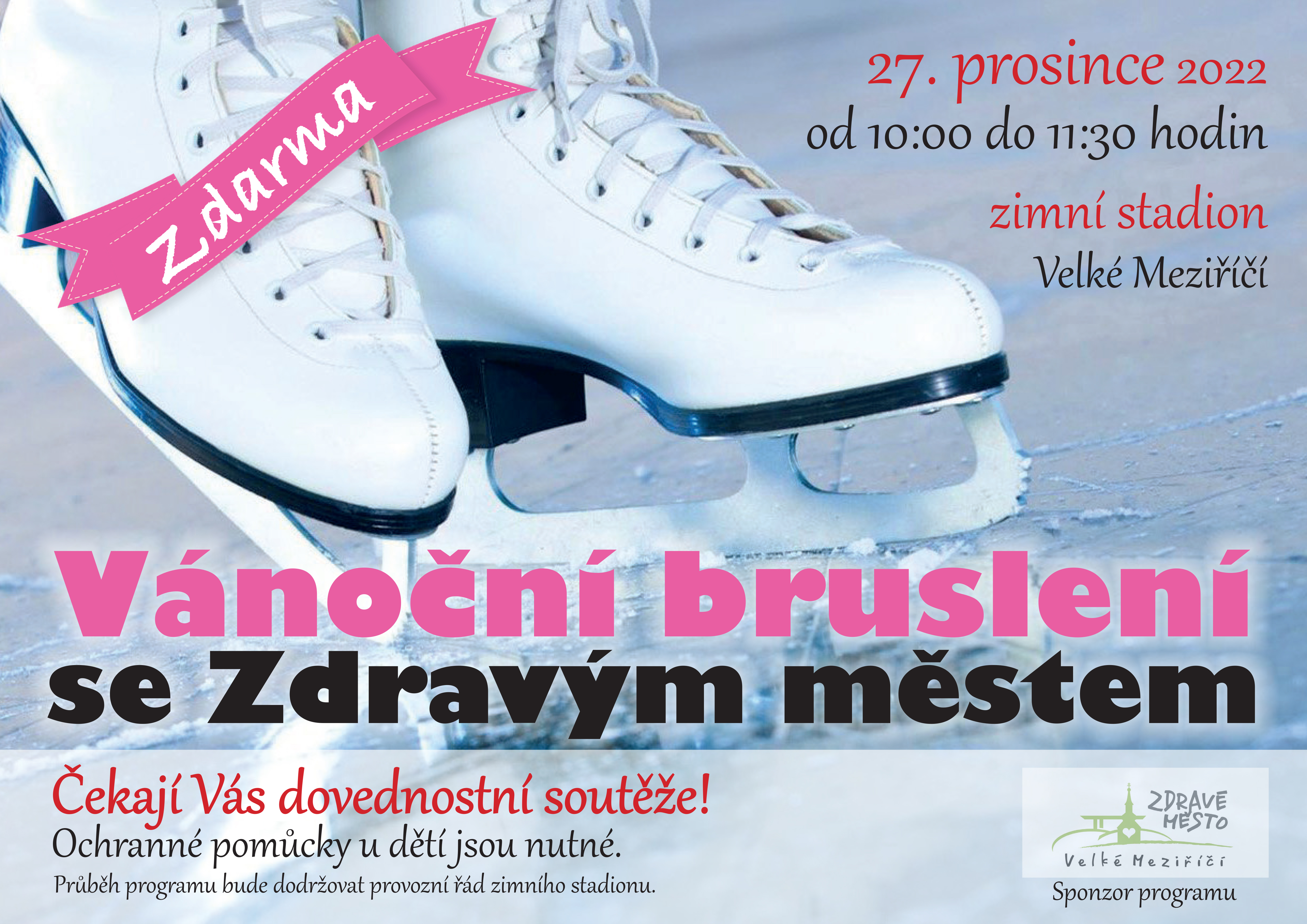 Vánoční bruslení se Zdravým městem se uskuteční 27. prosince 2022, a to v čase 10:00 – 11:30 hodin. Akce proběhne na zimním stadionu ve Velkém Meziříčí. Těšit se můžete i na dovednostní soutěže.