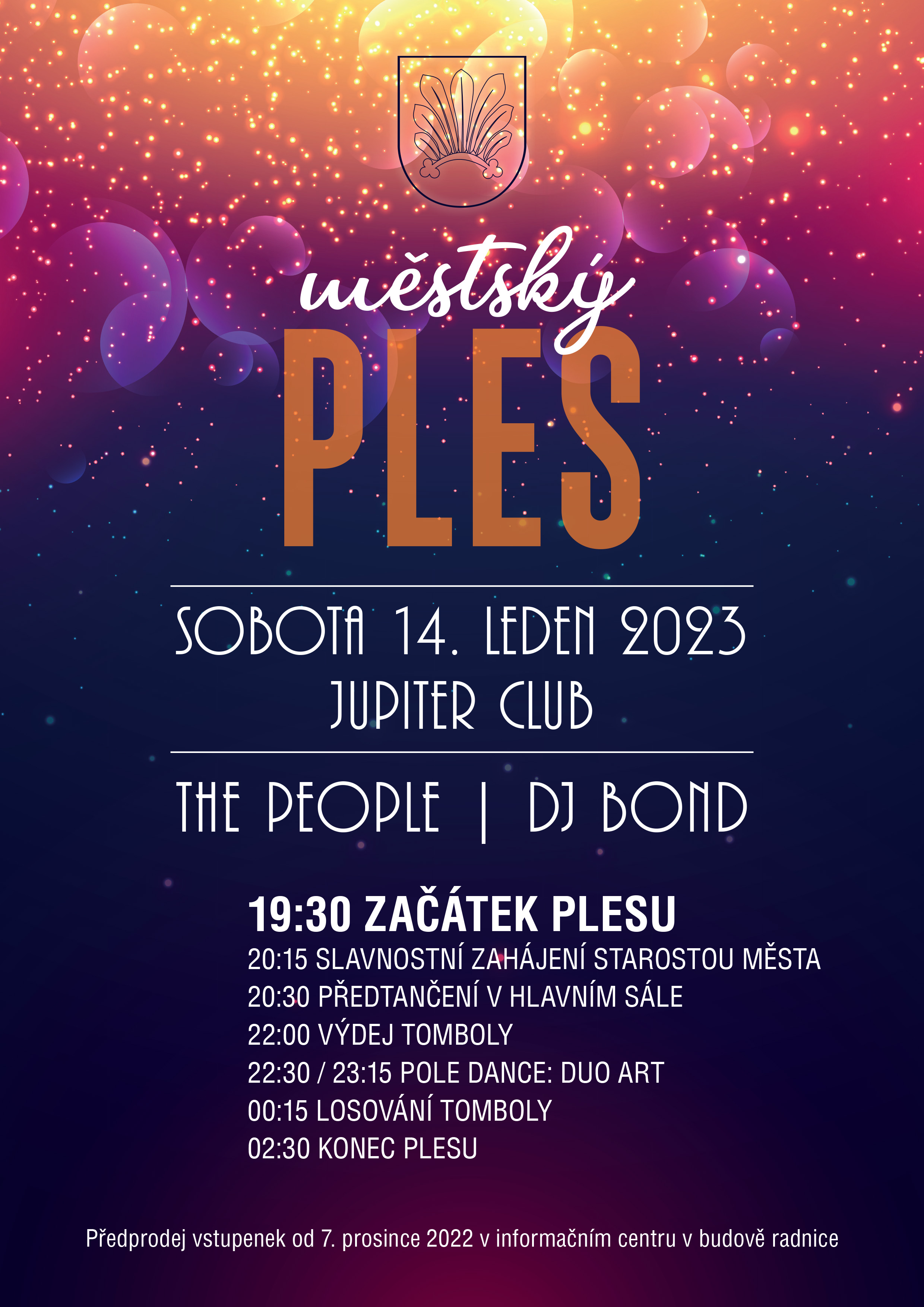 Multižánrová kapela The People opět vystoupí pro velký úspěch na městském plese, a to 14. ledna 2023. Vstupenky na ples je možné zakoupit v turistickém informačním centru v budově radnice od středy 7. prosince 2022. Těšit se můžete na bohatou tombolu, zajímavé předtančení a ukázky pole dance. Pole dance je druh tance, který spojuje prvky gymnastiky a akrobacie.