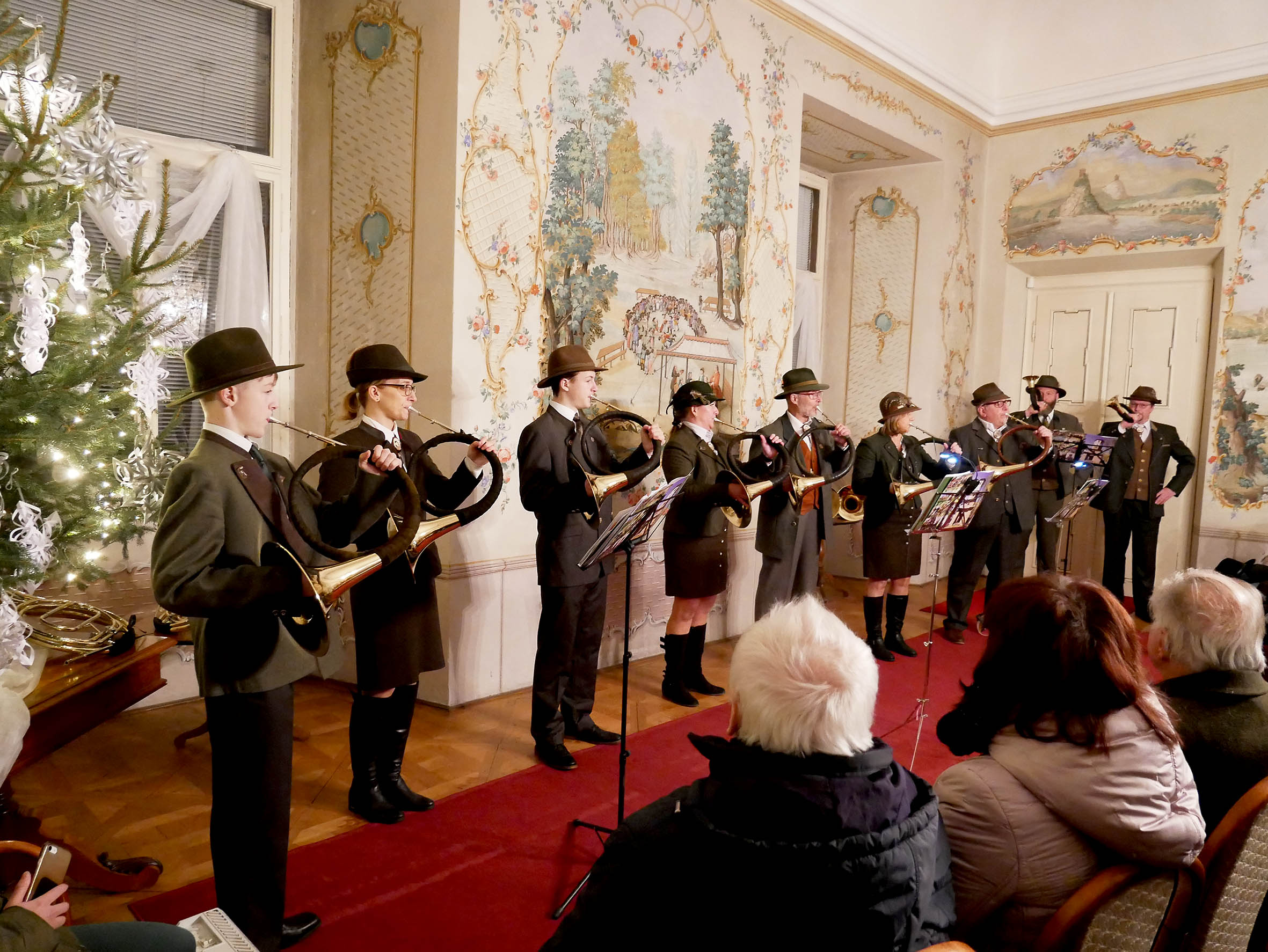 Postupně jsme se prolovili a protroubili až ke Štědrému dni a společně si zazpívali klasickou koledu Nesem vám noviny. Jak pravil Miroslav Nováček, pro někoho není lesní roh zrovna ideální hudební nástroj pro hraní koled. Trubači vystřižená koleda však možná přítomné přesvědčila, že pro radostné zvěstování o zrození spasitele těžko hledat nástroj příhodnější.