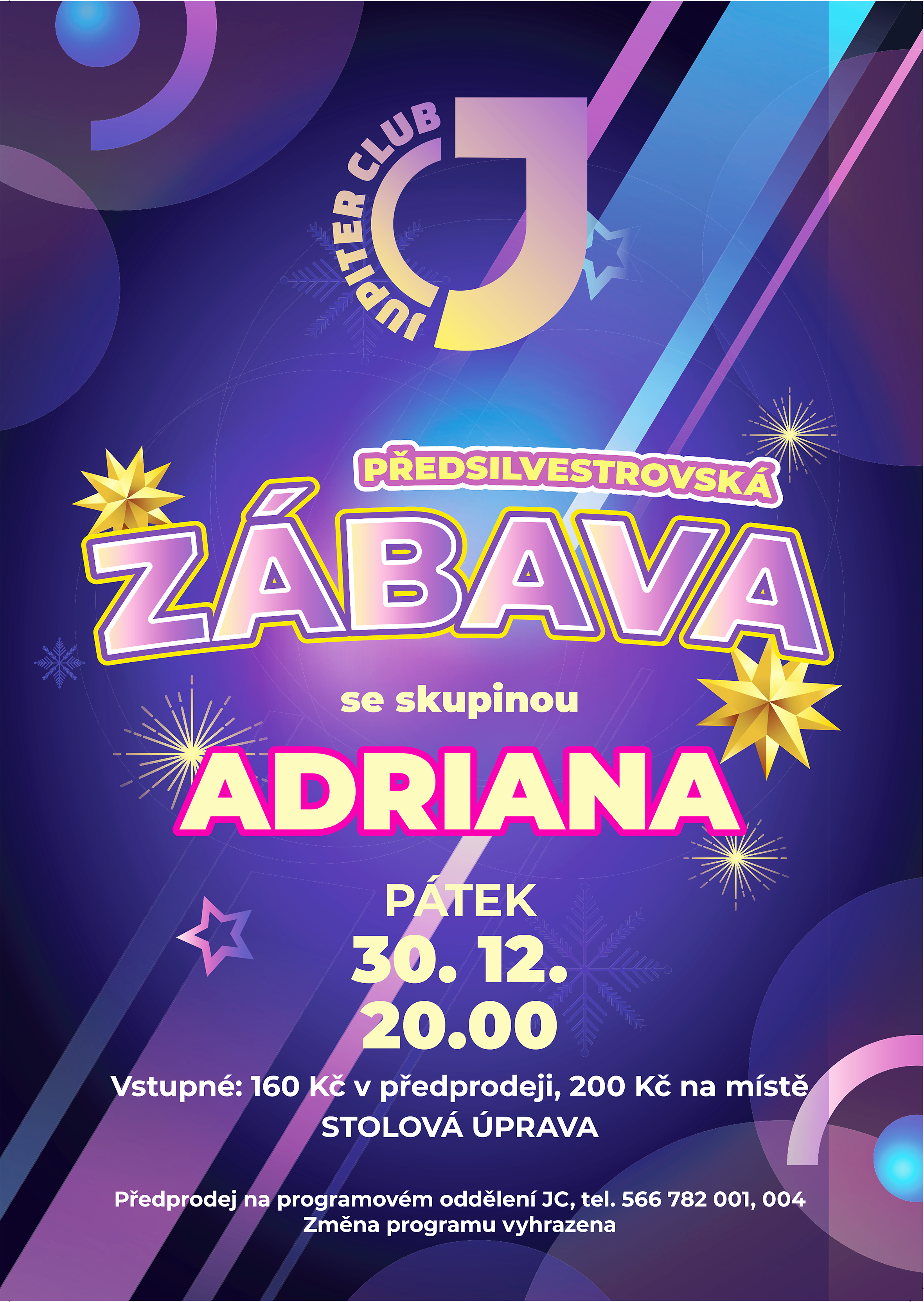 Do silvestrovské formy se můžete naladit již den předtím, tedy 30. prosince 2022, ve velkém sále Jupiter clubu ve Velkém Meziříčí. Od 20:00 tam skupina Adriana rozjíždí Předsilvestrovskou zábavu. Rezervace a prodej vstupenek zajišťuje programové oddělení Jupiter clubu, tel. 566 782 001, 004. Vstupenky budou k mání i na místě. Změna programu vyhrazena!