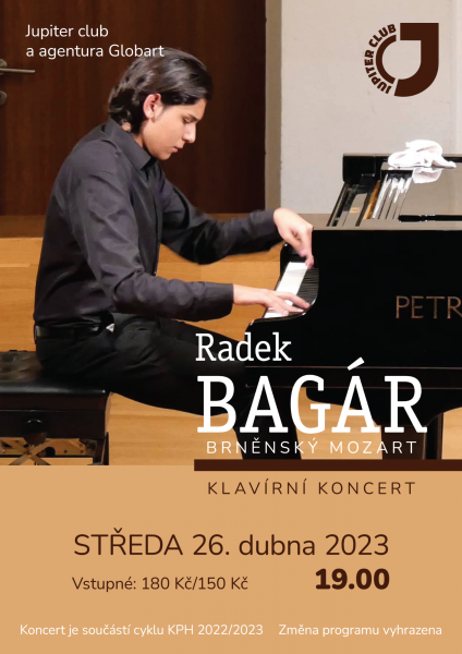 Ve středu 26. dubna vystoupí Radek Bagár, přezdívaný brněnský Mozart. Je to osmnáctiletý pianista Radek Bagár s mimořádně technicky i hudebně vyspělým projevem. Koncert bude přehlídkou virtuózních skladeb z děl F. Chopina, F. Liszta, S. Prokofjeva aj.