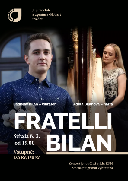 Ve středu 8. března zavítají do Jupiter clubu Fratelli Bilan, čili sourozenci Ladislav Bilan (vibrafon) a Adéla Bilanová (harfa). Koncert z cyklu mimořádně nadaných umělců Českého hudebního fondu přinese spojení dvou hudebních nástrojů, které se na koncertních pódiích objevují spíše výjimečně.