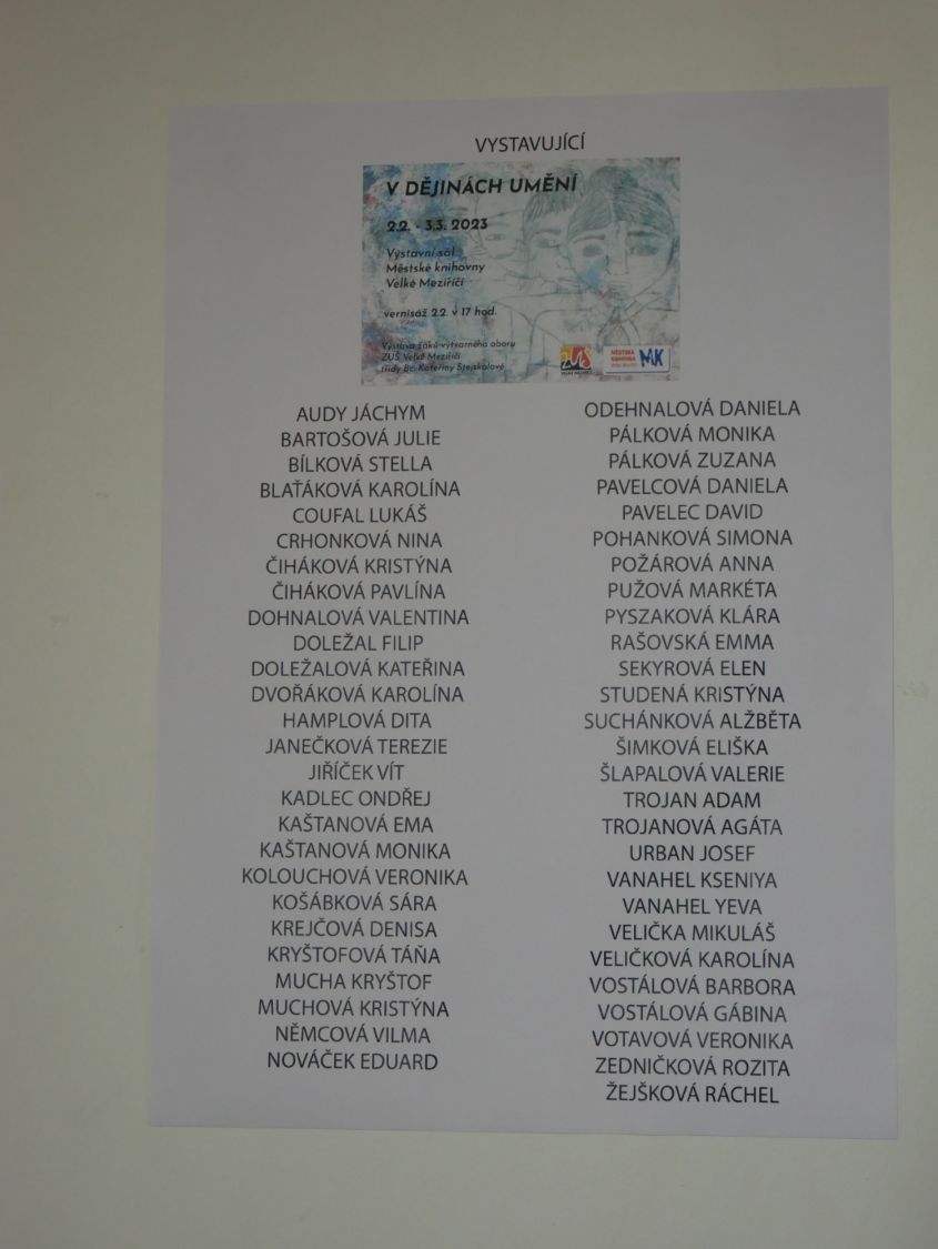 V současné době můžete v městské knihovně zhlédnout výstavu děl žáků Základní umělecké školy Velké Meziříčí. Nese název V dějinách umění, a přesně to od výstavy očekávejte. Děti různými technikami zpracovaly uměleckou tvorbu člověka od pravěku až po současnost.