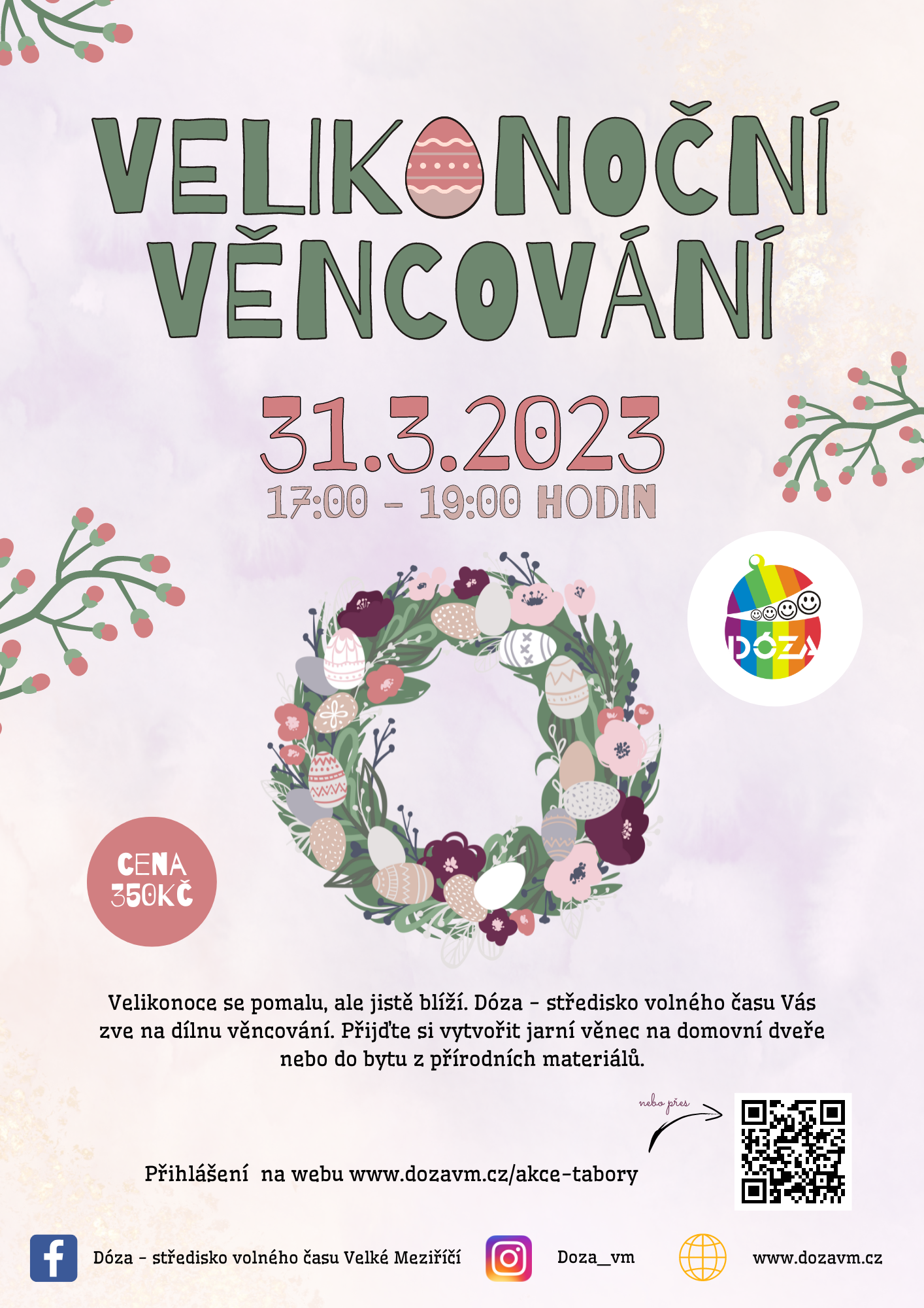 Na tři pátky v březnu si Dóza připravila odpolední workshopy pro dospělé. Těšit se můžete na dvě keramické odpoledne, kde si vyzkoušíte práci s hlínou, glazování a domů si odnesete i krásnou jarní dekoraci. A protože se pomalu, ale jistě blíží Velikonoce poslední pátek v březnu bude patřit velikonočnímu věncování. Společně si vyrobíme jarní věnec z přírodních materiálů, ať už na domovní dveře nebo jen tak na ozdobu do vašeho bytu či domu.