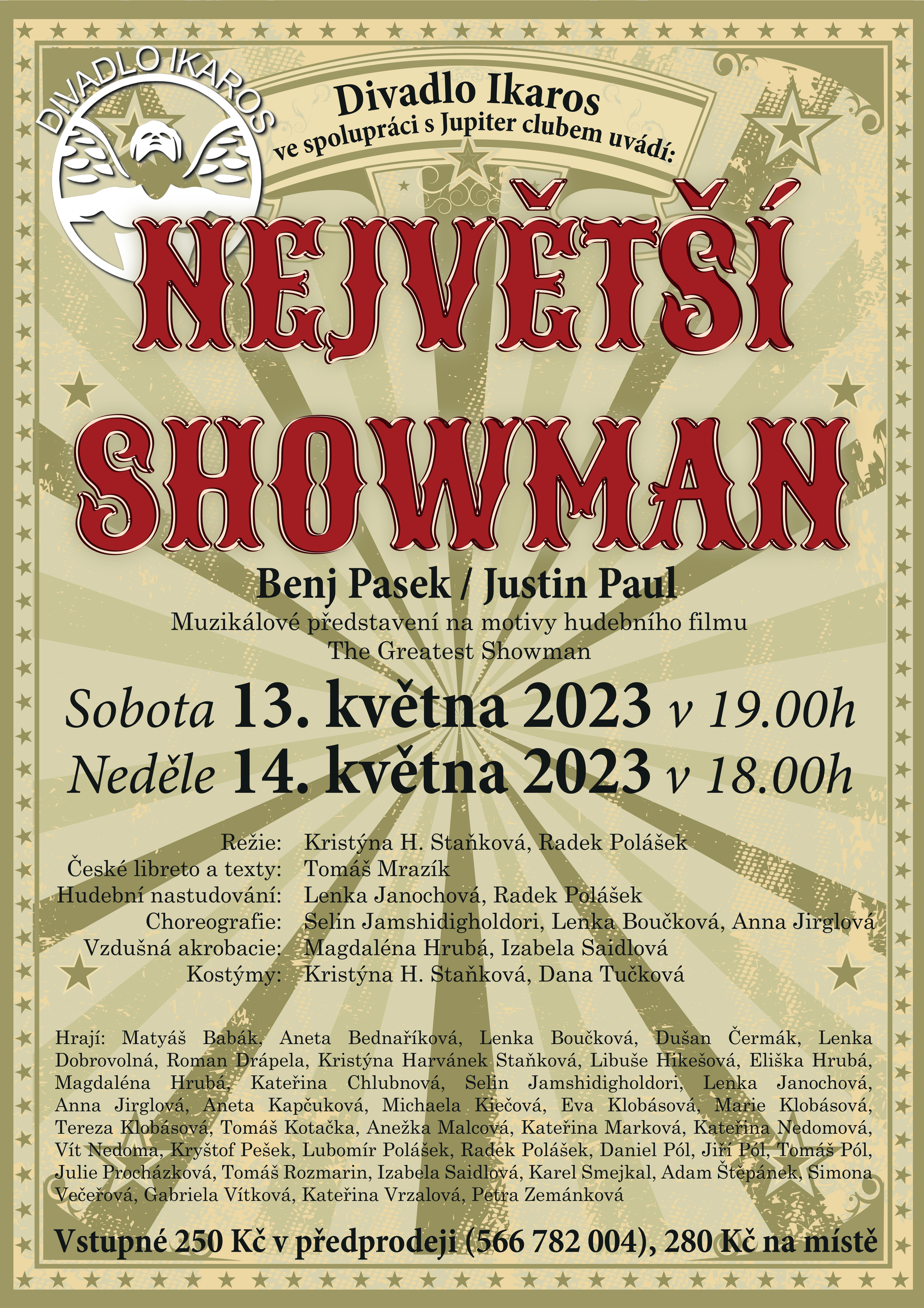 Vousaté zpěvačky, žongléři, nejvyšší muž i akrobati čekají na diváky, kteří se rozhodnou v sobotu 13. května či v neděli 14. května navštívit připravovanou hru Divadla Ikaros Největší showman. Tento muzikál uvedou velkomeziříčští ochotníci v českém překladu, o nějž se zasloužil Tomáš Mrazík, a také v české premiéře.