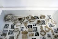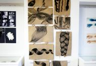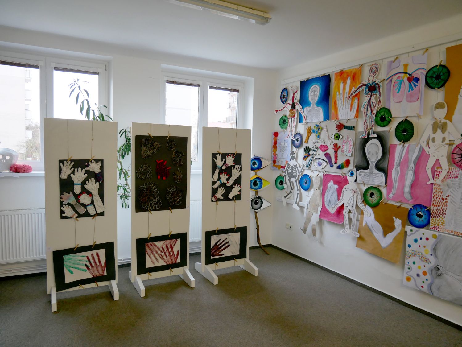 Výkresy i trojrozměrné objekty znázorňují lidské končetiny, často vyvedené do jednotlivých svalů, oběhové soustavy, dýchací soustavy a kam se podíváte, kouká lidské oko.