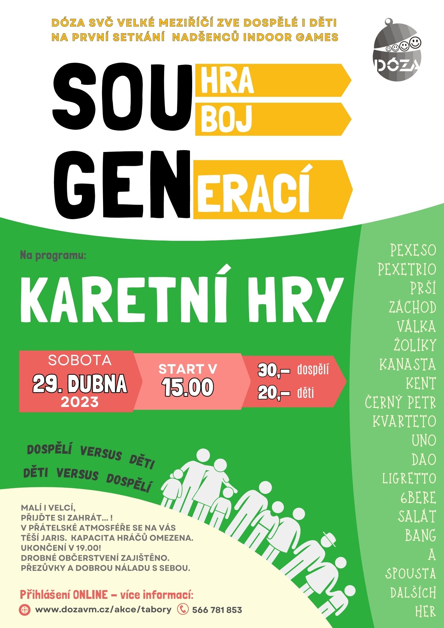 Sou-GEN (Sou-hra či Sou-boj GENerací) je určen pro malé i velké hráče a hráčky, které mají v oblibě společenské hry všeho druhu. Přijít mohou rodiny, ale i jednotlivci.