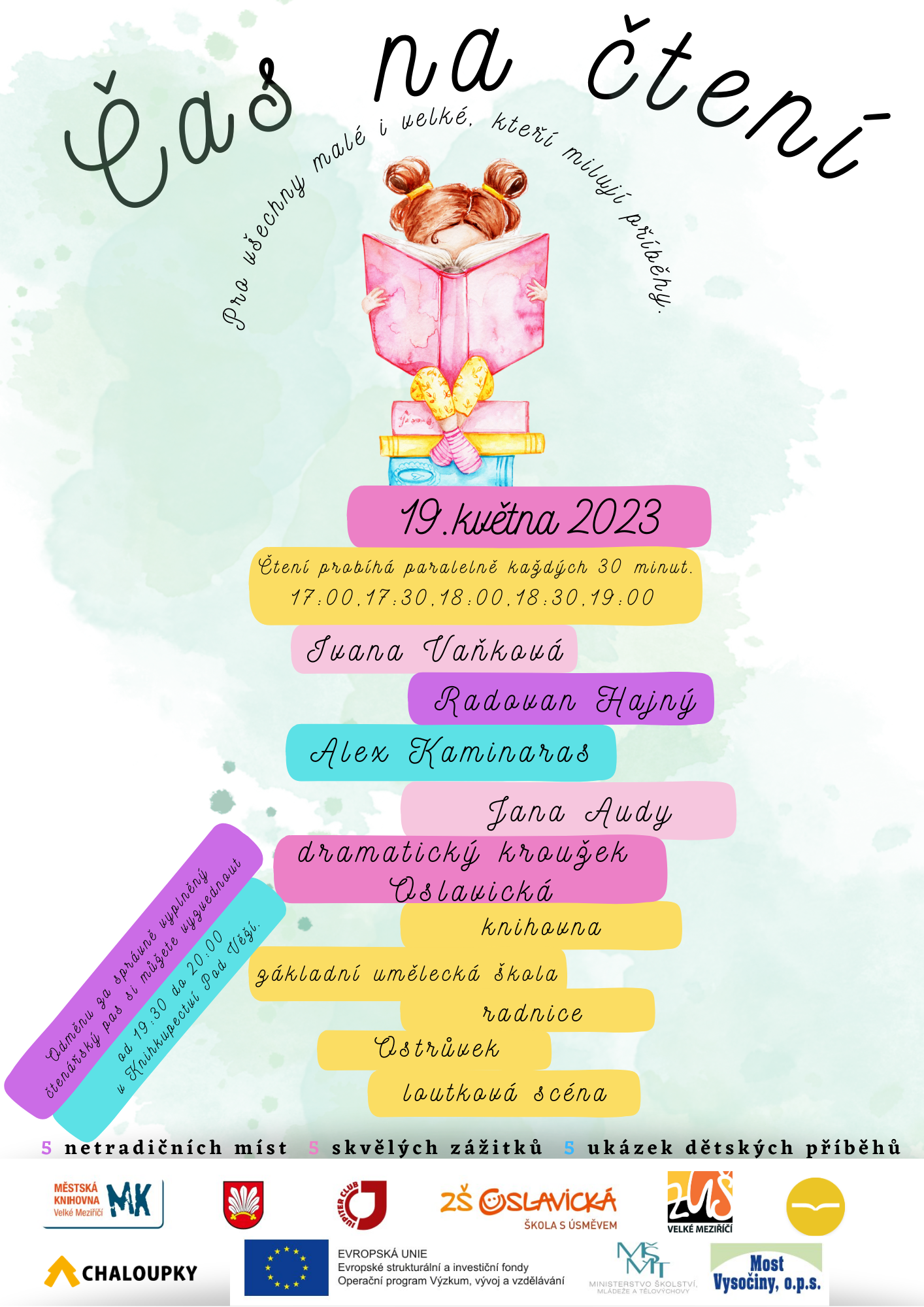 Druhý ročník akce Čas na čtení se uskuteční již v pátek 19. května od 17:00 hodin. Těšit se můžete na zajímavé čtenáře – ředitelku knihovny Ivanu Vaňkovou, organizátora akce Muzikanti dětem Radovana Hajného, starostu Alexandrose Kaminarase s místostarostou Martinem Kamanem, vedoucí ekocentra Baliny Janu Audy nebo dramatický kroužek ZŠ Oslavická. Různé pohádkové příběhy si tak můžete přijít poslechnout do knihovny, na základní uměleckou školu, do budovy radnice, na Ostrůvek nebo na malou (loutkovou) scénu.