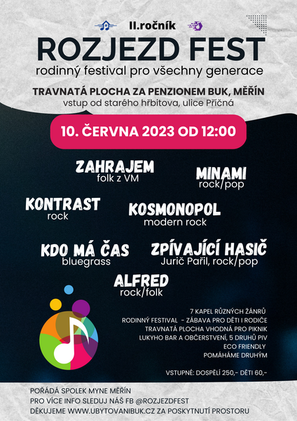 Kapely různých žánrů, zábava pro děti i rodiče, pět druhů piv i charitativní pomoc – to vše slibuje rodinný festival Rozjezd Fest, jehož druhý ročník pořádá spolek MyNe Měřín 10. června ve 12 hodin na travnaté ploše za Penzionem Buk v Měříně. Dospělí za vstupné zaplatí 250 korun, děti 60.