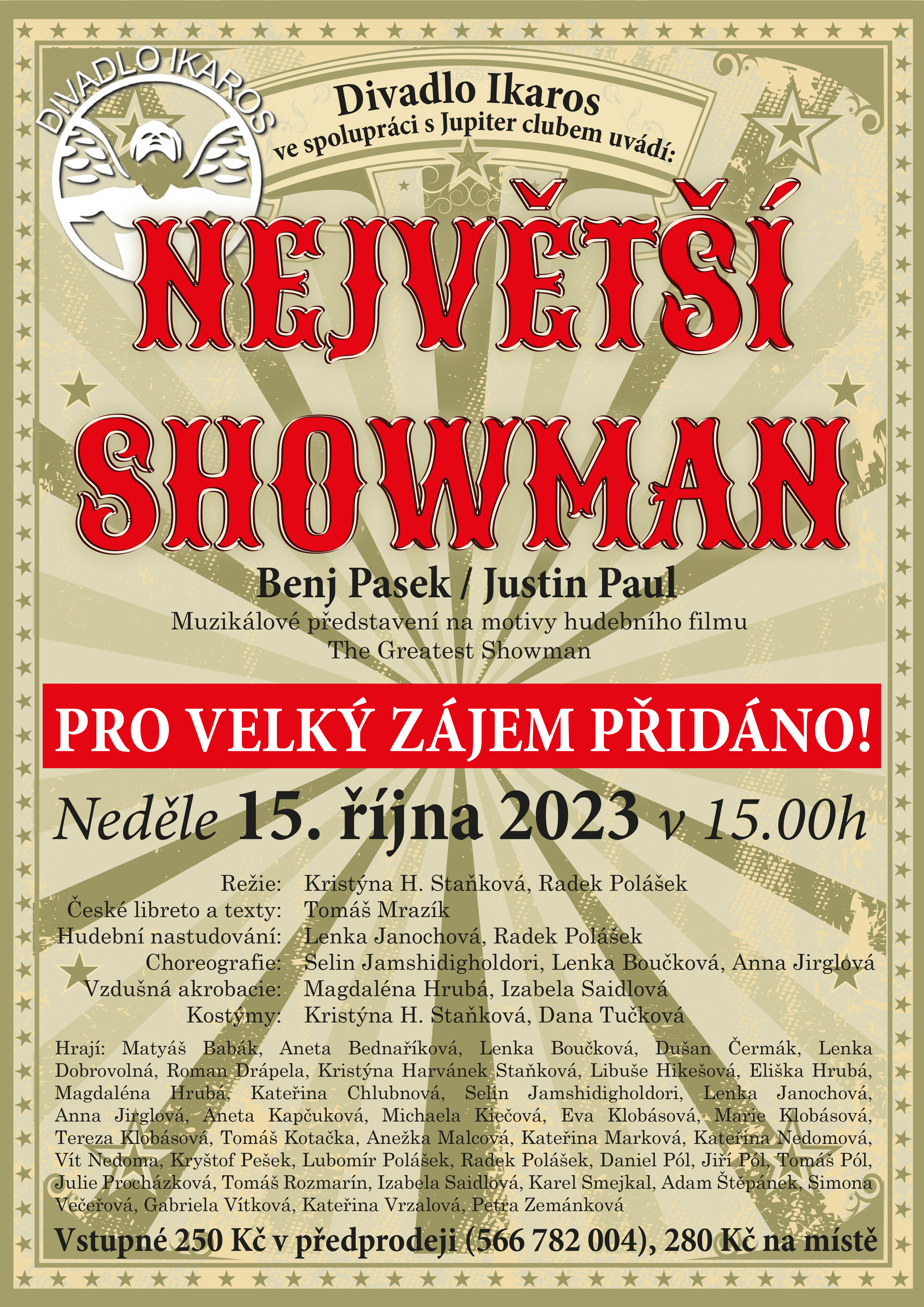 Vzdušná akrobacie, oslnivé pěvecké i herecké výkony, propracované choreografie, kostýmy i vlastní české texty muzikálu Největší showman velkomeziříčským divákům v květnu doslova učarovaly. Kvůli enormnímu zájmu o jeho reprízu se tak herci z Divadla Ikaros rozhodli přidat ještě další termín představení, a to na neděli 15. října v 15 hodin. Předprodej vstupenek začal 24. května v programovém oddělení Jupiter clubu.