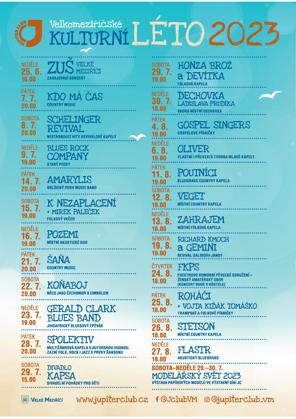 Velkomeziříčské kulturní léto i letos zahájila místní základní umělecká škola. Celou akcí provedly dvě mladé slečny, které vždy představily daný žánr, skladbu a vystupující. Nechyběla ani taneční vystoupení v podání těch menších. Večer zakončil taneční orchestr v čele se sbormistrem Josefem Vaňharou.