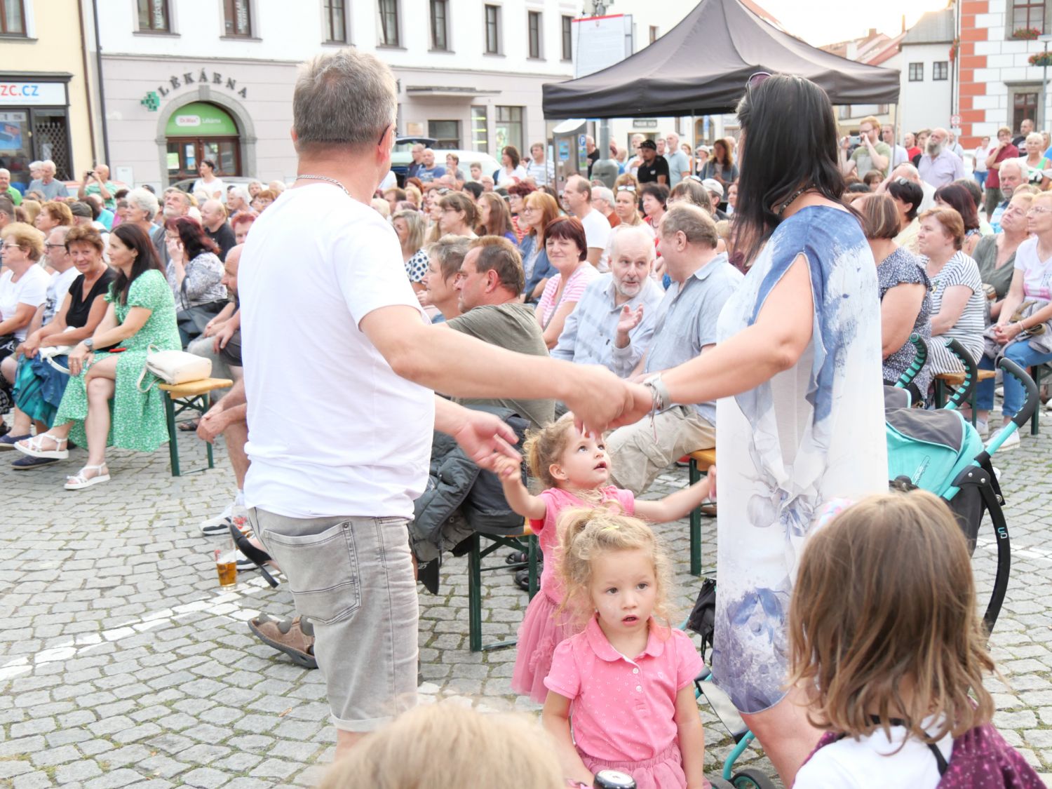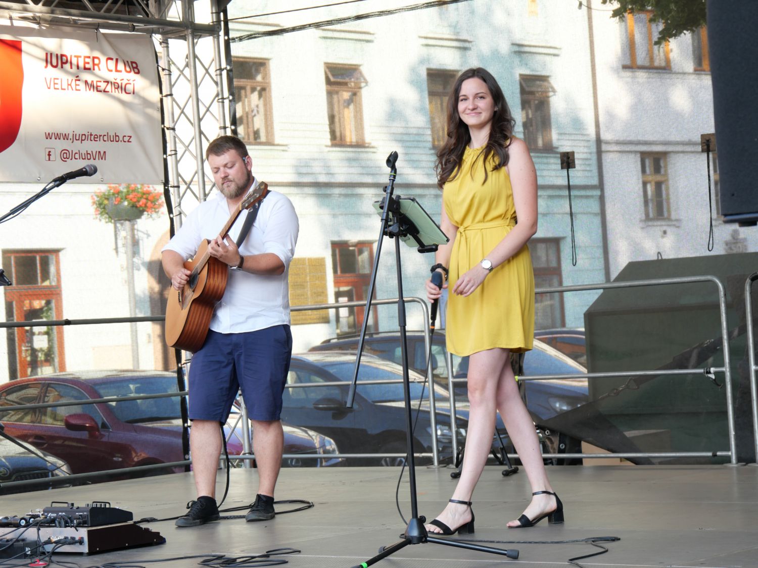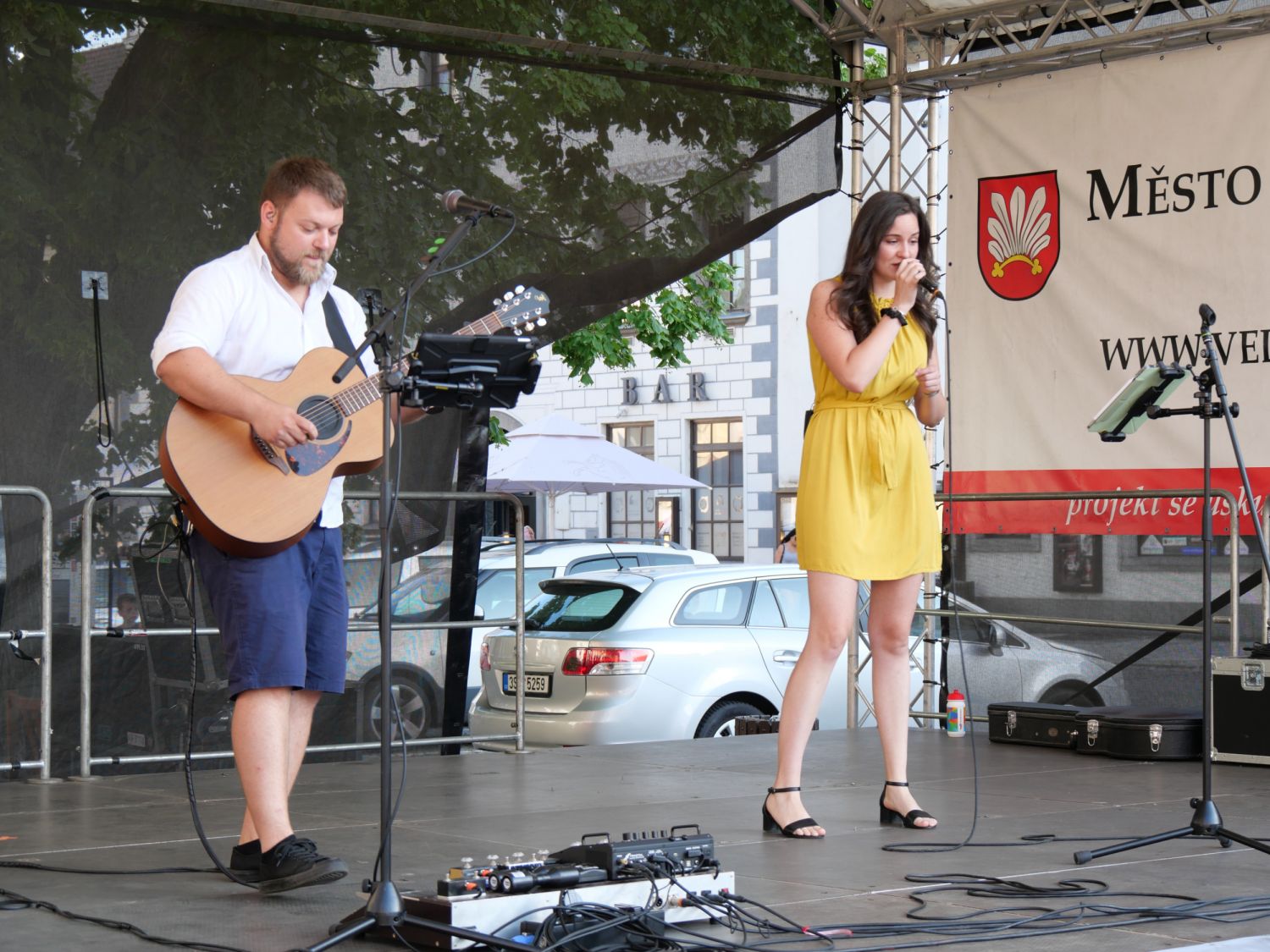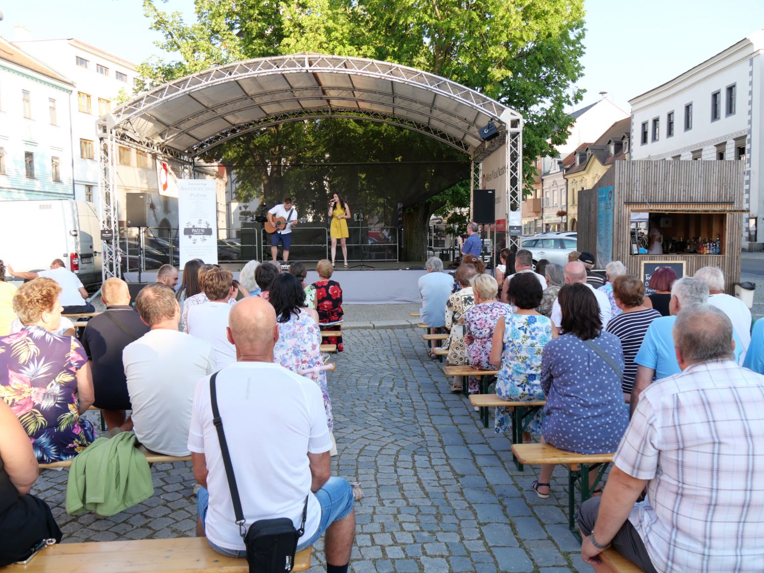 Duo PoZemi, které tvoří Betty Pospíšilová a Jan Zemánek, vzniklo v roce 2020. Má za sebou už tři sezóny hraní na svatbách, různých městských akcích či jako předskokan Dalibora Jandy na koncertě v Dačicích. Domácím posluchačům možná není tolik známé, i tak byly lavičky na náměstí obsazené. Řada lidí postávala kolem a neubránila se pohupování do rytmu a prozpěvování spolu s muzikanty. Zněla totiž směsice známých a oblíbených vesměs popových písniček, jako například Do nebe, Jsem optimista ale třeba i šanson Čerešně nebo Verunčina píseň lásky z pohádky Jak si zasloužit princeznu. Znovu je můžete slyšel 15. září na faře, kde budou hrát pro dobrou věc v rámci Kávy od srdce.