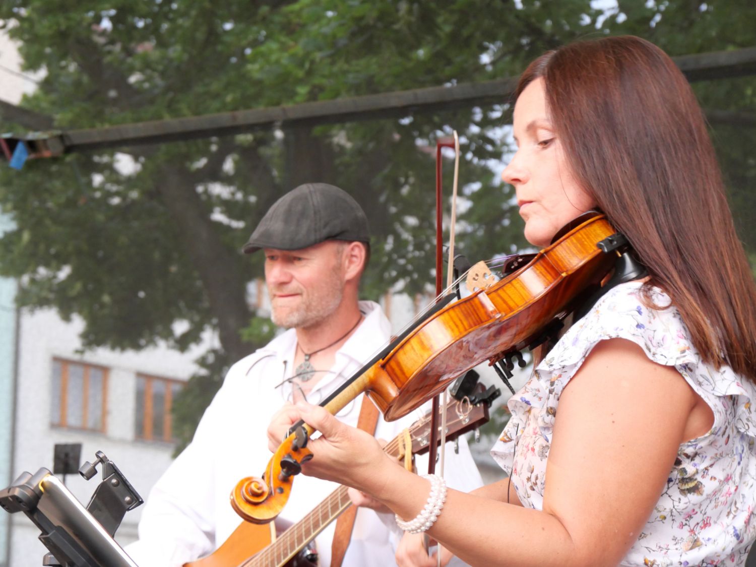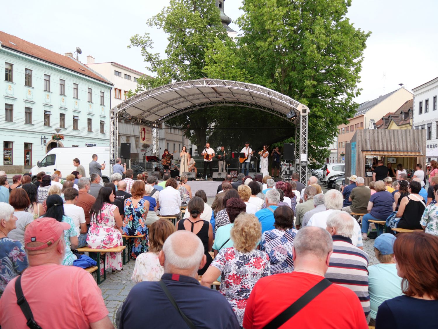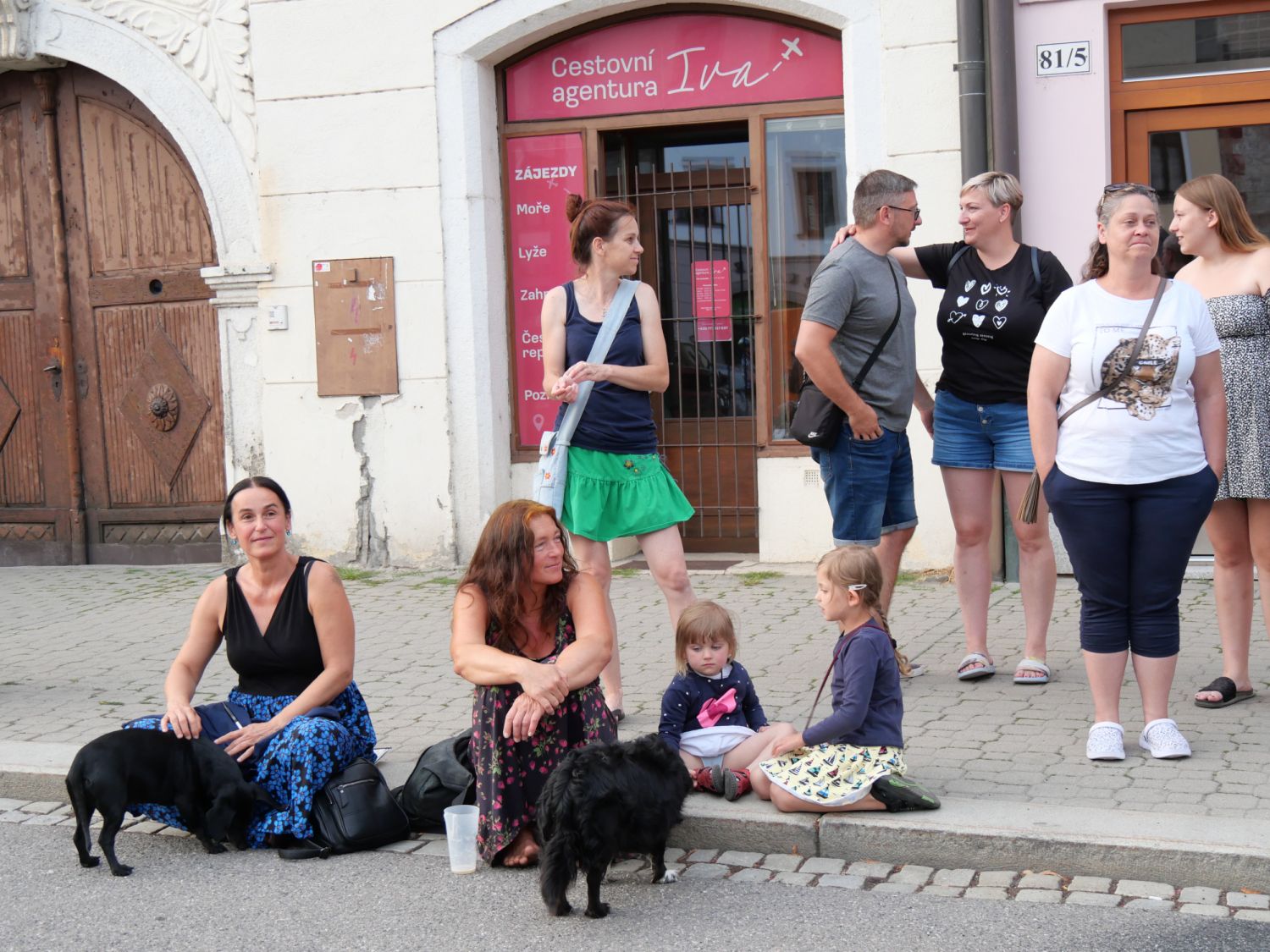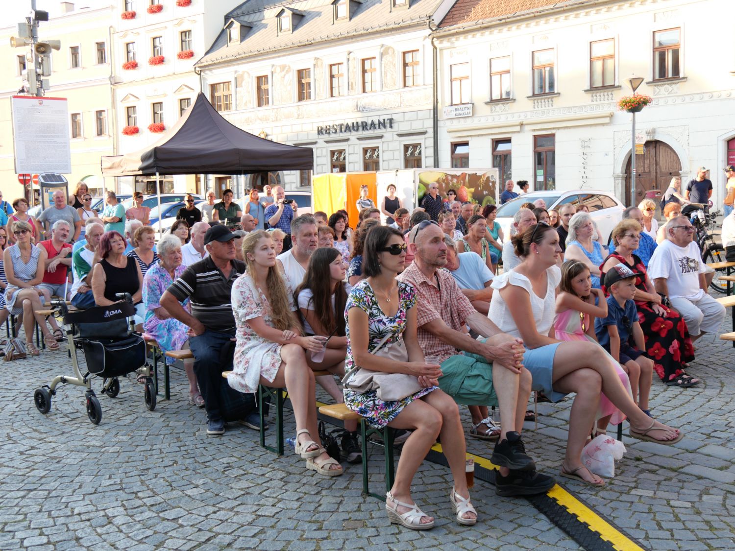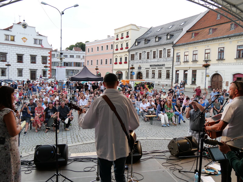 Duo PoZemi, které tvoří Betty Pospíšilová a Jan Zemánek, vzniklo v roce 2020. Má za sebou už tři sezóny hraní na svatbách, různých městských akcích či jako předskokan Dalibora Jandy na koncertě v Dačicích. Domácím posluchačům možná není tolik známé, i tak byly lavičky na náměstí obsazené. Řada lidí postávala kolem a neubránila se pohupování do rytmu a prozpěvování spolu s muzikanty. Zněla totiž směsice známých a oblíbených vesměs popových písniček, jako například Do nebe, Jsem optimista ale třeba i šanson Čerešně nebo Verunčina píseň lásky z pohádky Jak si zasloužit princeznu. Znovu je můžete slyšel 15. září na faře, kde budou hrát pro dobrou věc v rámci Kávy od srdce.