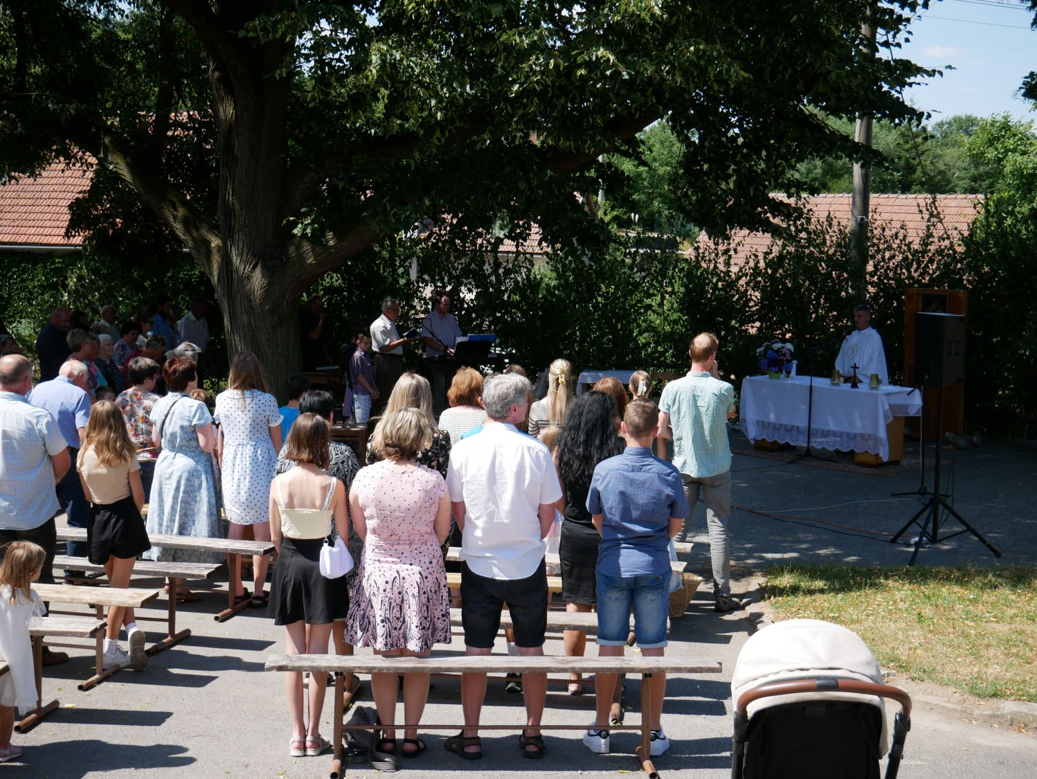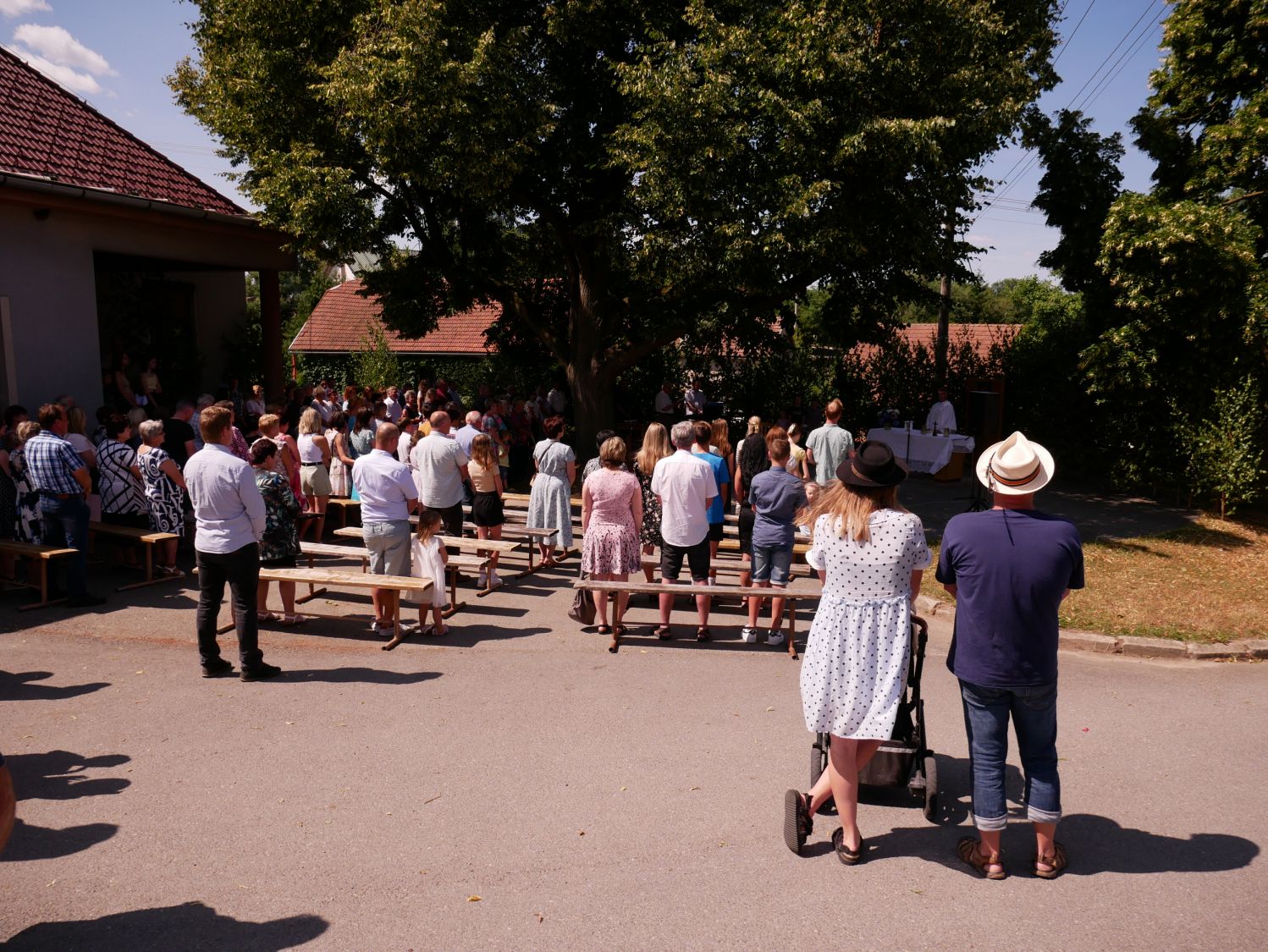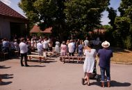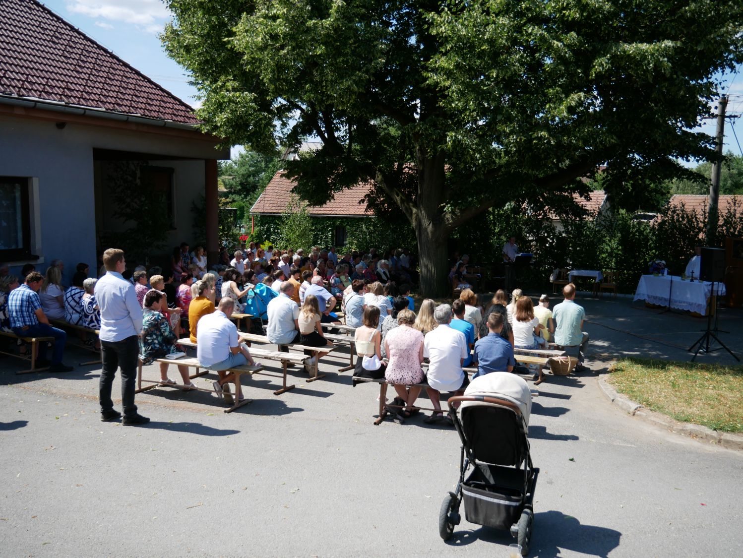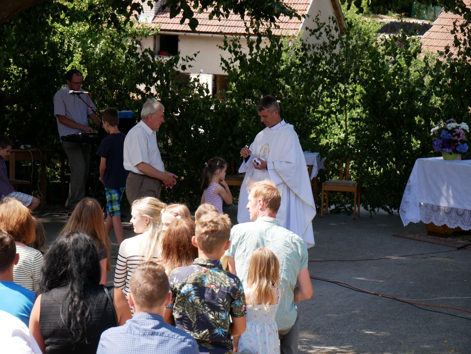Pouťové oslavy pak vyvrcholily v neděli před polednem, kdy u kulturního domu pod nádhernou košatou lípou sloužil mši svatou velkomeziříčský děkan Jiří Kaňa. Účast byla velká, dorazili nejen místní, ale i lidé ze širokého okolí.