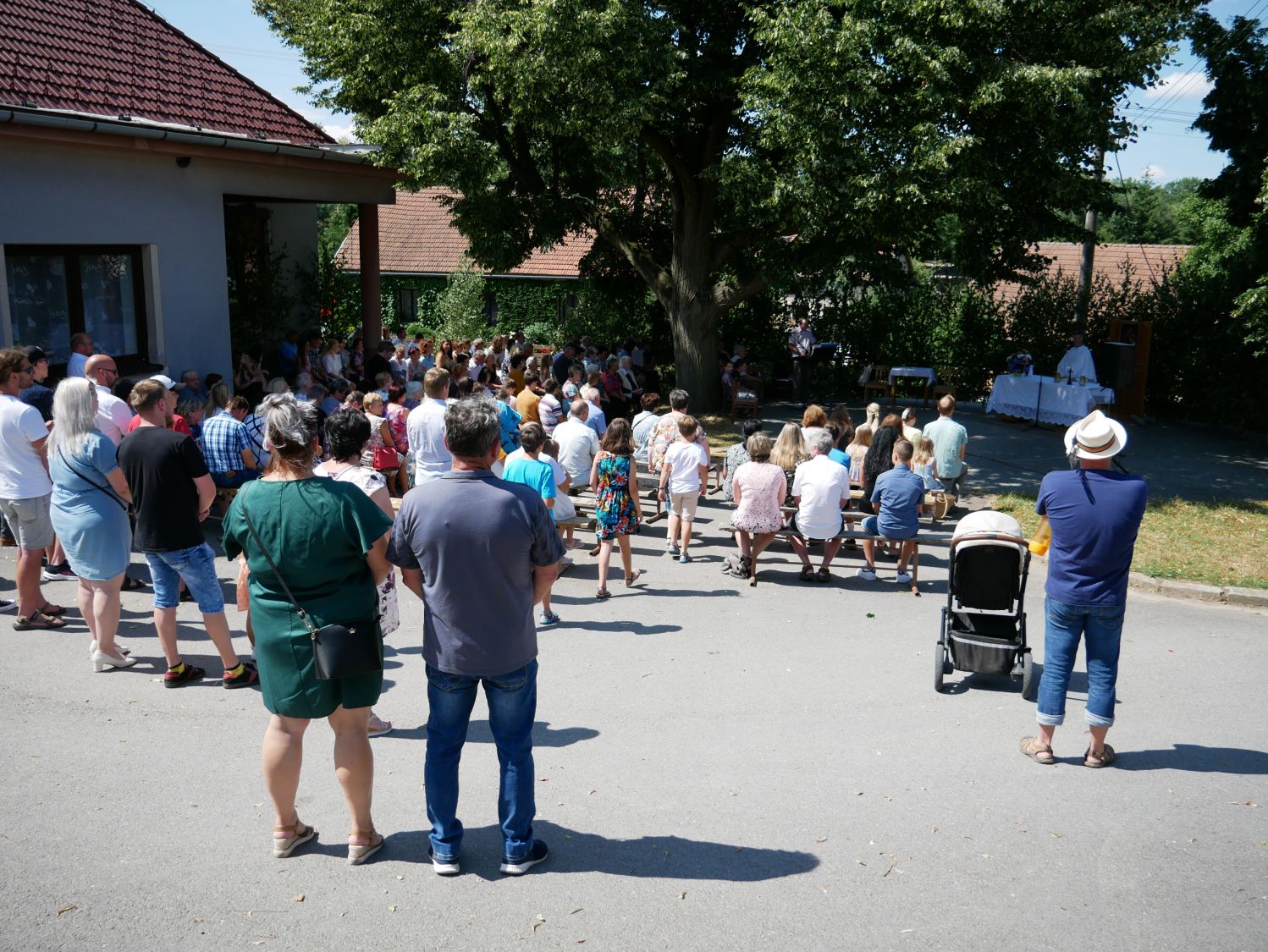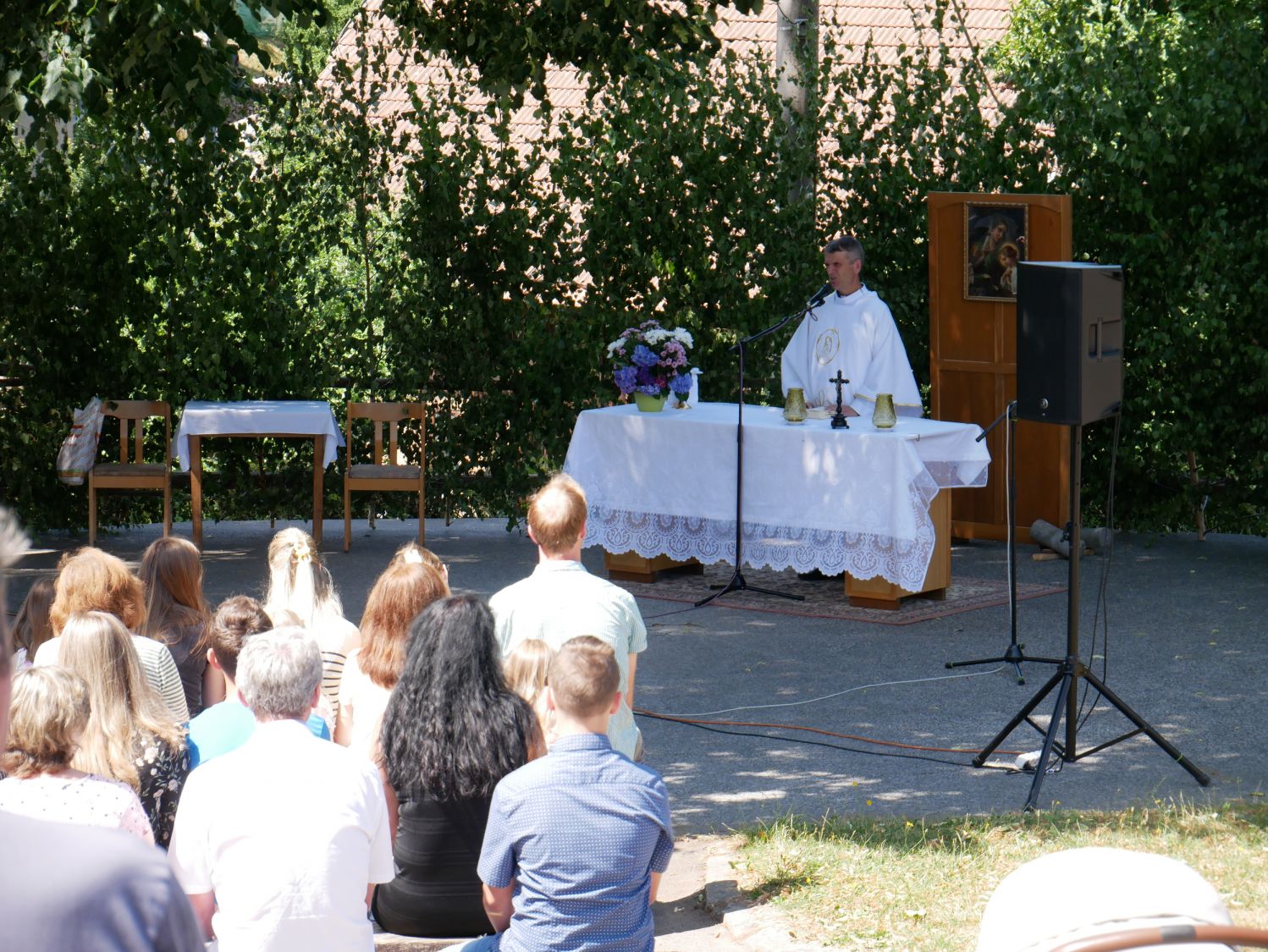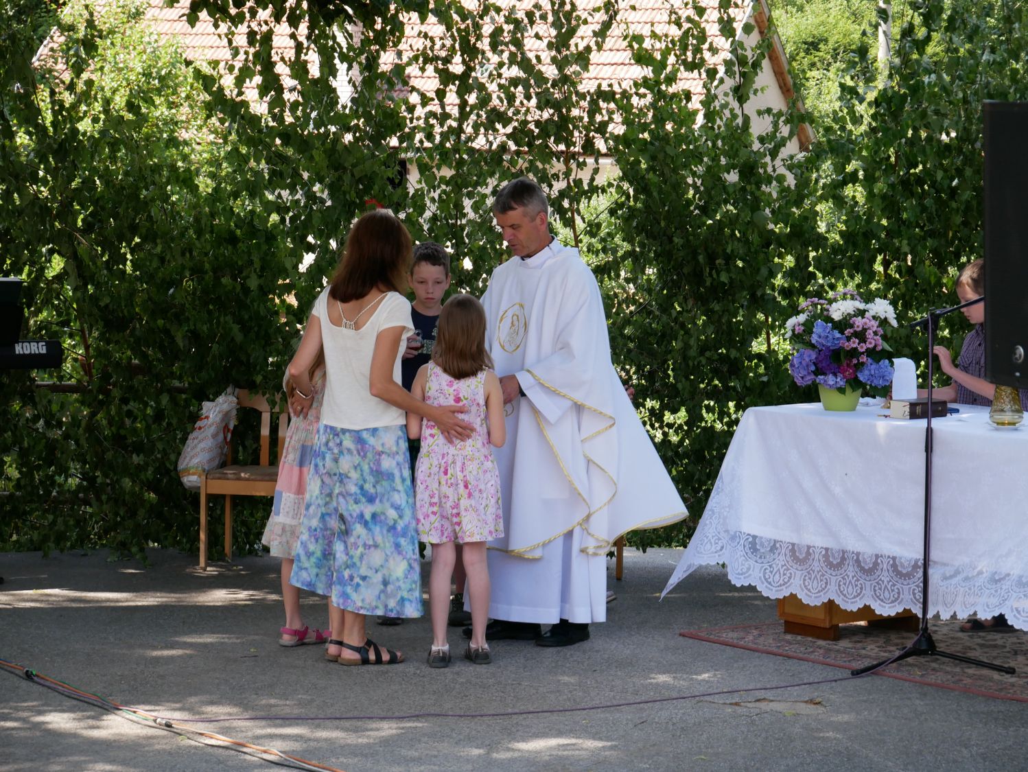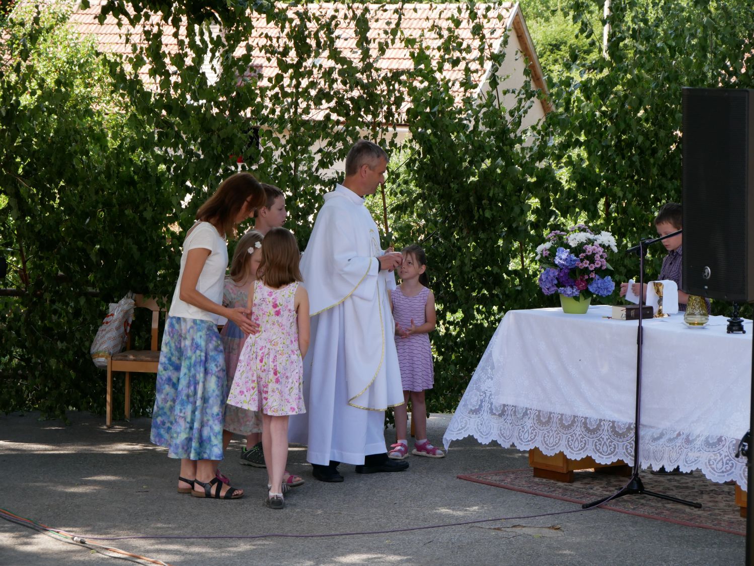 Pouťové oslavy pak vyvrcholily v neděli před polednem, kdy u kulturního domu pod nádhernou košatou lípou sloužil mši svatou velkomeziříčský děkan Jiří Kaňa. Účast byla velká, dorazili nejen místní, ale i lidé ze širokého okolí.