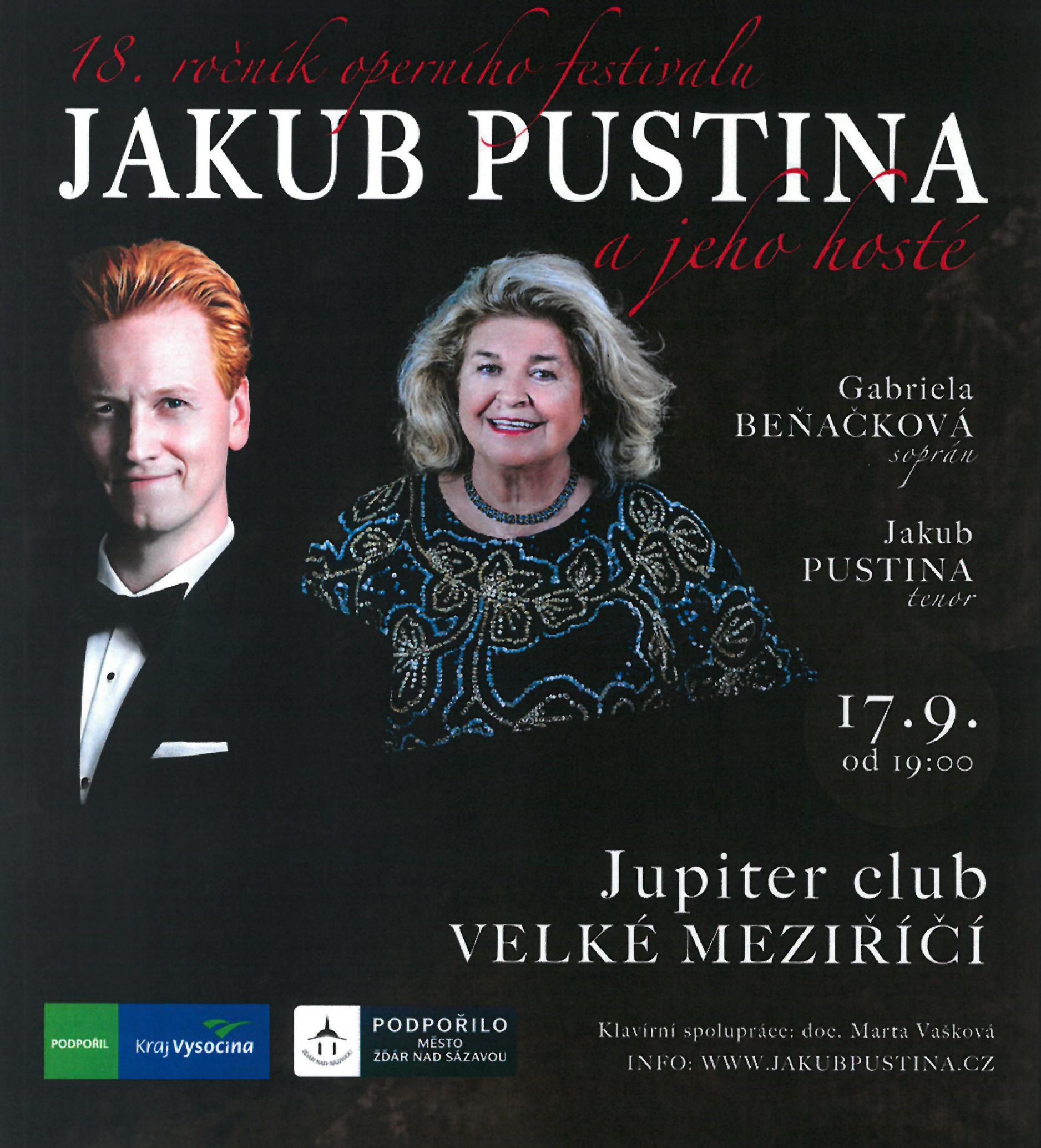 Po boku žďárského tenoristy Jakuba Pustiny se velkomeziříčskému publiku představí světová sopranistka Gabriela Beňačková. Koncert hudebního festivalu Jakub Pustina a jeho hosté proběhne v Jupiter clubu 17. září od 19 hodin.