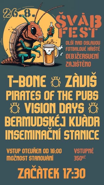 O půl šesté odpoledne tu na fotbalovém hřišti vypukne první ročník punkového festivalu Šváb fest. Už teď se můžete těšit na kapely Pirate of the Pub, Vision Days, T-Bone, Bermudskej kvádr, Inseminační stanice a nebude chybět ani legendární Záviš. Vstupné je 350 korun.