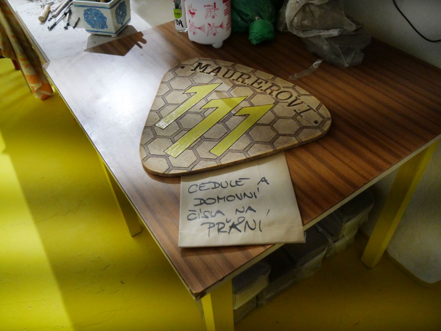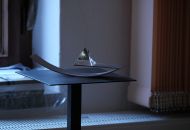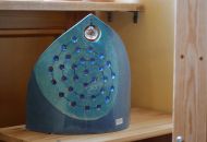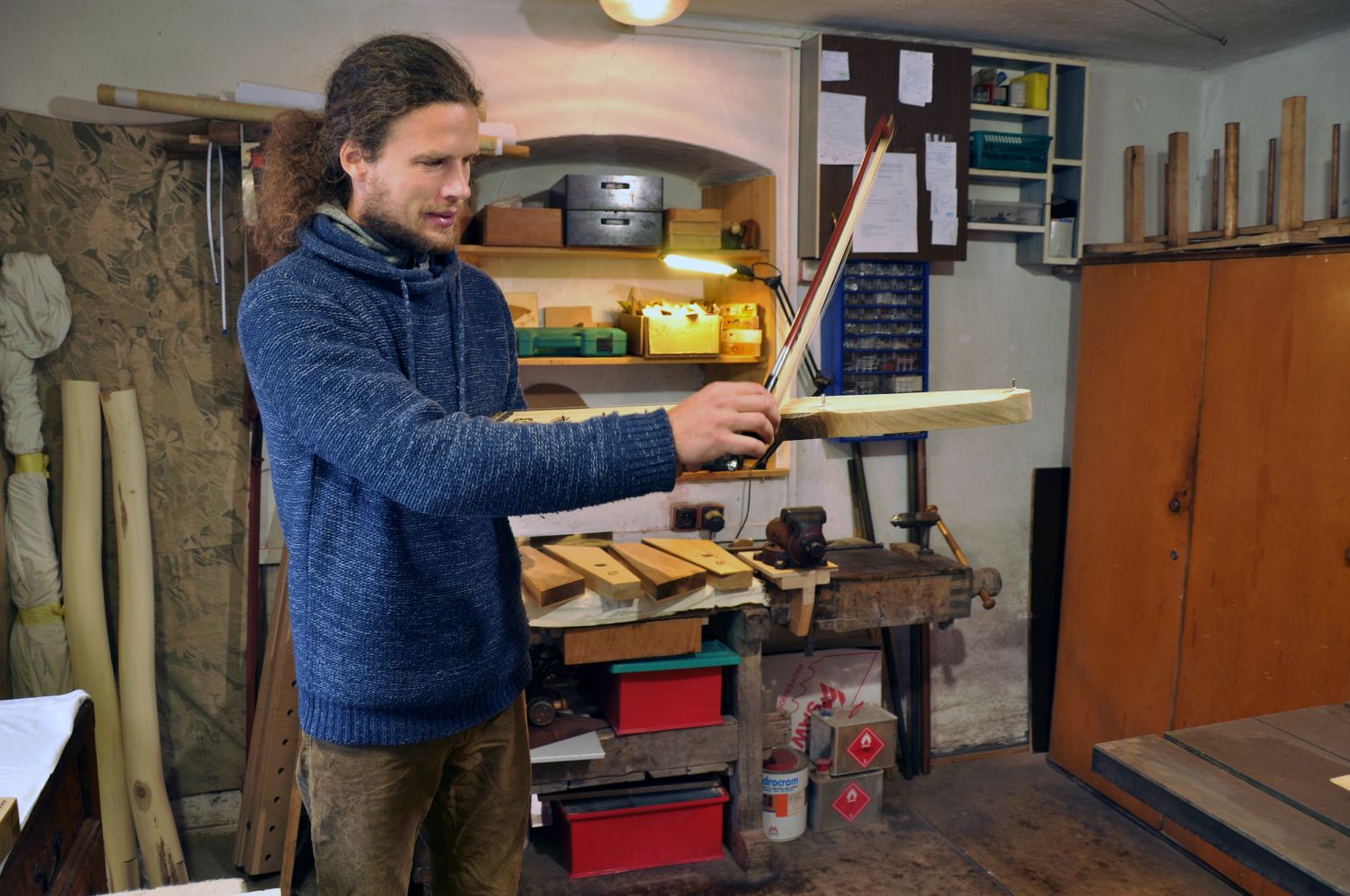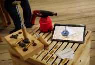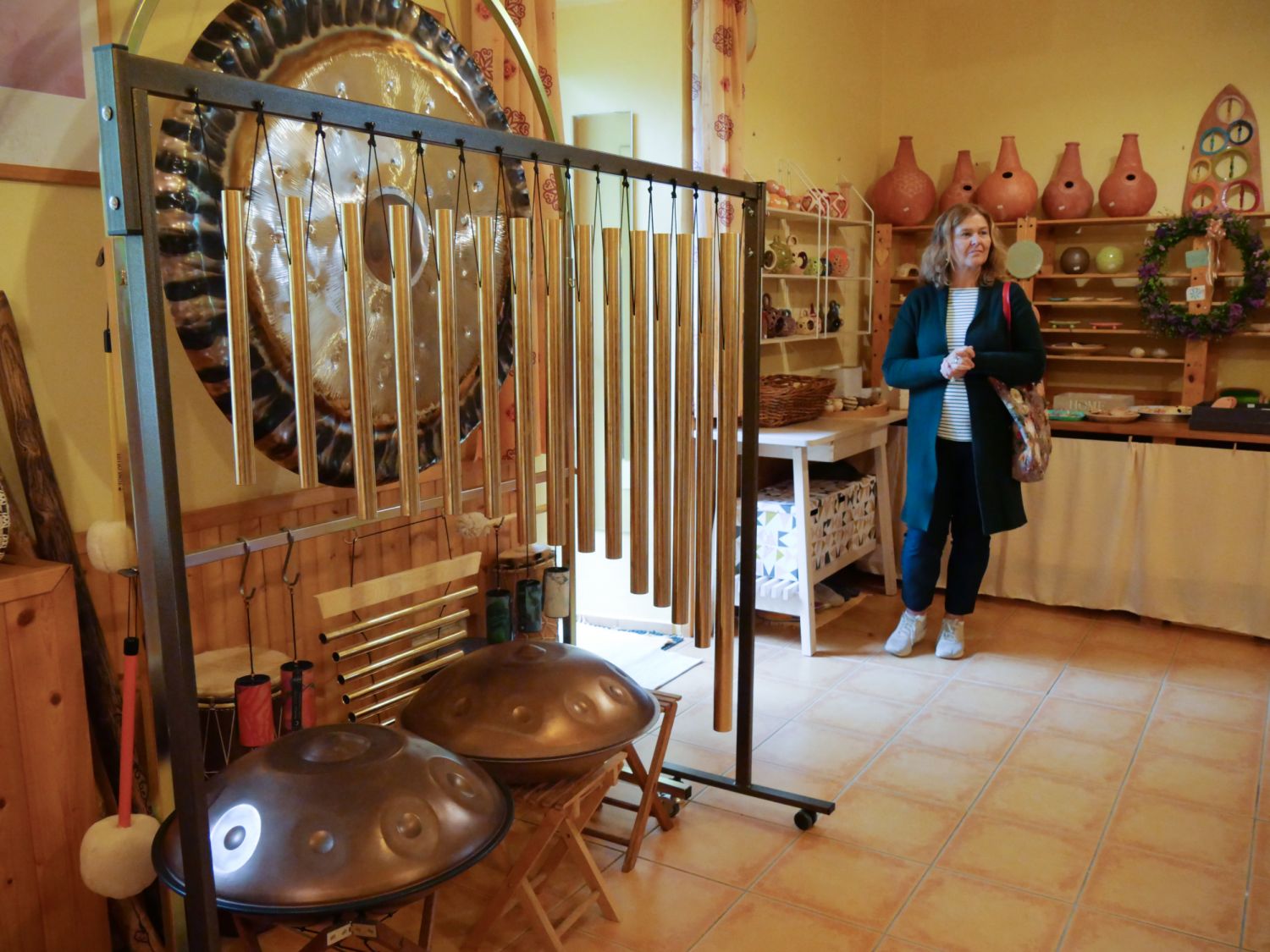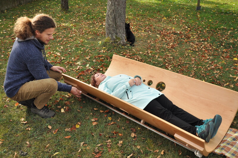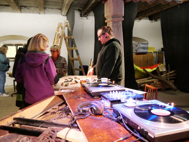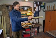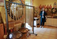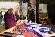 Tomáš Dufek otevřel návštěvníkům svou dílnu netradičních hudebních nástrojů v Dolních Radslavicích. K vidění i vyzkoušení byla třeba rezonanční kolébka z bukového dřeva, jichž vyrobil už patnáct. Využívají je zejména speciální školská zařízení, a to v rámci muzikoterapie. „Vyzkoušejte si její harmonické působení zvukem a vibracemi,“ vybídl umělec manželský pár, který do Radslavic dorazil až z Třebíče. Dílna hudebních nástrojů byla jejich první zastávkou. Krom kolébky si prohlédli kamennou harfu, watephone, žaltář či šamanské bubny, a také stroje a nástroje potřebné k jejich výrobě. Hned z Radslavic se chystali pokračovat i do otevřených ateliérů v Jupiter clubu a sýpce.