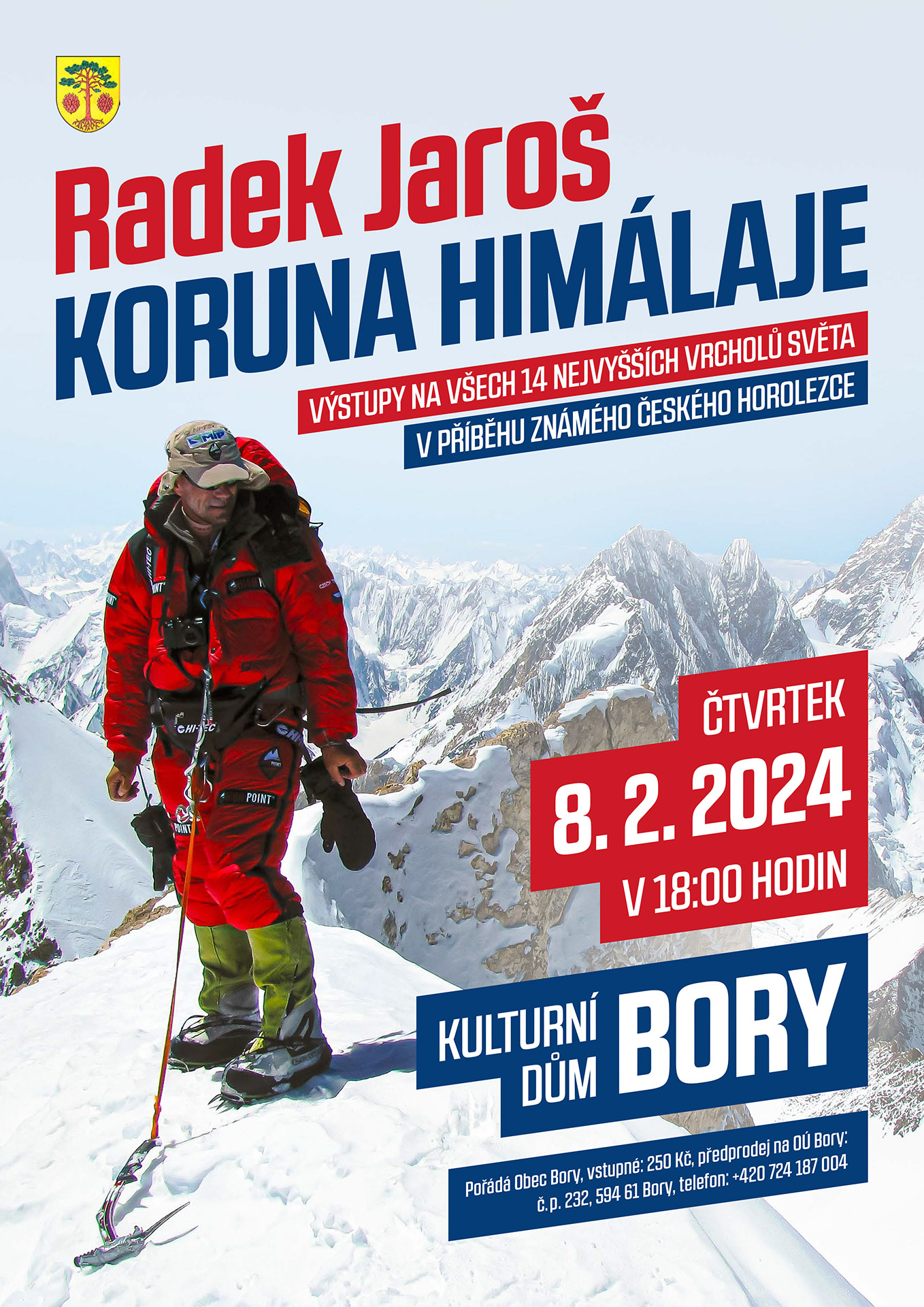 První Čech, který vystoupil na všech čtrnáct světových osmitisícovek bez použití kyslíku, ve čtvrtek 8. února od 18 hodin přijede přednášet do Borů. Vstupenky v ceně 250 korun seženete na obecním úřadě.
