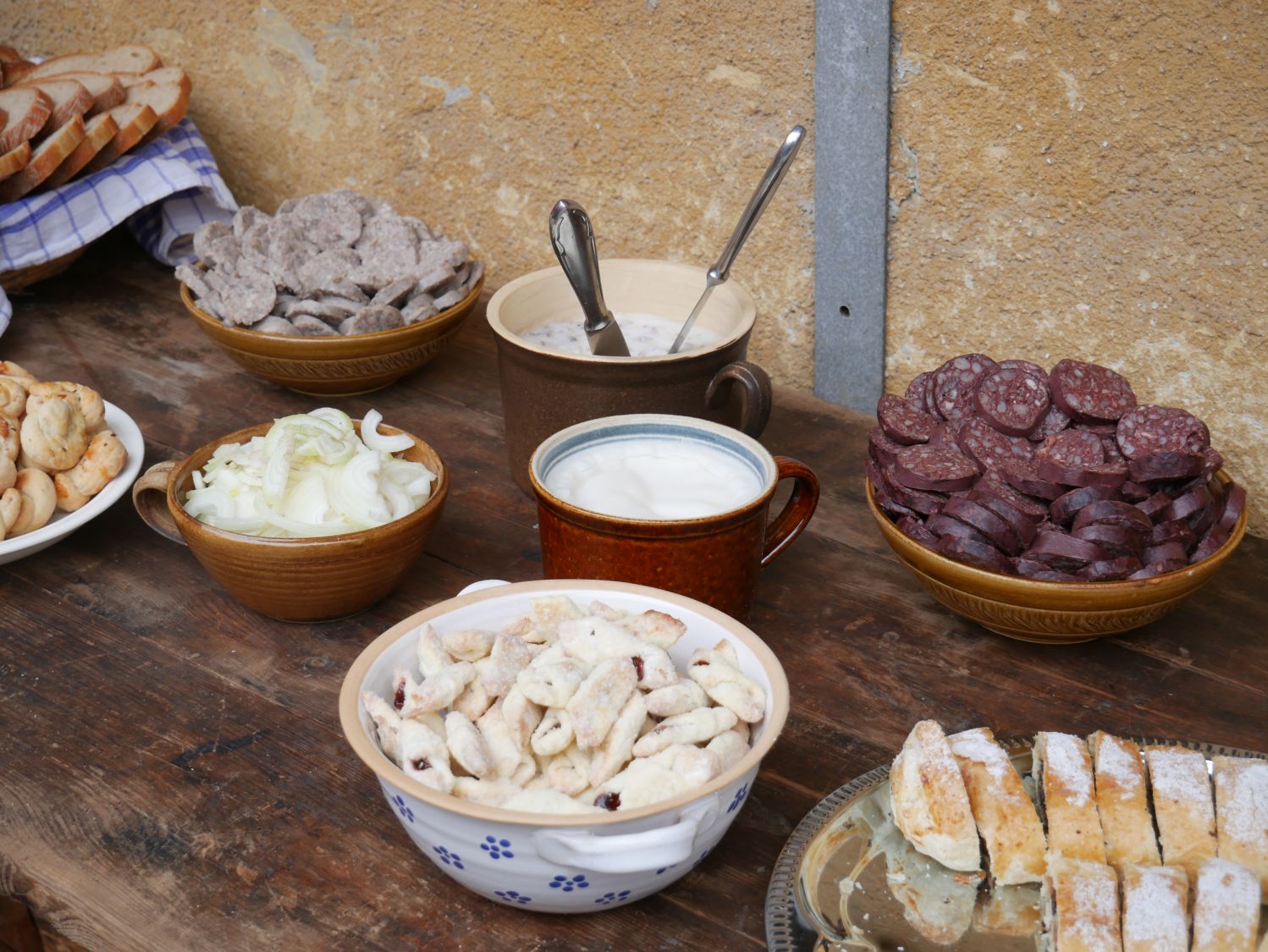 Paní katová provedla návštěvníky po stylově zařízené katovské zahradě a přitom zajímavě a poutavě povídala především o jídle, a že těch znalostí měla přehršel. Katovský jazýček v těch starých dobách patřil asi mezi ty vytříbené. Však to taky na stole před katovnou bylo vidět – jelítka, jitrničky, různé sladkosti a spousta další vybraných lahůdek. Sliny se jen sbíhaly. A vše se dalo zapít lahodnými moky nejrůznějších druhů.