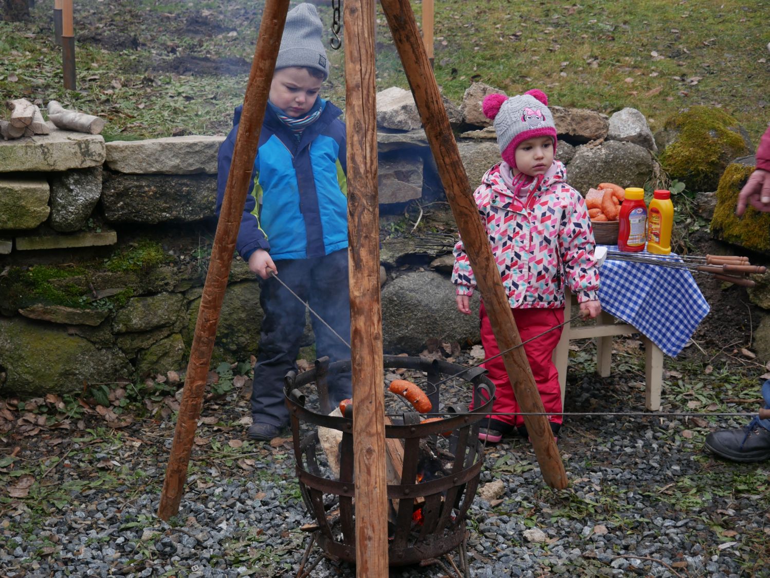 Oheň hořel i venku a kdo měl zájem, mohl si nad plameny opéct špekáček. Takhle v lednu je to opravdu zážitek.