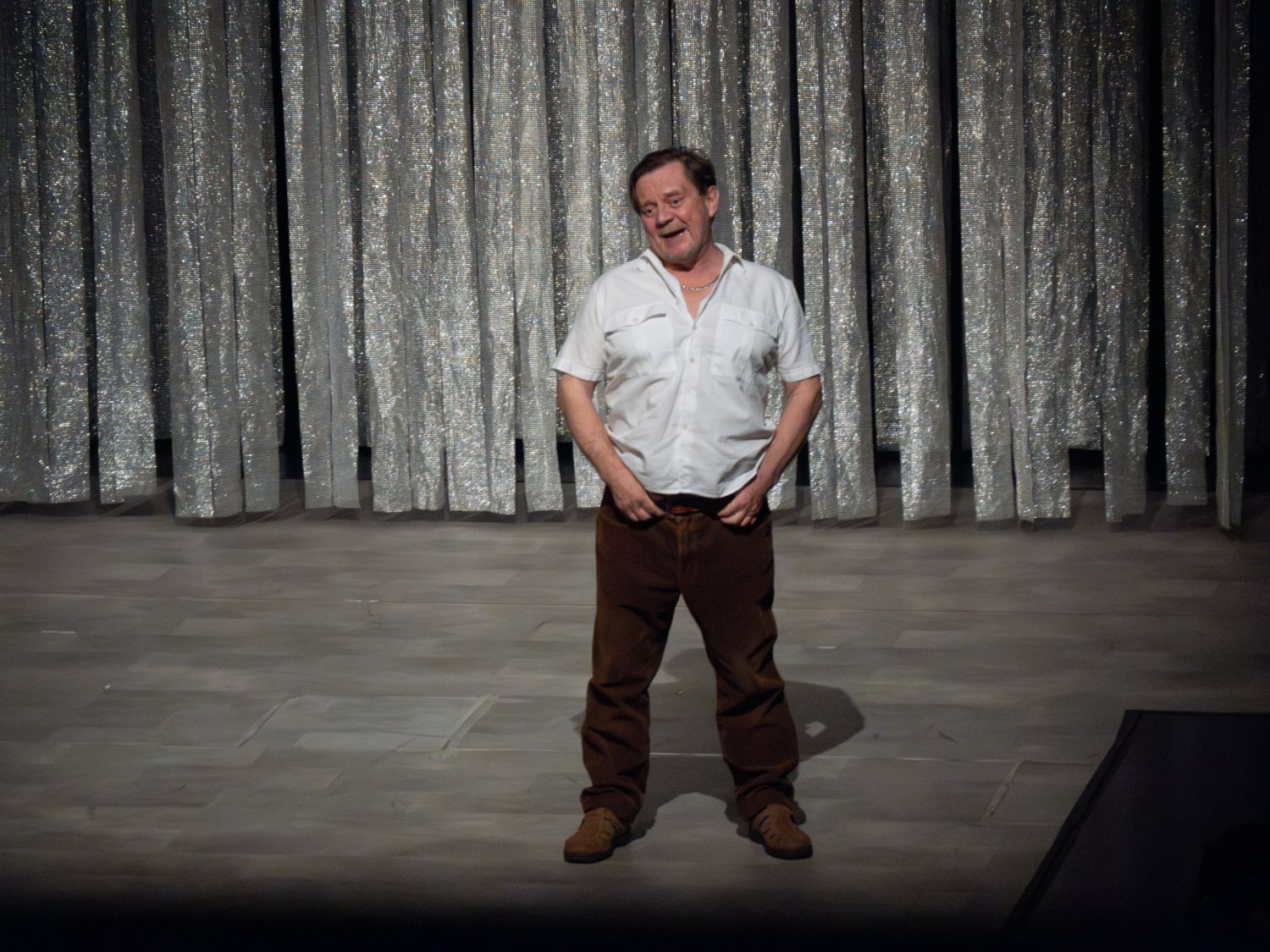Ve středečním divadelním představení s názvem Discoland přebývaly vulgarismy, nechybělo zapojení hlediště do děje. Zavzpomínalo se i na Karla Gotta, Michala Davida či Martina Dejdara. Řeč se točila kolem sexu, drog, ale i jednotlivých nevšedních zážitků zaměstnanců již zmíněného Discolandu, který vlastnil Ivan Jonák.