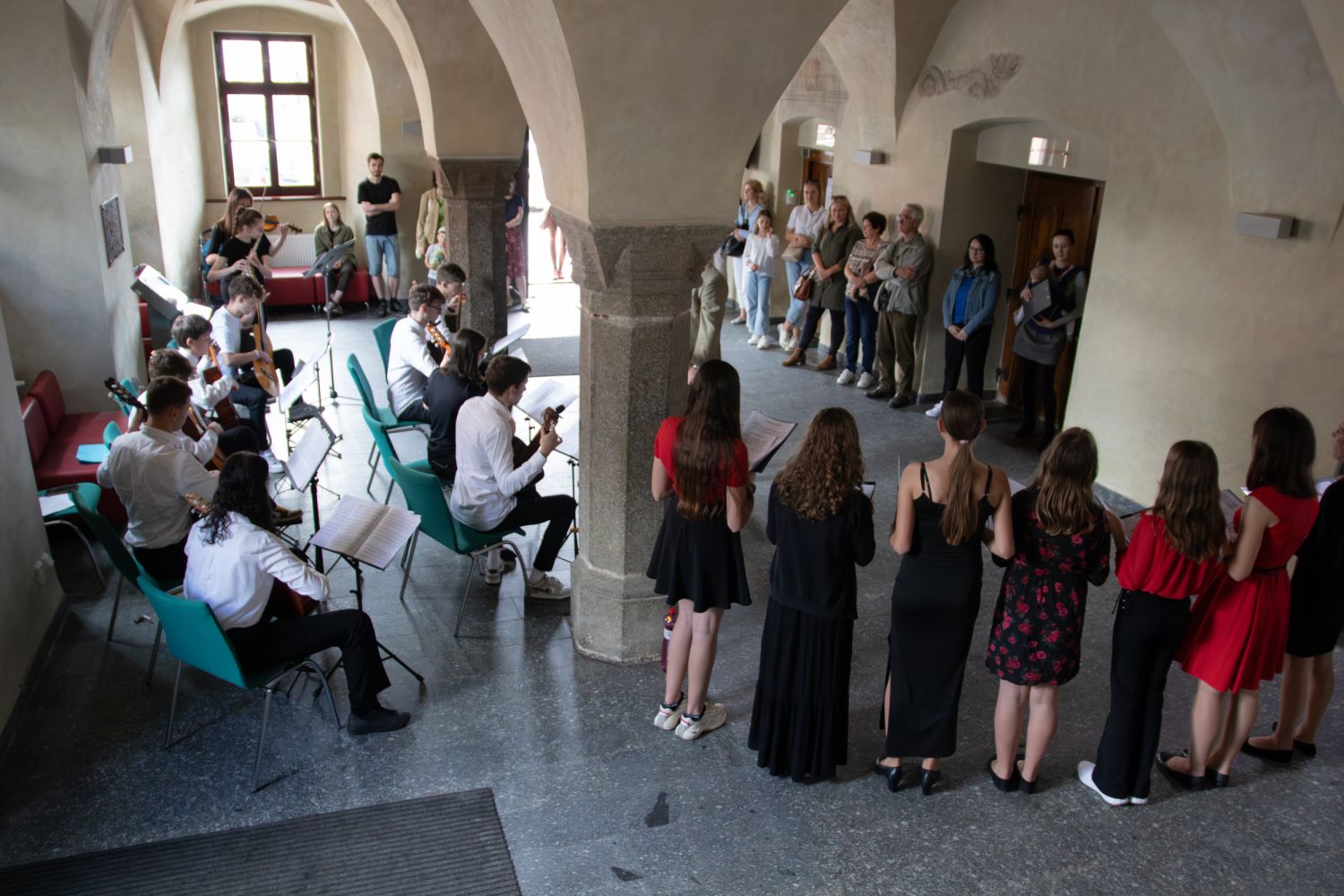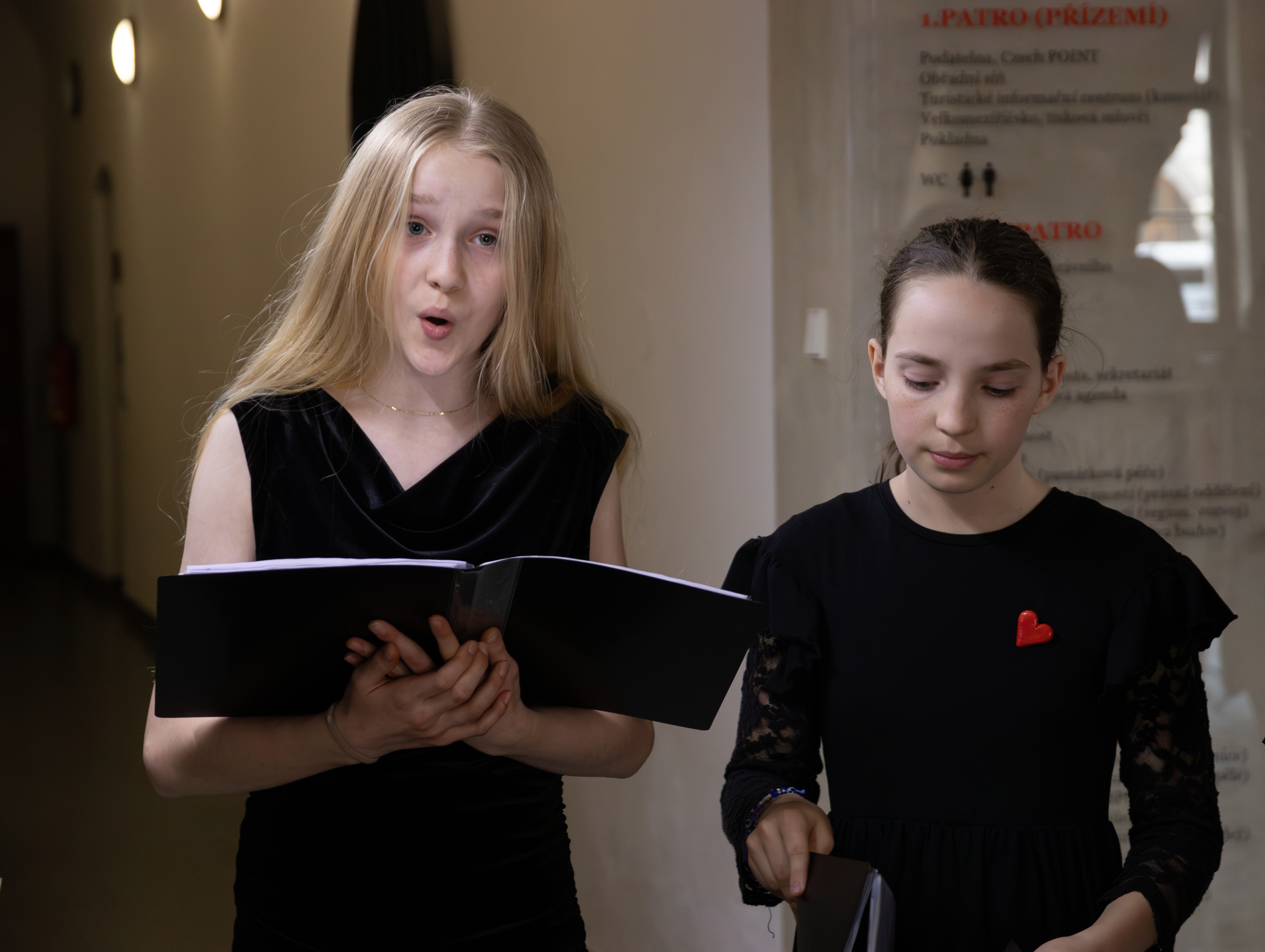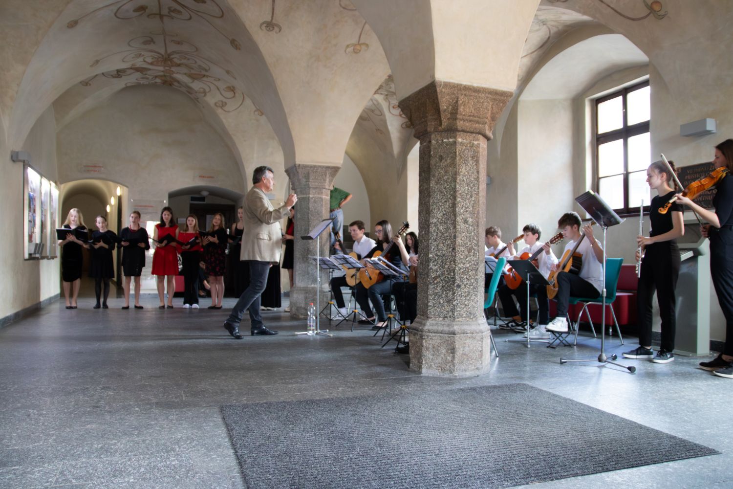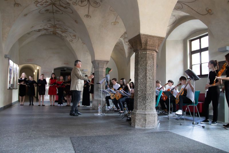 Žáci umělecké školy vystoupili ve vestibulu radnice, v průchodu Svitu, před i za budovou jejich školy.