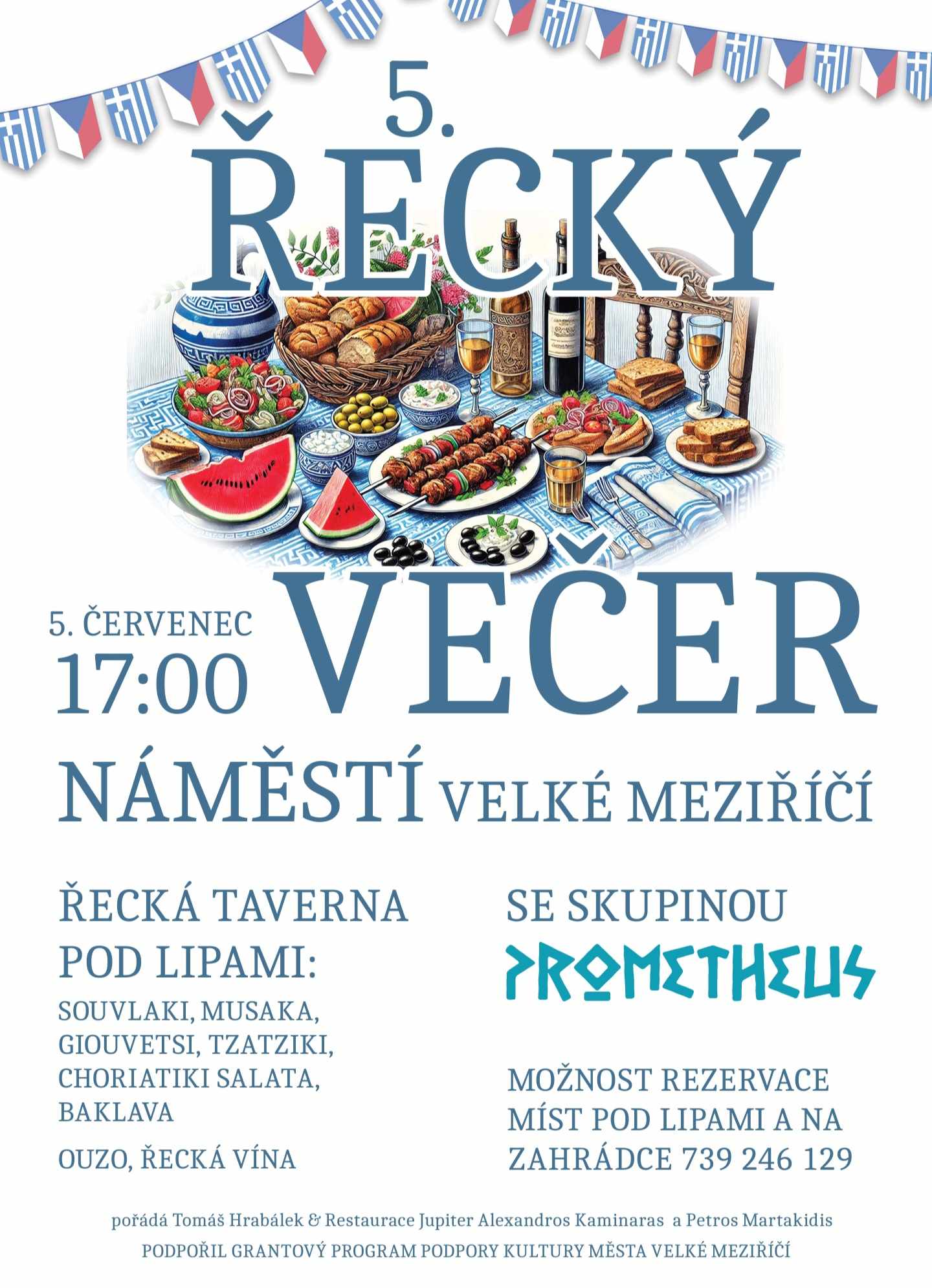 Využijte svátečního volna a zavítejte večer v pátek 5. července na velkomeziříčské náměstí a ochutnejte řecké speciality. Těšit se můžete například na souvlaki, musaku, tzatziki, baklavu či pravá řecká vína, chybět nebudou samozřejmě ani olivy. K tanci i poslechu zahraje skupina Prometheus.