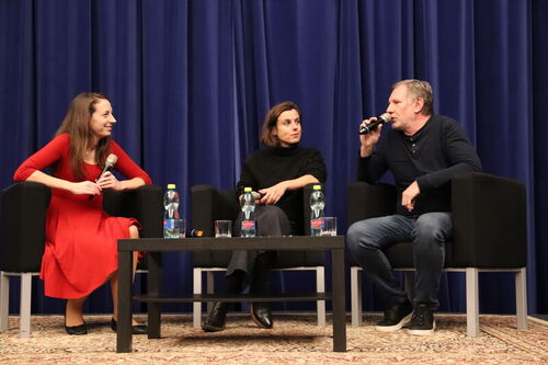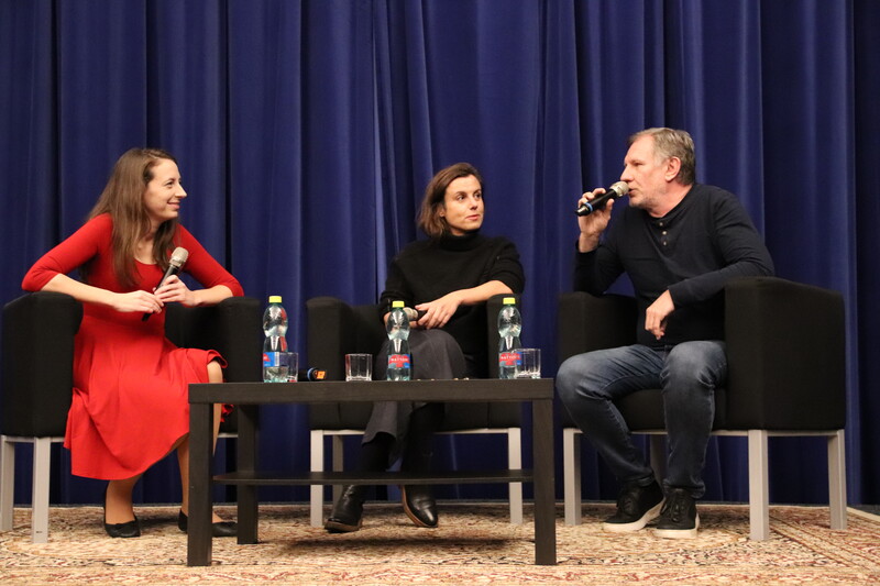 Lidé se režisérky ptali na práci s herci, zejména s malou protagonistkou Miou Bankó, i na práci s kočkou, která jí ve Světýlkách dělá blízkou parťačku, na přípravu, natáčení exteriérů, kolik stránek má scénář a zda neplánuje někdy obsadit do svého filmu sebe samu, podobně jako Quentin Tarantino. „Já bohatě si vystačím za kamerou. A Martin už má naší rodiny, myslím, dost,“ odpověděla autorka a herec ze všech jejích tří filmů i divadelní hry dodal: „To je výborný nápad! Už tu bylo všechno, rodina, dítě i zvíře, tak si říkám co dál.“ Na něj konkrétně mířily otázky, jak se mu s Miou spolupracovalo, jaká je jeho dětská vzpomínka a na oba pak na čem aktuálně pracují a na co by zájemce pozvali. „Přijďte do Činoherního klubu, ten je pro nás oba srdeční záležitost,“ shodli se Beata s Martinem.