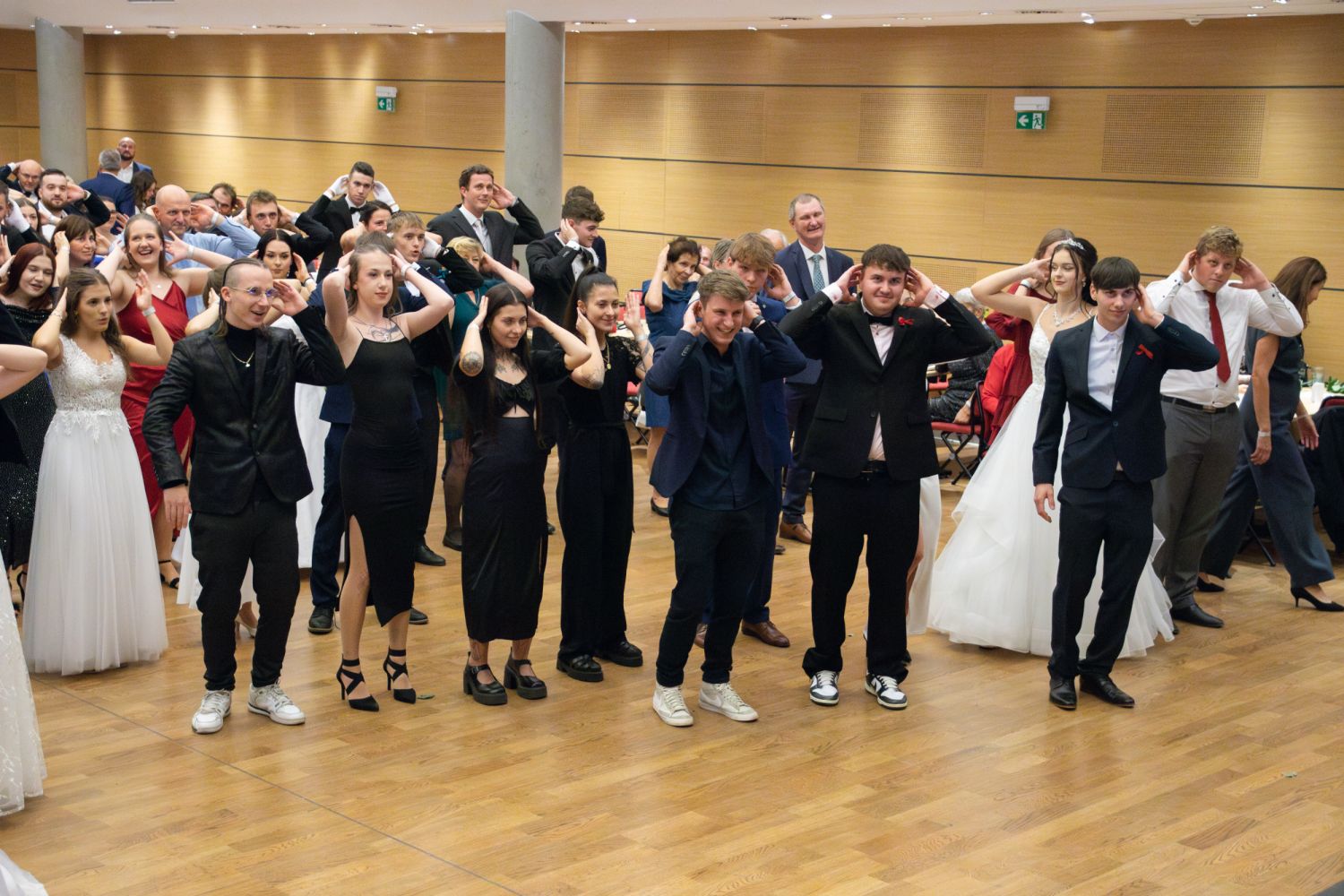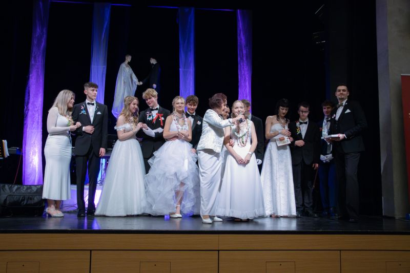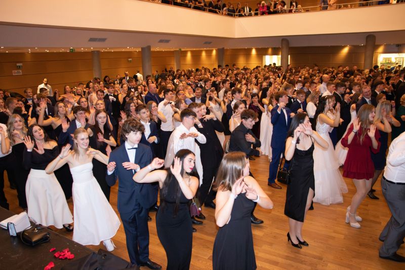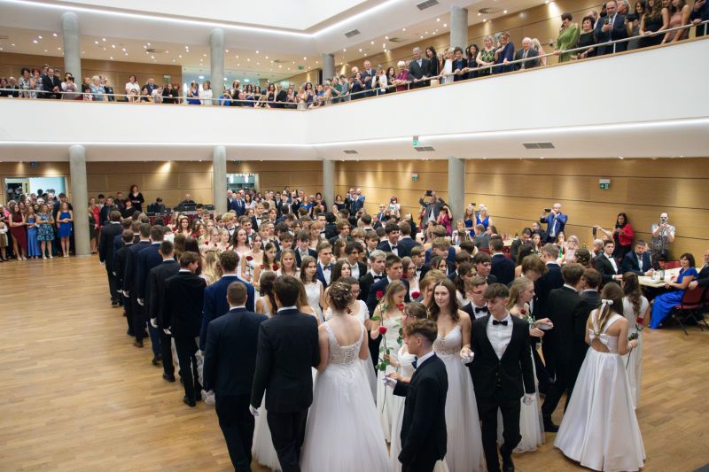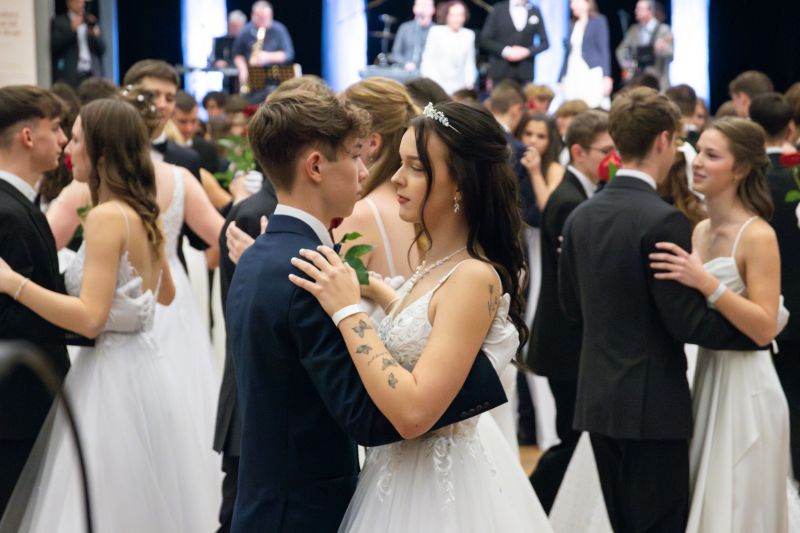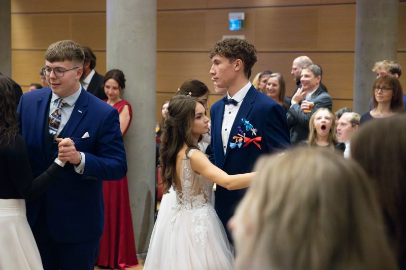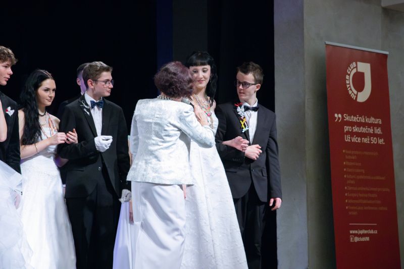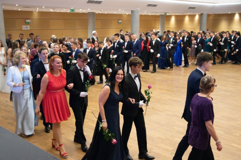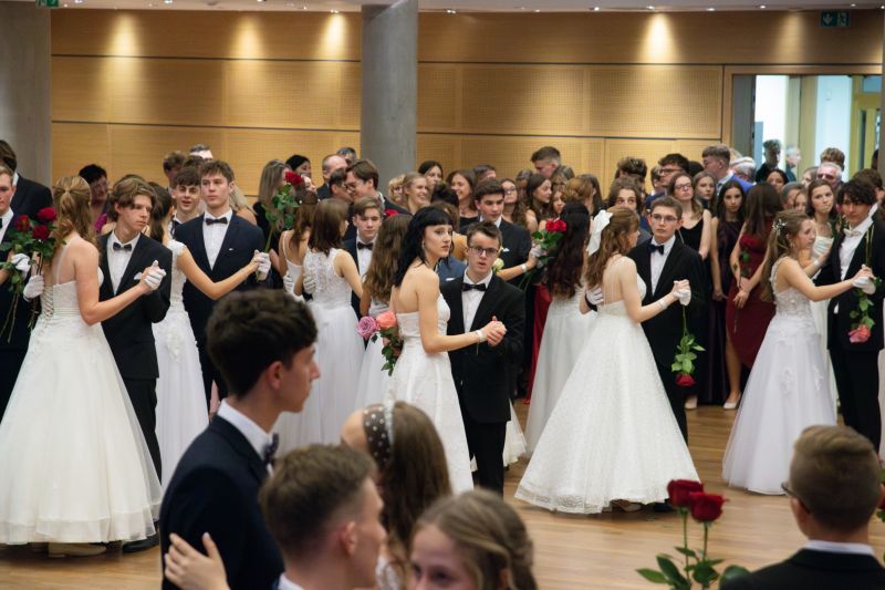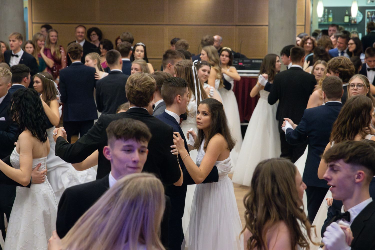 Ve velkém sále se kolem tři čtvrtě na sedm začalo do závěsu štosovat přes 100 tanečnic a tanečníků. Přehlídku nacvičených tanců zahájila polonéza, kterou žáci na posledním kurzu před plesem trénovali. Následovaly ty ostatní, k vidění tak byl jive, čača, waltz, polka a podobně.