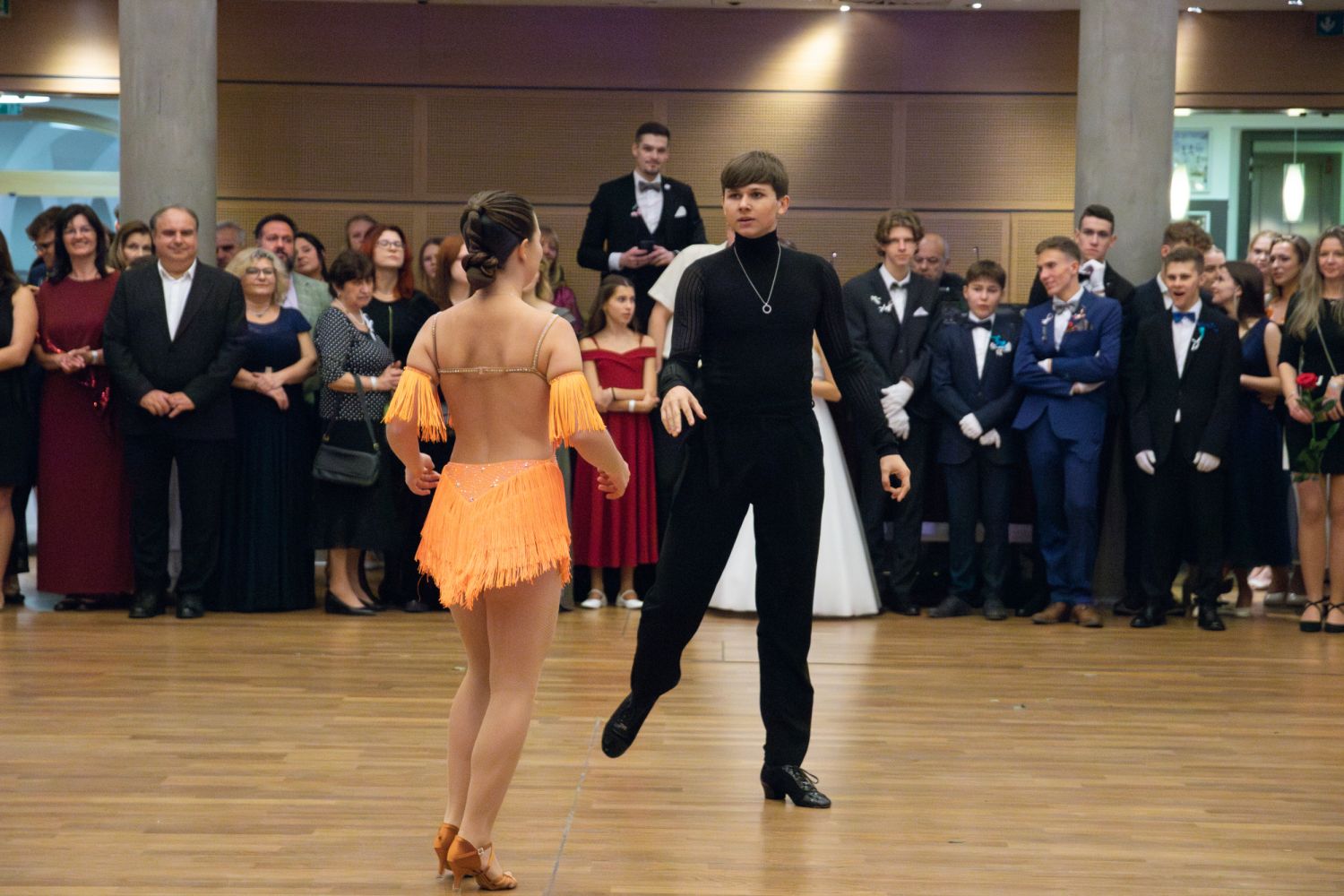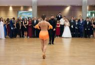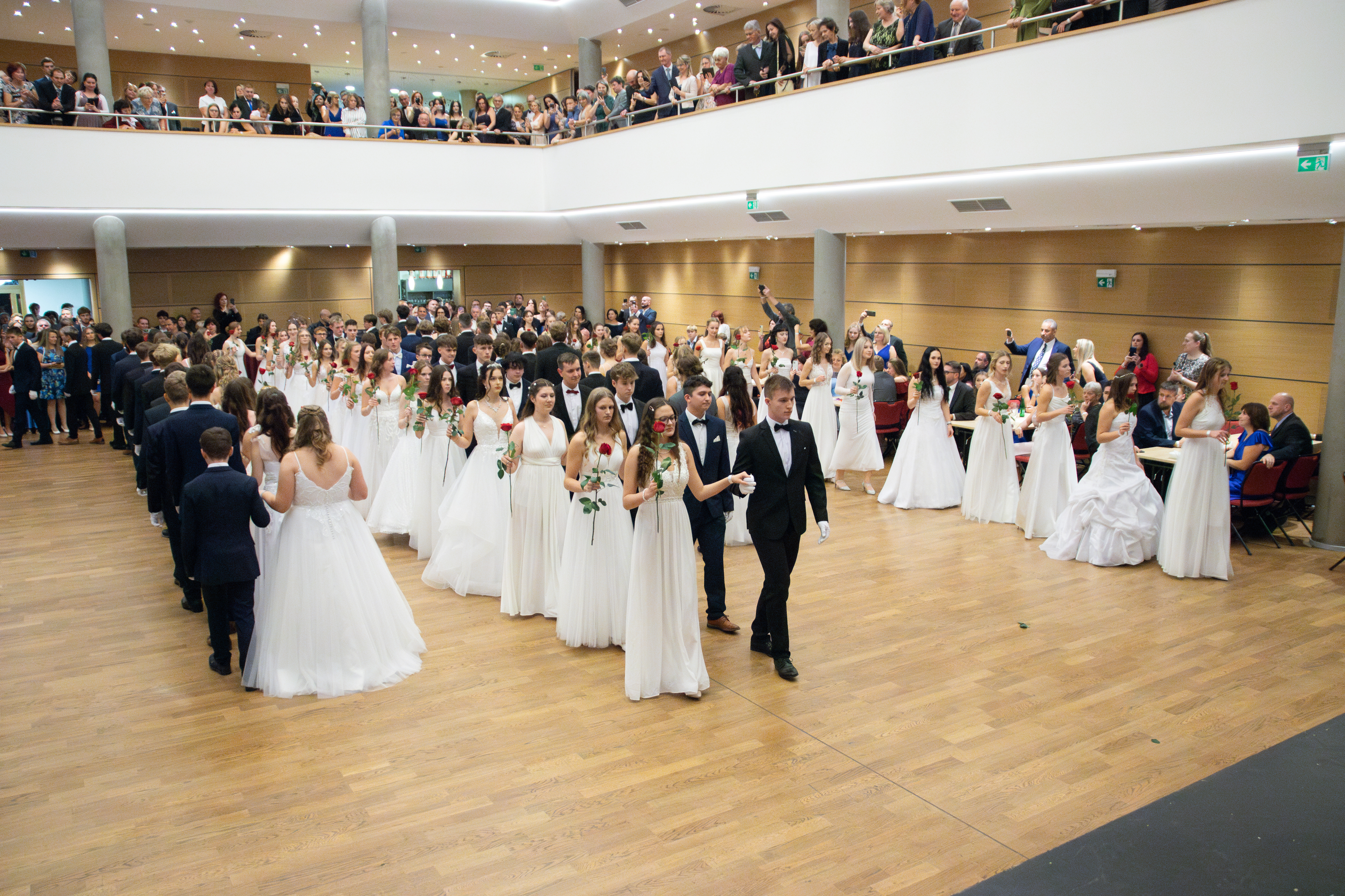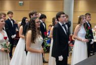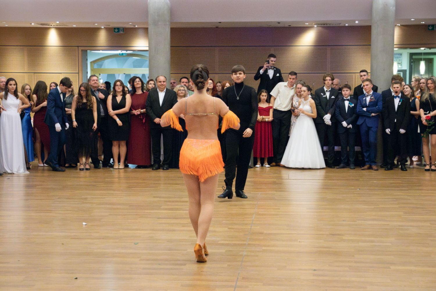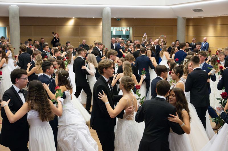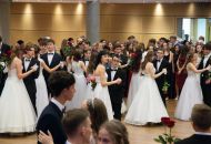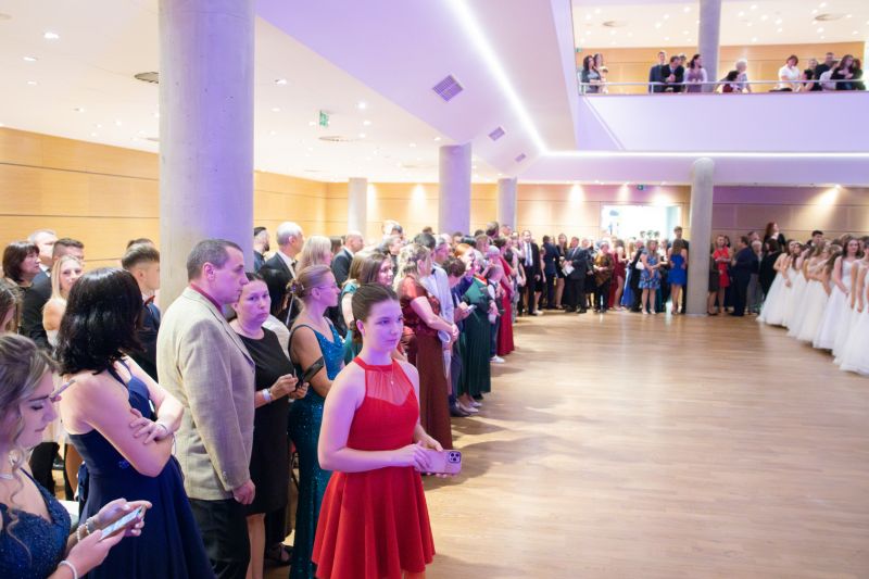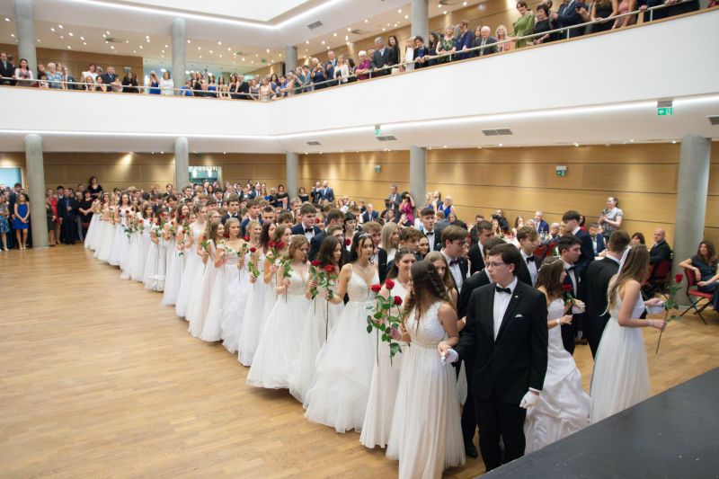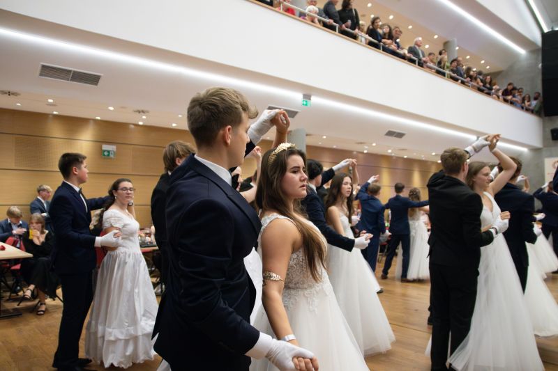 Ve velkém sále se kolem tři čtvrtě na sedm začalo do závěsu štosovat přes 100 tanečnic a tanečníků. Přehlídku nacvičených tanců zahájila polonéza, kterou žáci na posledním kurzu před plesem trénovali. Následovaly ty ostatní, k vidění tak byl jive, čača, waltz, polka a podobně.