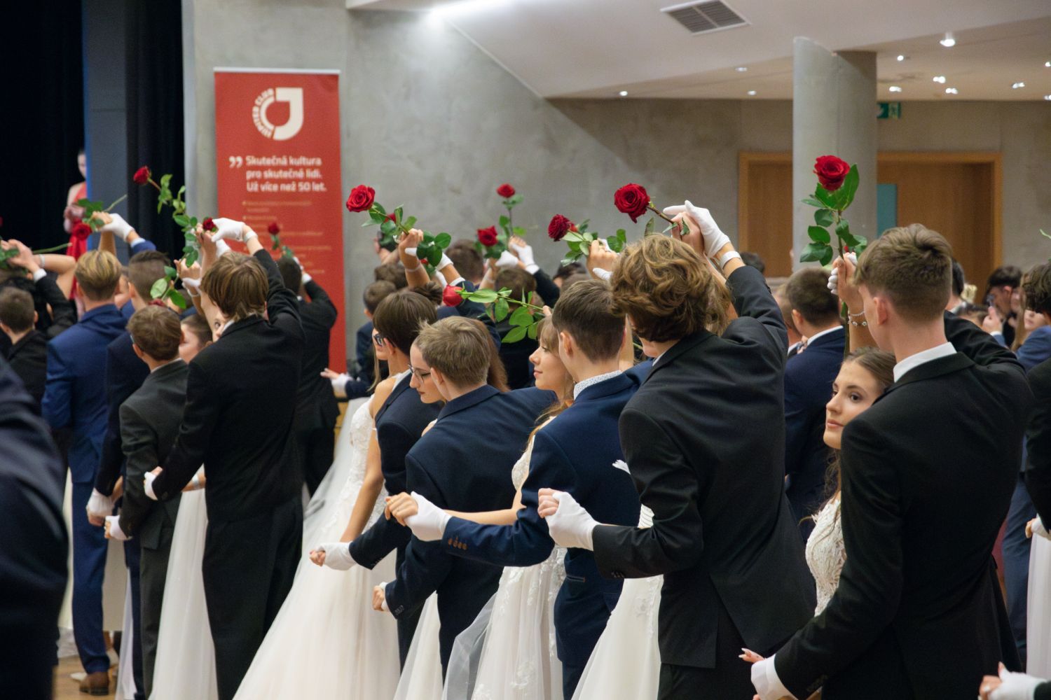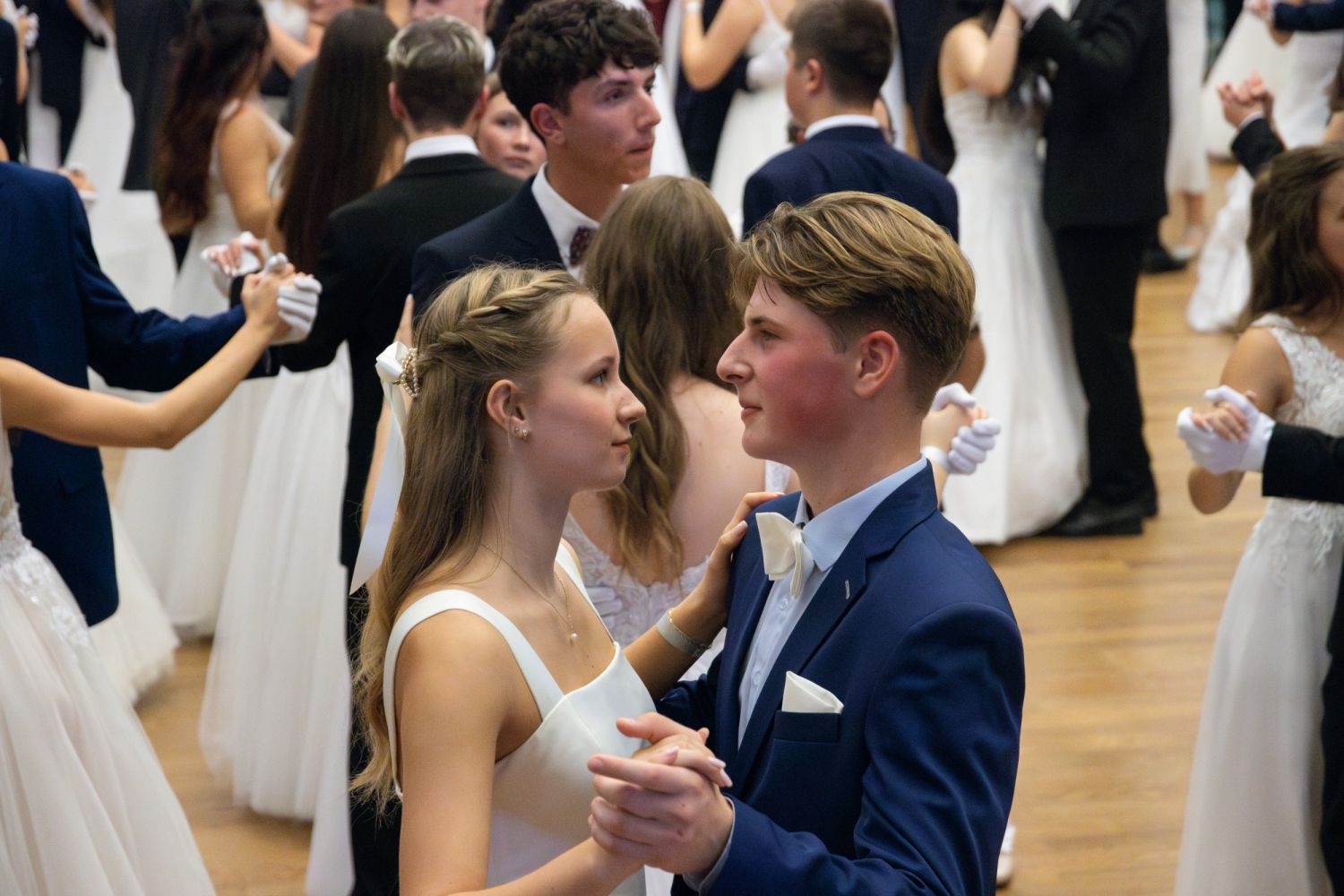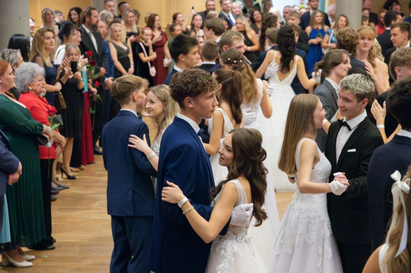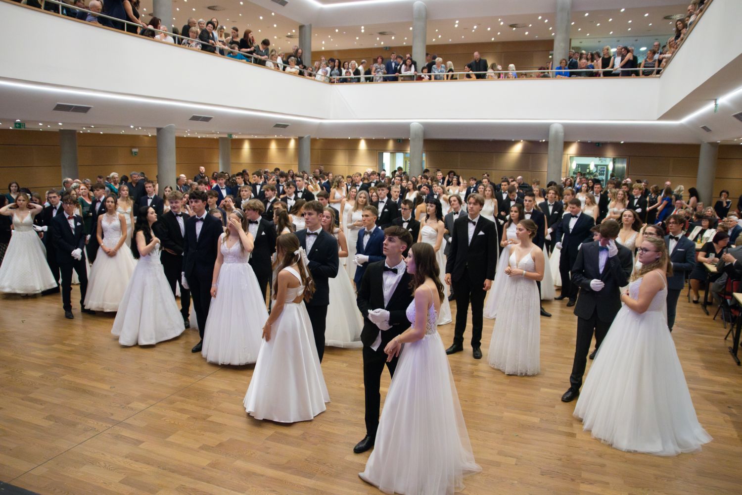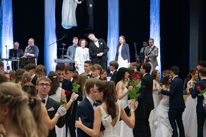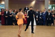 Ve velkém sále se kolem tři čtvrtě na sedm začalo do závěsu štosovat přes 100 tanečnic a tanečníků. Přehlídku nacvičených tanců zahájila polonéza, kterou žáci na posledním kurzu před plesem trénovali. Následovaly ty ostatní, k vidění tak byl jive, čača, waltz, polka a podobně.