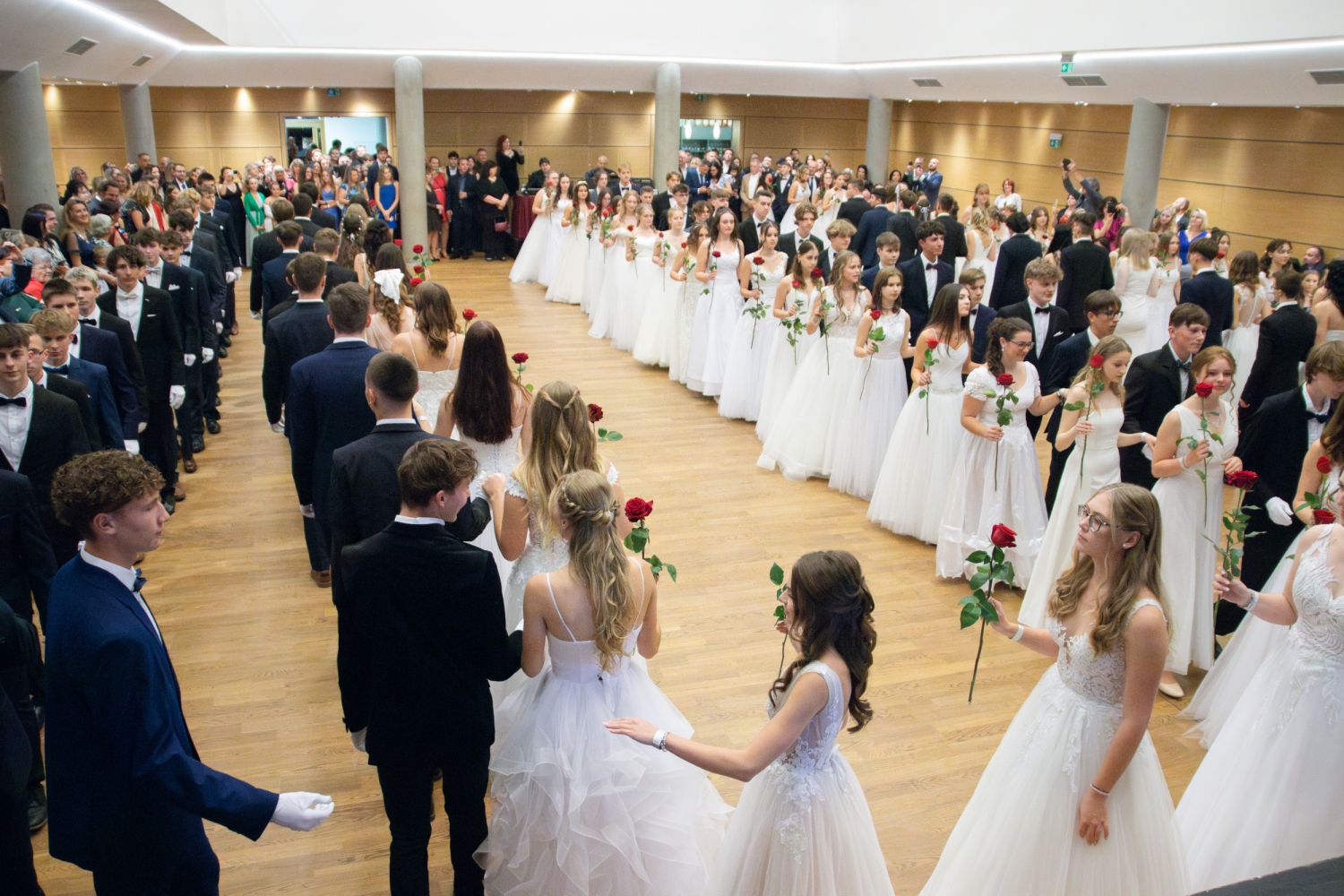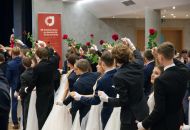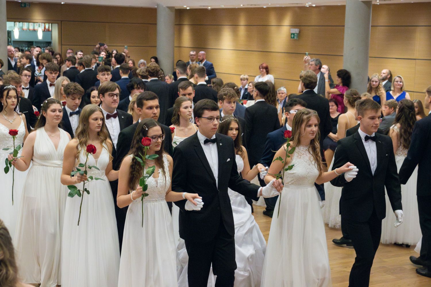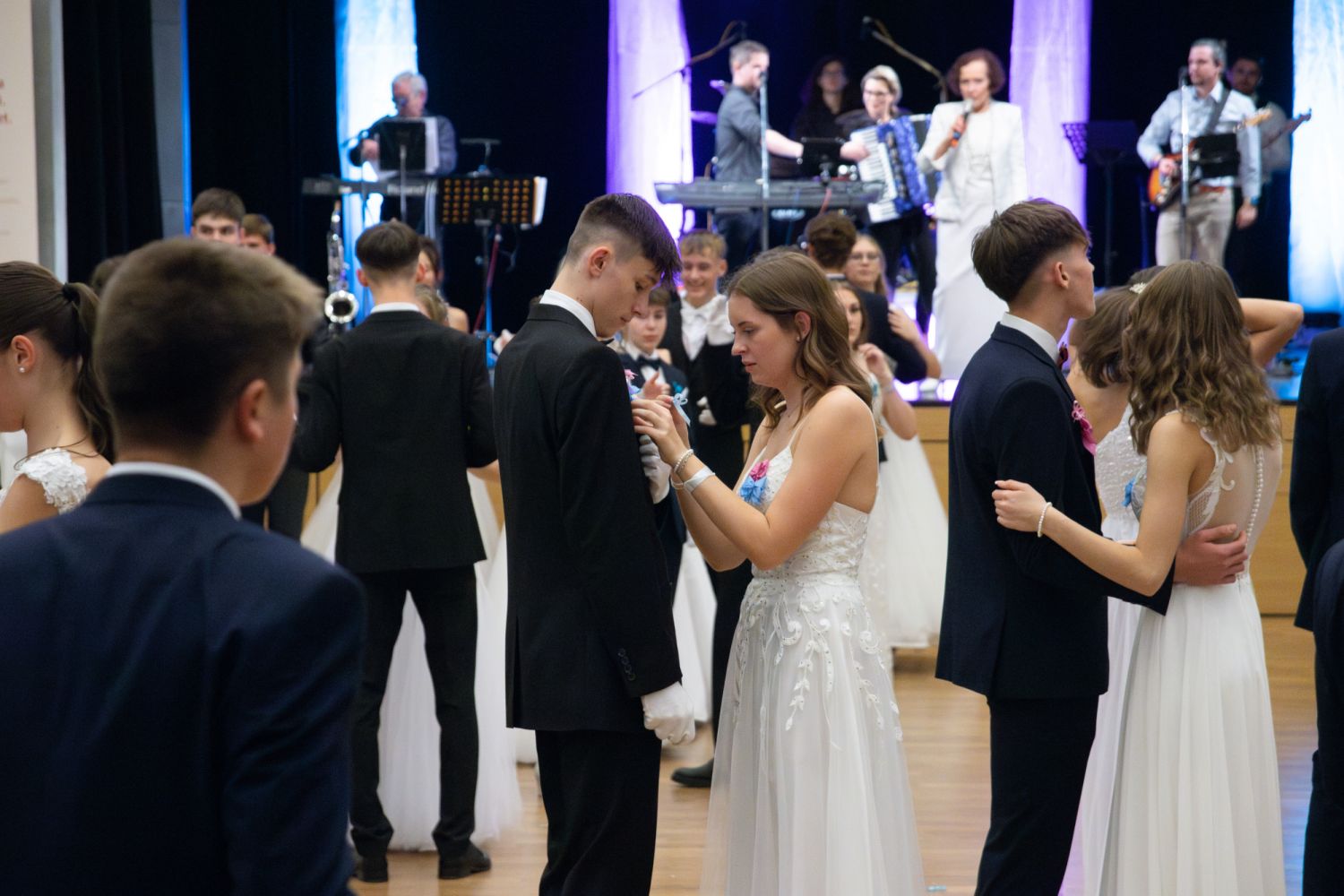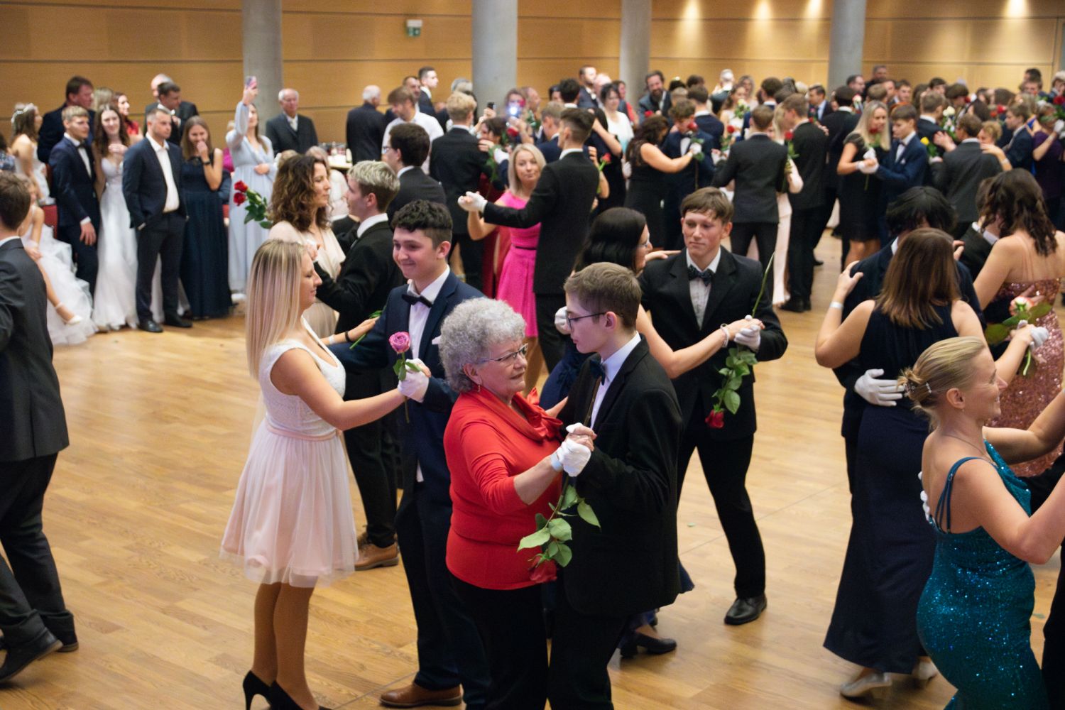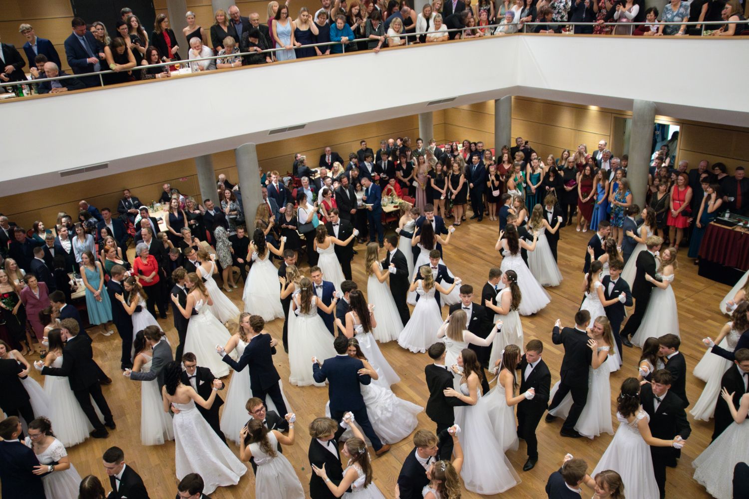 Ve velkém sále se kolem tři čtvrtě na sedm začalo do závěsu štosovat přes 100 tanečnic a tanečníků. Přehlídku nacvičených tanců zahájila polonéza, kterou žáci na posledním kurzu před plesem trénovali. Následovaly ty ostatní, k vidění tak byl jive, čača, waltz, polka a podobně.