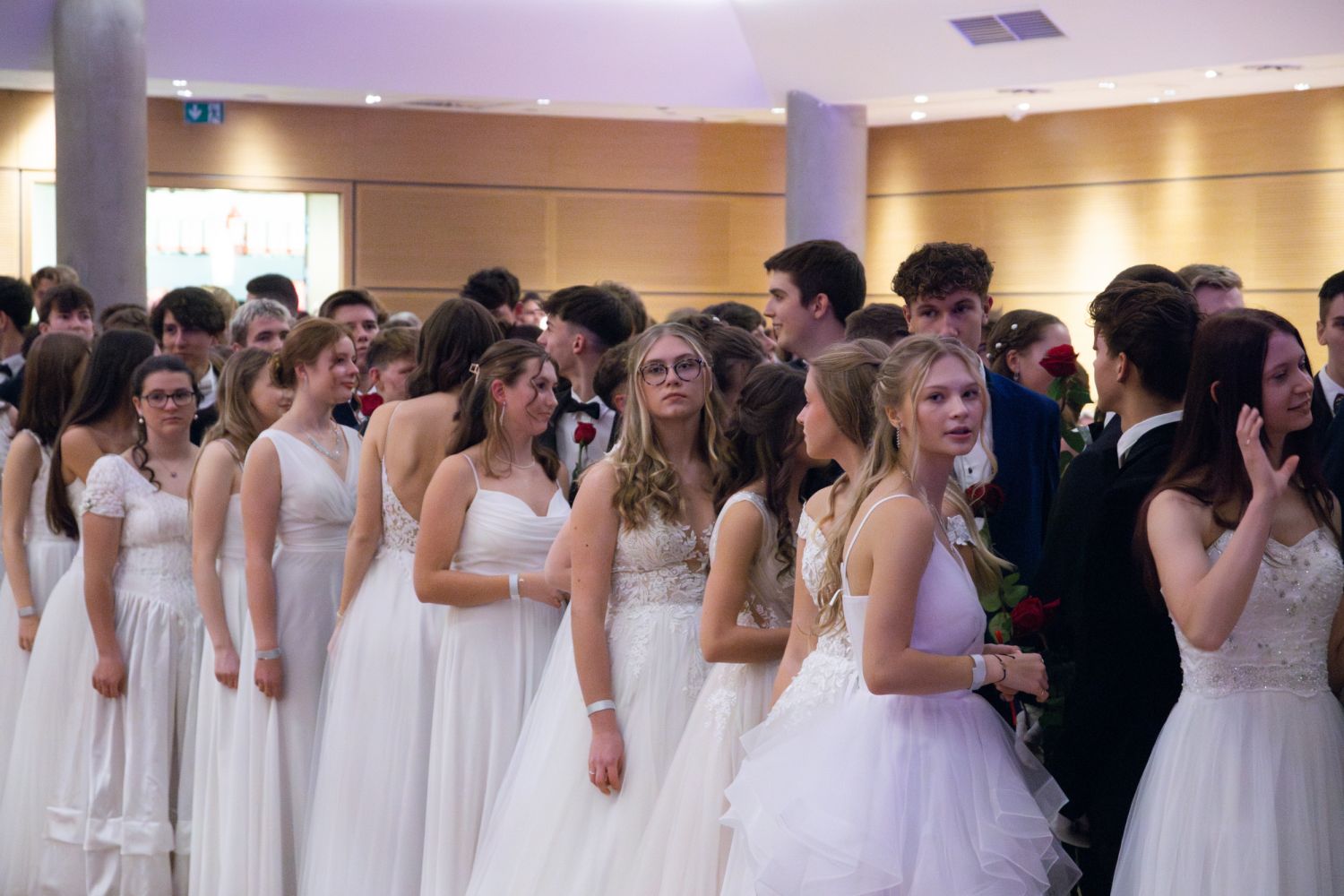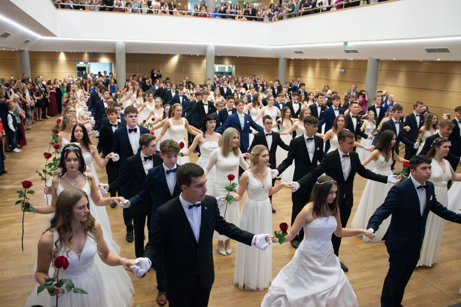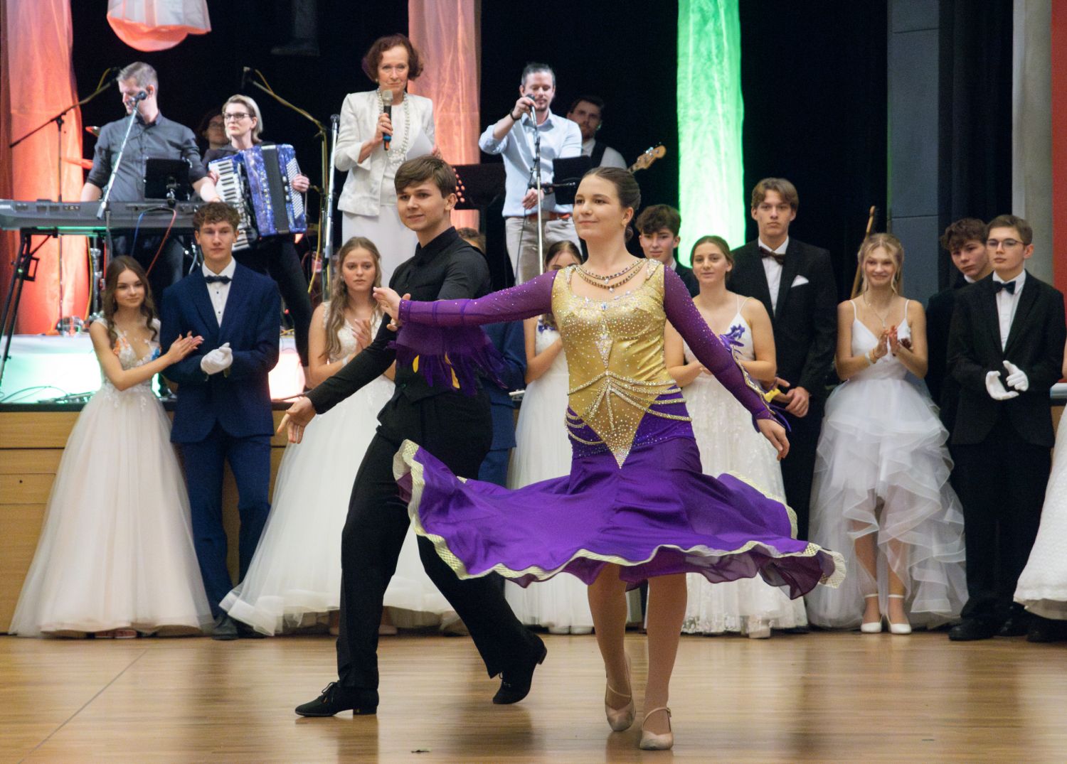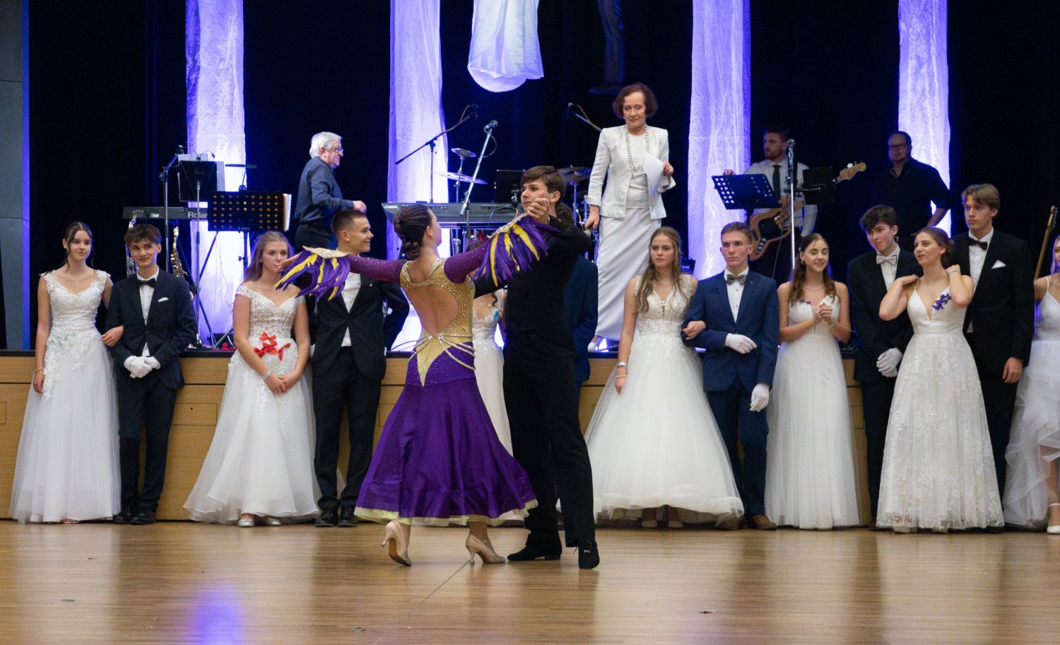 Ve velkém sále se kolem tři čtvrtě na sedm začalo do závěsu štosovat přes 100 tanečnic a tanečníků. Přehlídku nacvičených tanců zahájila polonéza, kterou žáci na posledním kurzu před plesem trénovali. Následovaly ty ostatní, k vidění tak byl jive, čača, waltz, polka a podobně.
