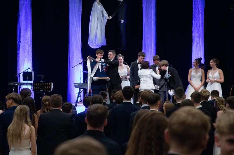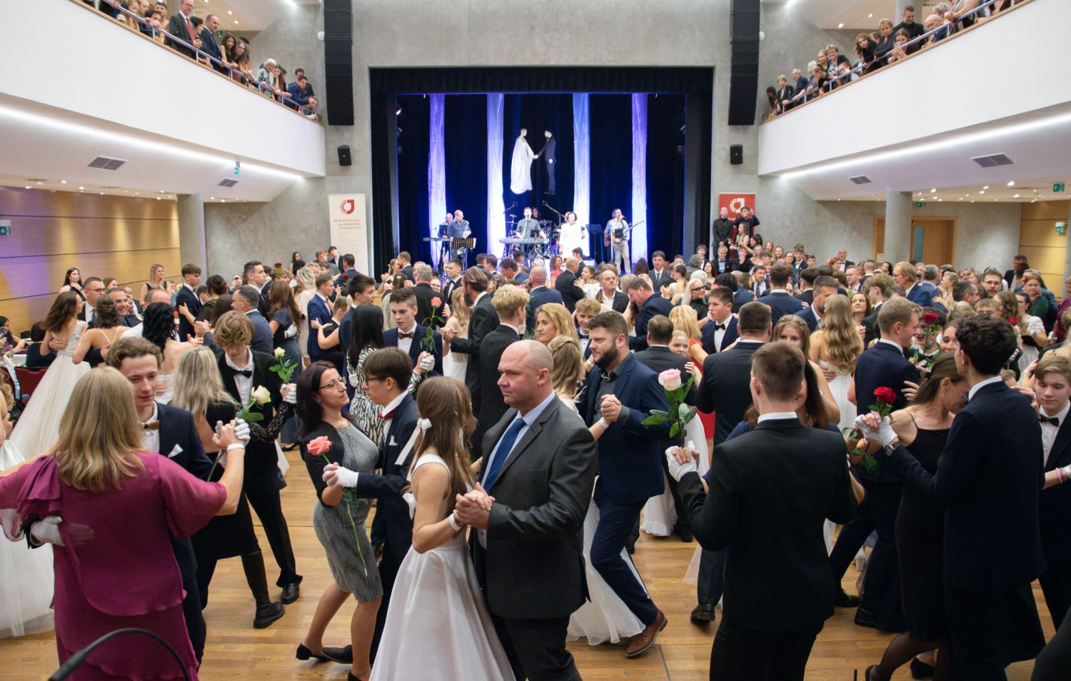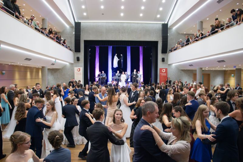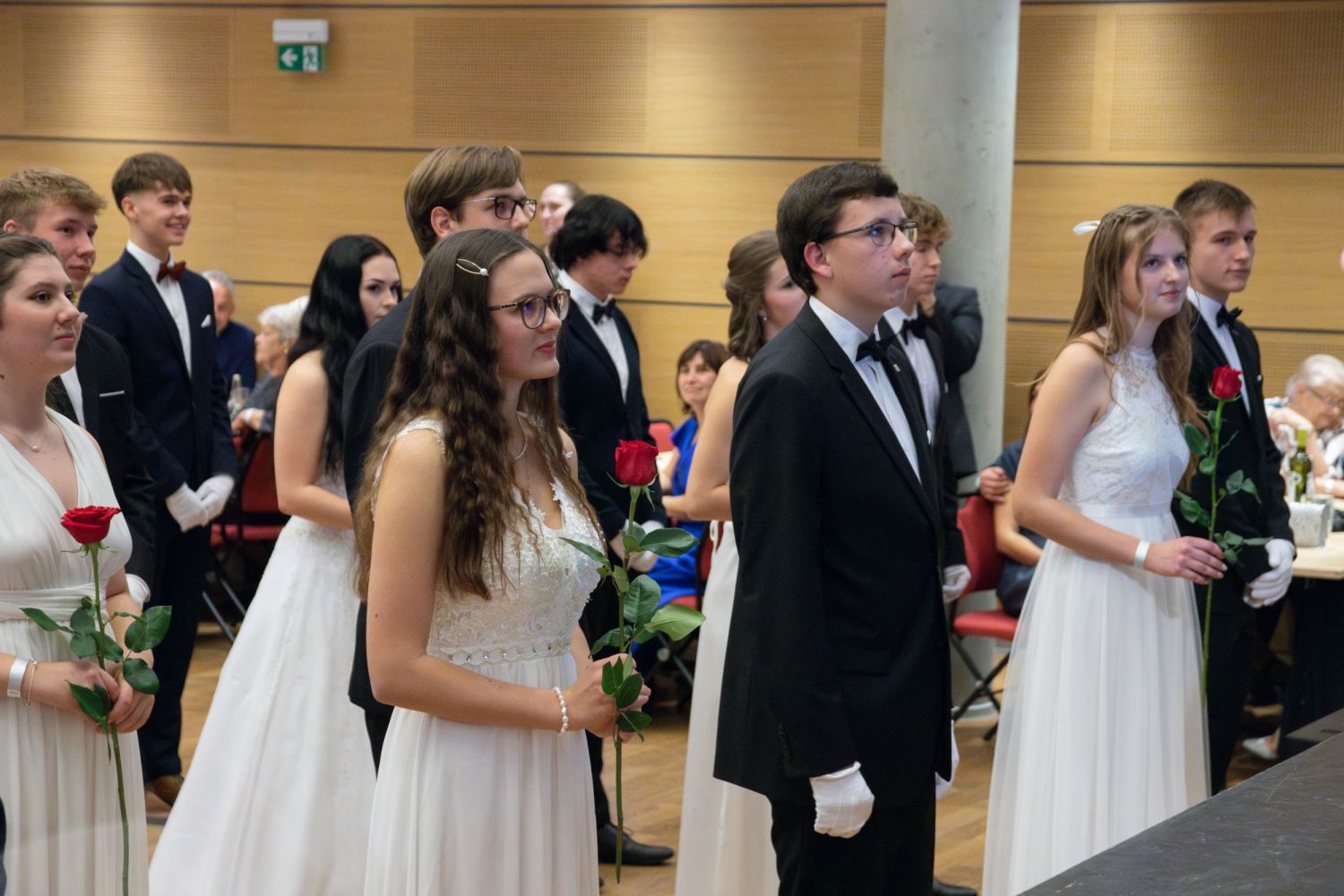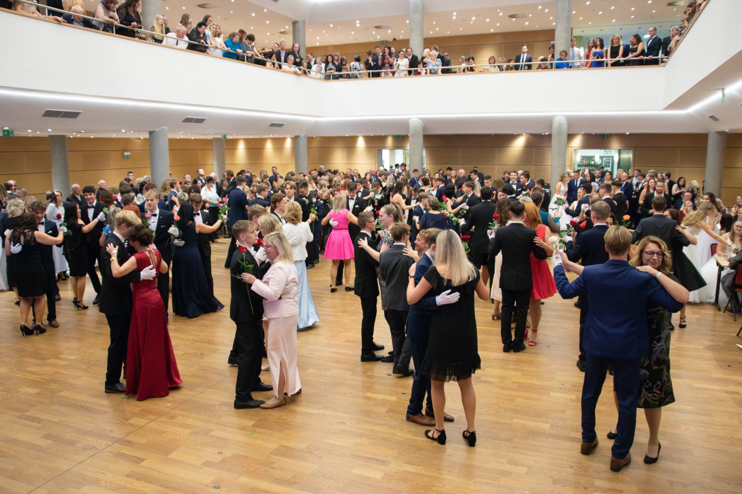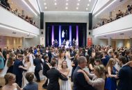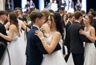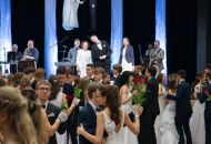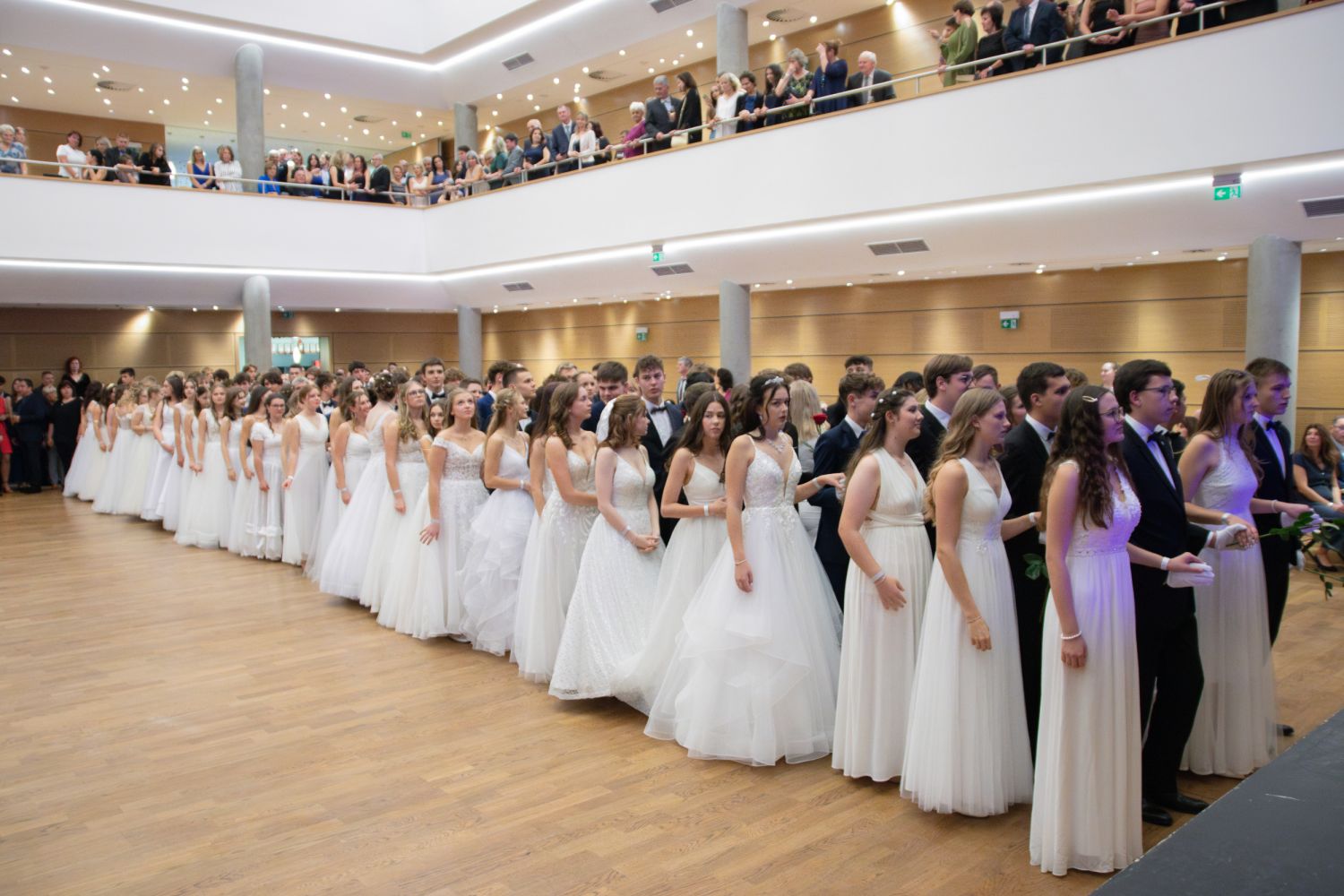 Ve velkém sále se kolem tři čtvrtě na sedm začalo do závěsu štosovat přes 100 tanečnic a tanečníků. Přehlídku nacvičených tanců zahájila polonéza, kterou žáci na posledním kurzu před plesem trénovali. Následovaly ty ostatní, k vidění tak byl jive, čača, waltz, polka a podobně.