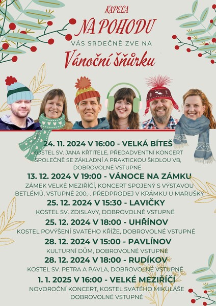 Kapela Na pohodu chystá šňůru zimních koncertů. Odehrají se na velkomeziříčském zámku, ve Velké Bíteši, Lavičkách, Uhřínově, Pavlínově, Rudíkově a poslední v kostele sv. Mikuláše ve Velkém Meziříčí.