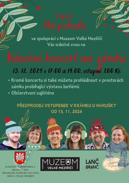 Podmanivé vánoční melodie, chutné občerstvení i výstava betlémů – to vše slibují připravované koncerty kapely Na pohodu, které se uskuteční 13. prosince v 17 a v 19 hodin na velkomeziříčském zámku. „Vybíráme si takové písně, aby hezky ladily v prostorách kostelů, kde vystupujeme obvykle. Koncert na zámku se nám letos podařilo uspořádat poprvé. Akce bude probíhat ve vnitřních prostorách a má poměrně omezenou kapacitu, abychom vytvořili co nejpříjemnější a osobní atmosféru,“ vysvětluje zpěvačka Aneta Kapčuková s tím, že lístky na 17. hodinu je možné zakoupit v Krámku u Marušky za 200 korun. Koncert v 19 hodin je vyprodaný.
