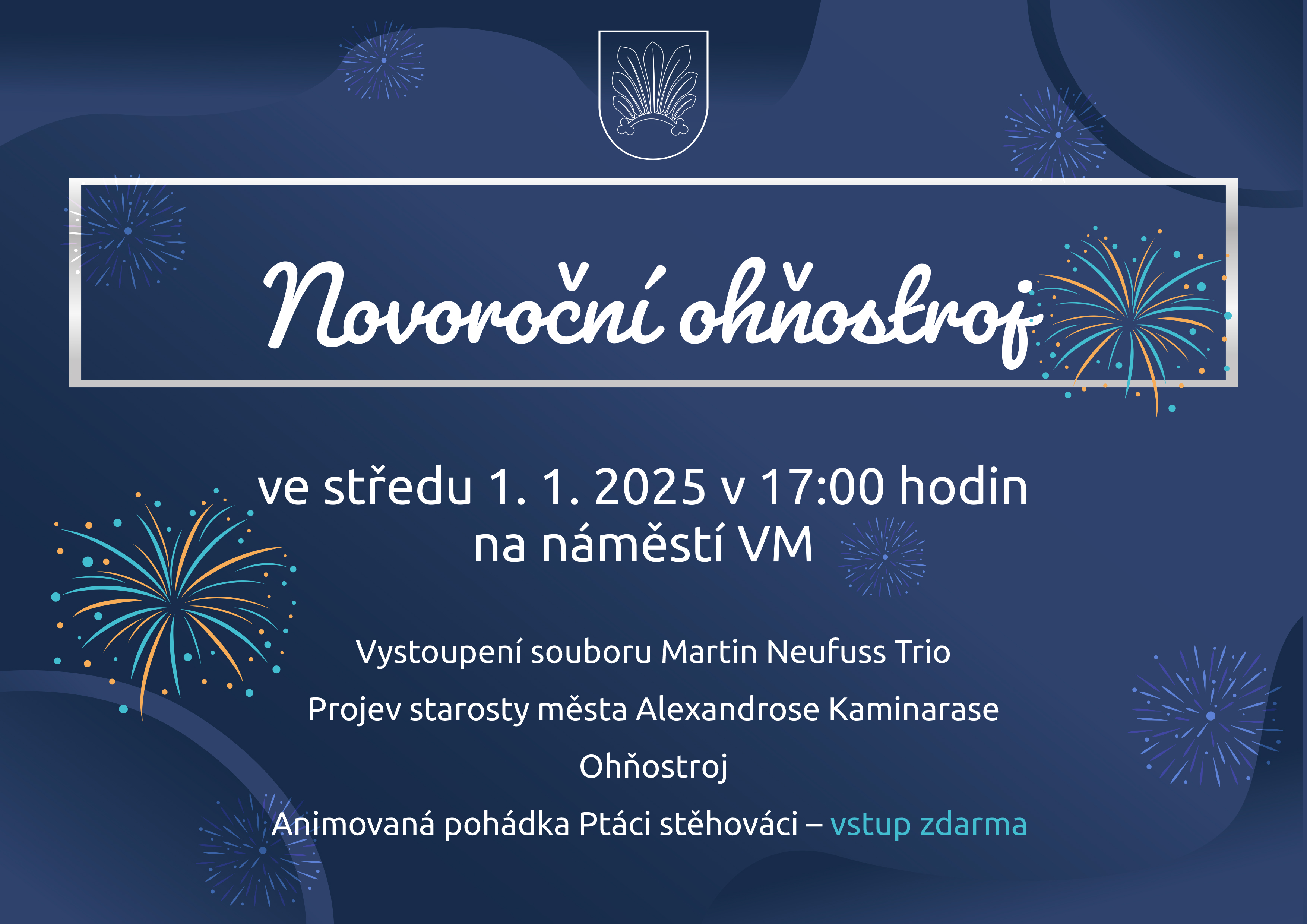 Tradiční novoroční ohňostroj města se uskuteční ve středu 1. ledna od 17:00 na velkomeziříčském náměstí. Na programu je vystoupení souboru Martin Neufuss Trio, projev starosty města Alexandrose Kaminarase, ohňostroj a závěrem promítání animované pohádky Ptáci stěhováci v kině Jupiter clubu (vstup zdarma).
