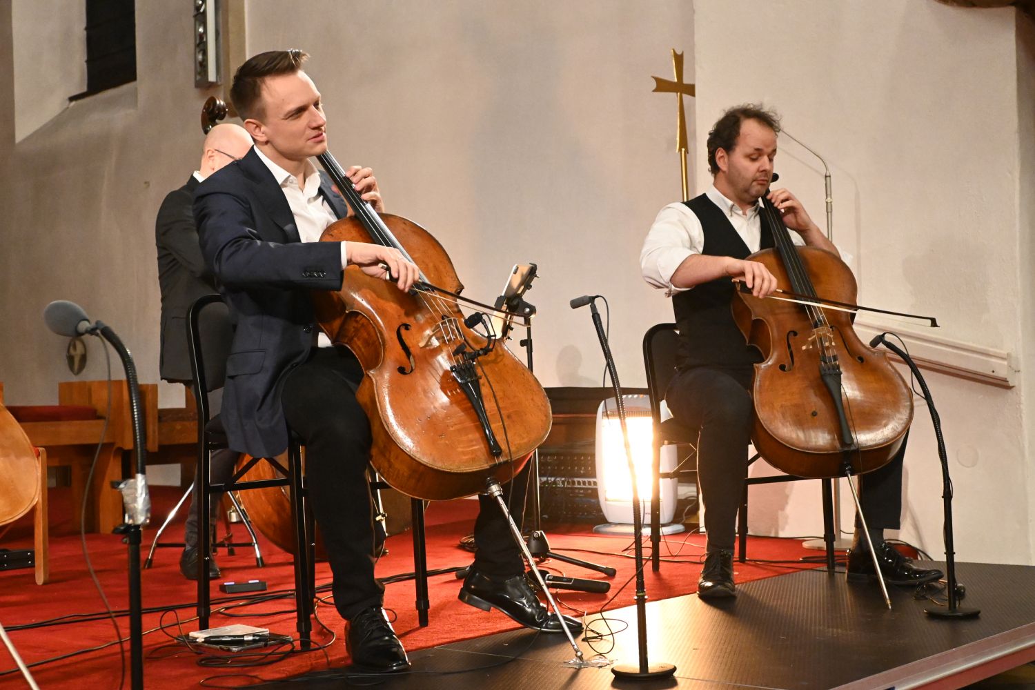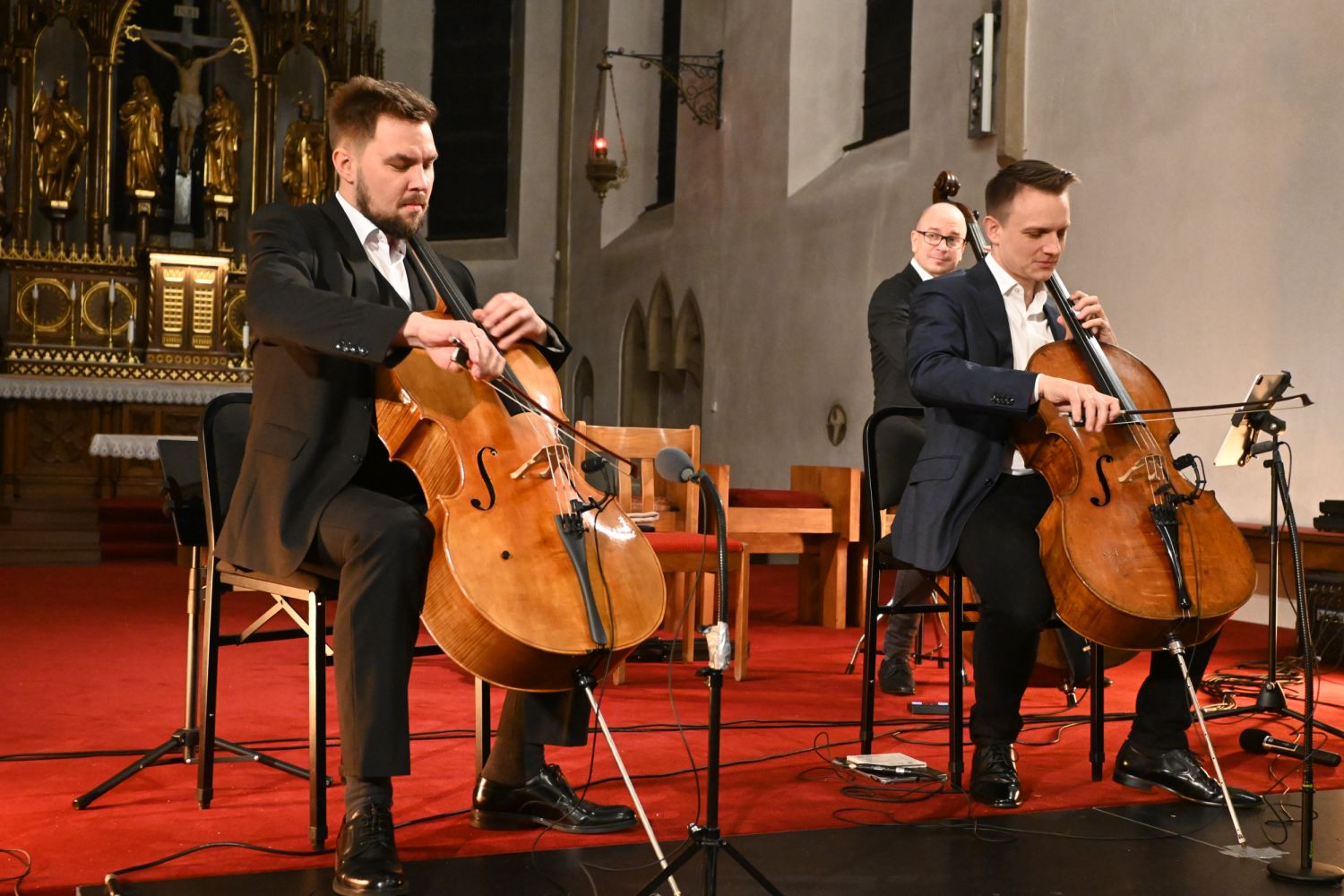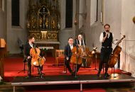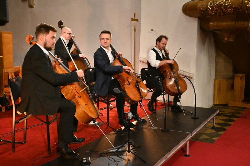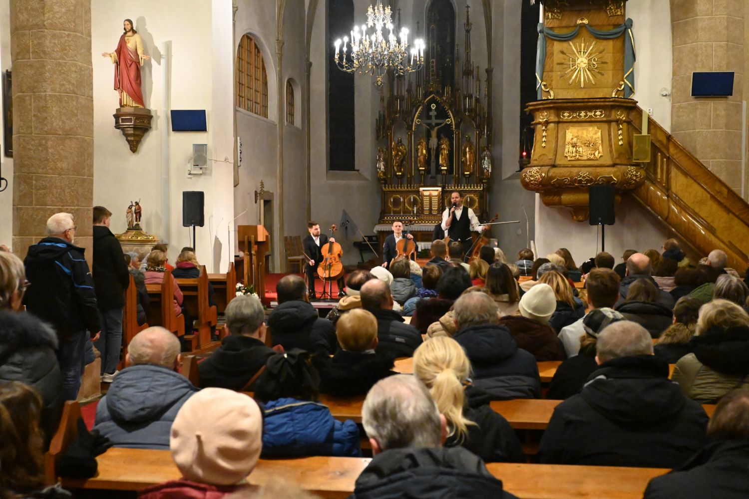 Plný kostel lidí přivítal Prague Cello Quartet. Jan Zvěřina, Štěpán Švestka, Michal Haring na violoncella a Tomáš Otevřel na kontrabas zahráli Šostakoviče, Ježka i Queen či Metallicu.