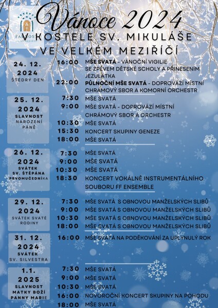1.ledna 2025 na Slavnost Matky Boží Panny Marie proběhne obvyklý nedělní pořad bohoslužeb. Odpoledne v 16 hodin přivítáme v kostele hudební skupinu Na pohodu s vánočním programem.