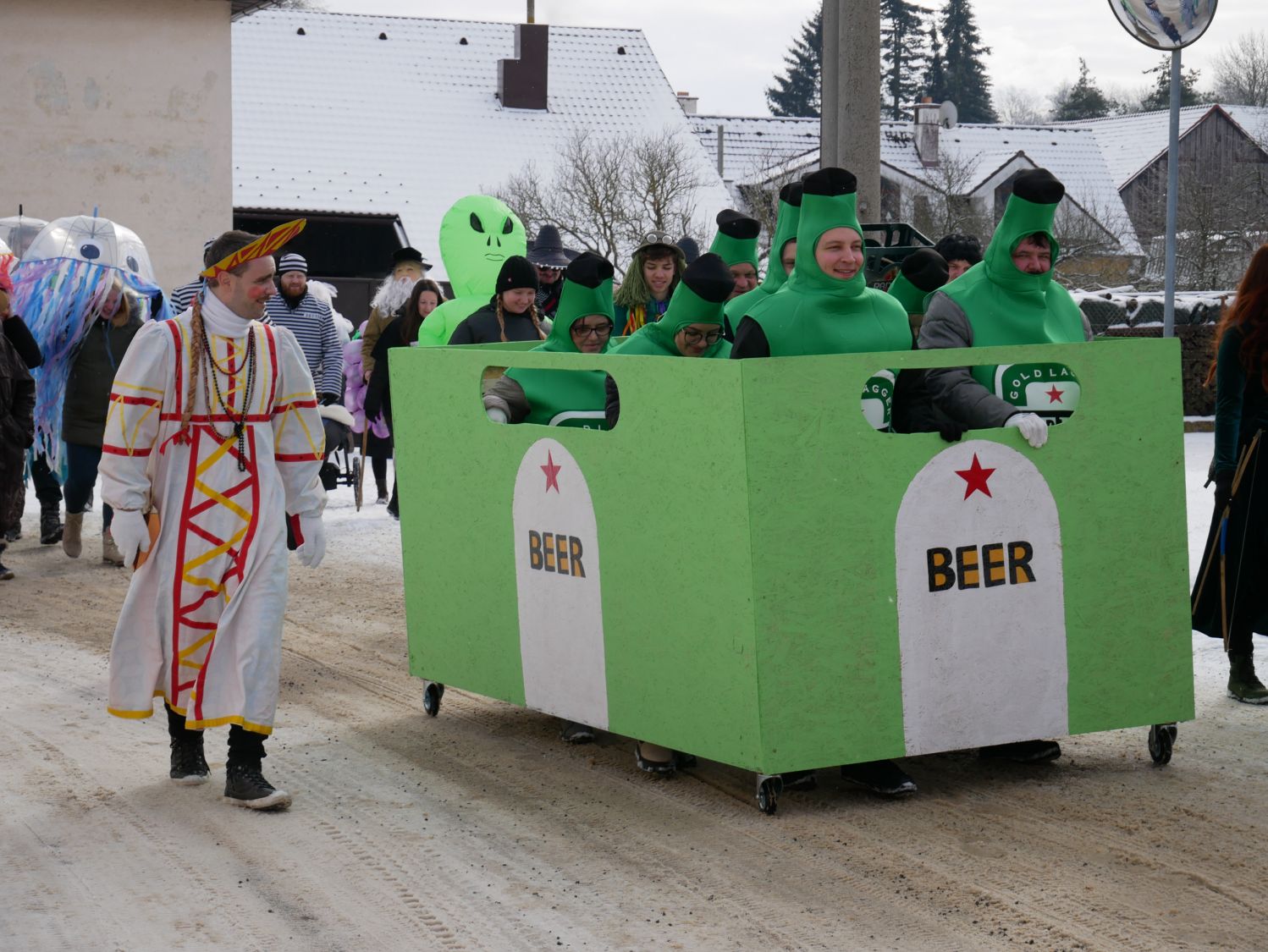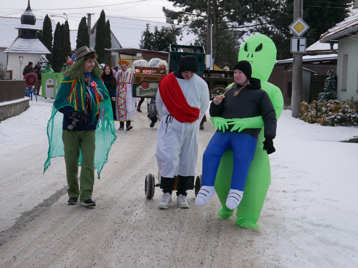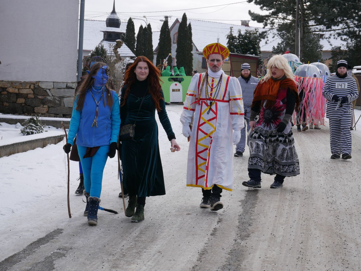 V čele průvodu samozřejmě nechyběli muzikanti, kteří na kytaru, harmoniku a buben zahráli prakticky cokoliv, a tak si na své přišli vyznavači všech hudebních stylů. Zkušeně jim přizvukovala dvojice mexických hudebníků. Za nimi jela s lehkým cinkáním basa piv neurčité značky a chuti. V rytmu hudby se zručně vlnily sličné medúzy, které doprovázel nesmělý vodník. Modré postavy nebyli Šmoulové, ale Avatarky. Nemohla chybět Marfuška, slepice, mimozemšťan nesoucí svou oběť, balónkoví lidé, blonďatá čertice či kriminálníci v doprovodu sličné policistky. Značnou pozor budil i muž převtělený v jakousi alegorii naší doby, na jeho kostýmu tak nechyběl pták snad čáp či husa, plechovka piva a bobr. Duchovní ráz pak celému průvodu dodal Kristus vlekoucí svůj kříž.