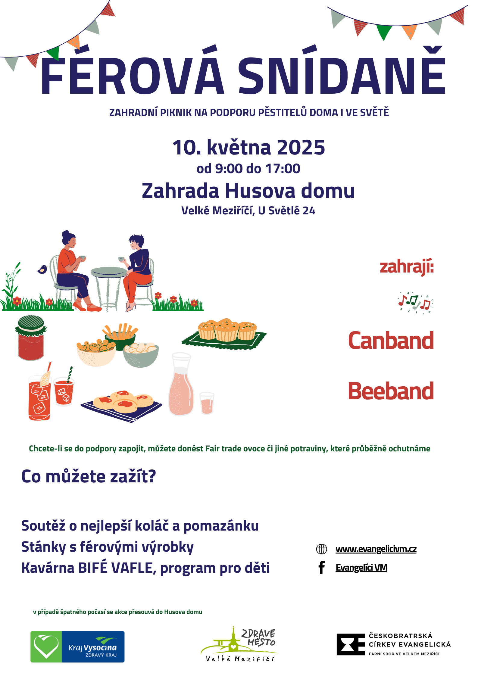 Město Velké Meziříčí pořádá již počtvrté ve spolupráci s místním evangelickým sborem a Krajem Vysočina Férovou snídani (fairtrade.cz) a připojuje se k celorepublikové akci, která se koná vždy druhou sobotu v květnu.