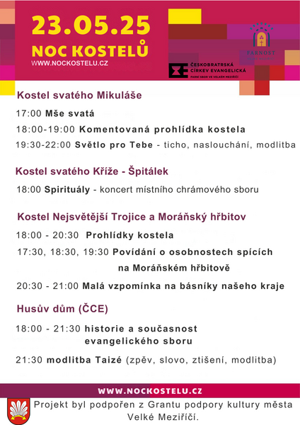 Při tvorbě programu ve Velkém Meziříčí jsme se inspirovali výročím konce války. Hlavní program bude probíhat v malém kostelíku Nejsvětější Trojice Na Moráni a přilehlém hřbitově. Od 18 do 20:30 bude pro všechny kostel volně otevřen s průběžnými komentáři o jeho historii. V kostele není zavedena elektřina, svítit lze jen svíčkami, večerní program tedy získává výjimečnou atmosféru. Těšíme se v 17:30, 18:30 a 19:30 na Povídání o osobnostech spících na Moráňském hřbitově s paní ředitelkou knihovny Mgr. Ivanou Vaňkovou. Prožijeme příjemnou poznávací procházku po tomto pietním místě, propleteném kořeny našeho města. Program zakončíme od 20:30 do 21:00 malou vzpomínkou na básníky našeho kraje.