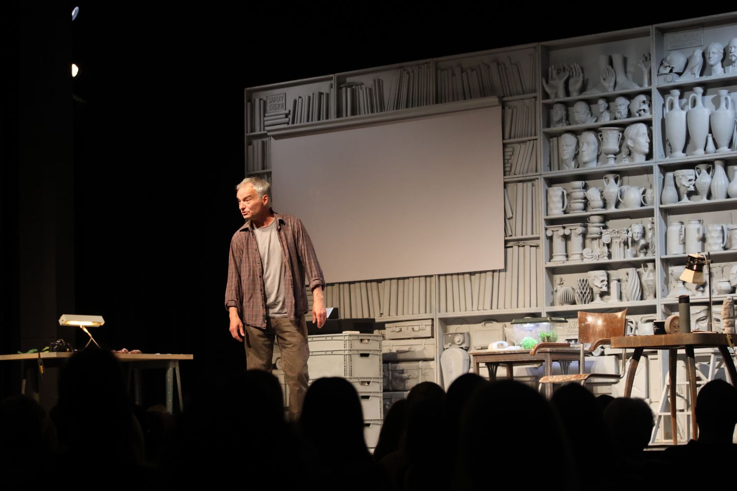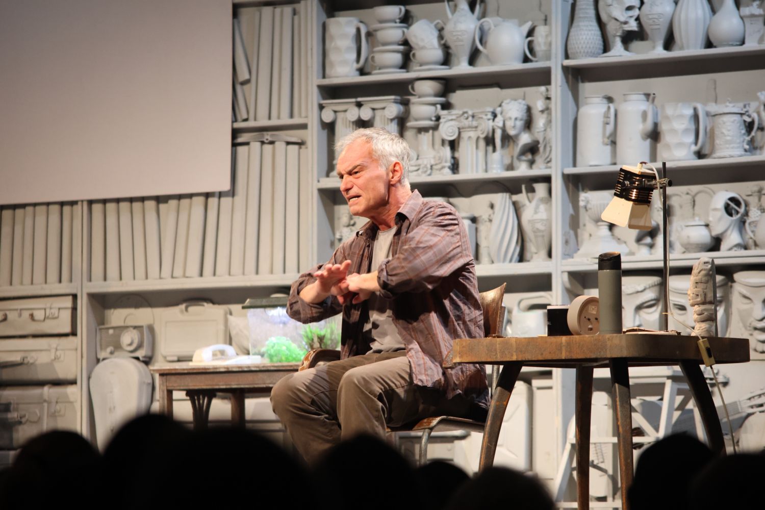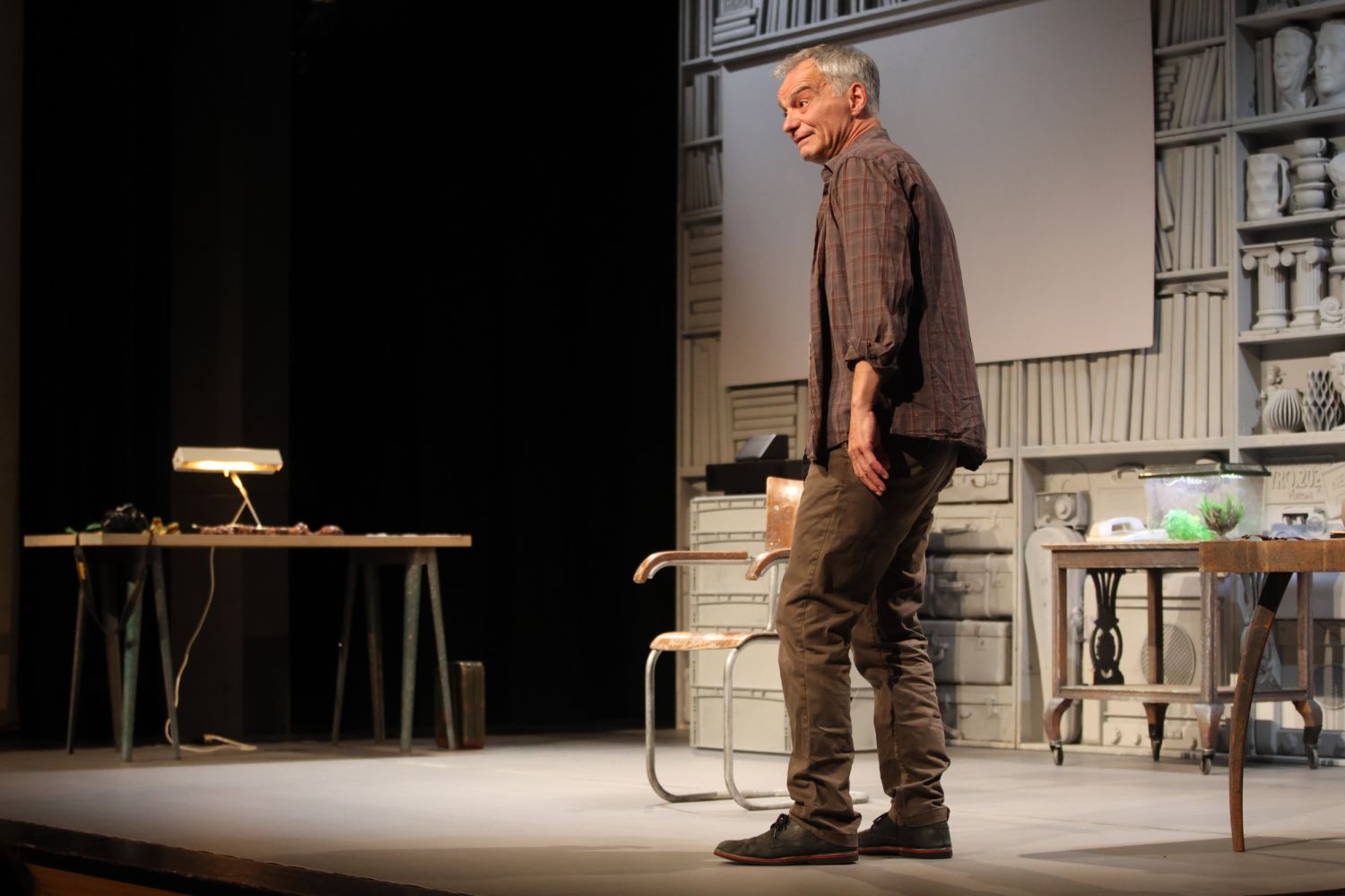 „Prostě rekvizita, když na to přijde, vždycky zvítězí nad hercem. A to vám řekne každý,“ rozčiluje se rekvizitář na přednášce o své profesi. „Navíc, bez herců se film i obejde, ale bez rekvizit nenatočíte nic,“ dodává a jako příklad uvádí lžičku z filmu Pelíšky. „Tahle lžička udělala ten film!“ Rekvizitář totiž bojuje s pocitem nedoceněnosti a vnímá, že jeho největším nepřítelem je právě herec. Je trochu naivní a má silný vztah k věcem, silnější než k lidem. Hra Žáby je tak vlastně i poctou lidem u filmu a u divadla, kteří nejsou tolik vidět jako třeba herci. Především je však, díky Ivanu Trojanovi, poctou hereckému řemeslu.