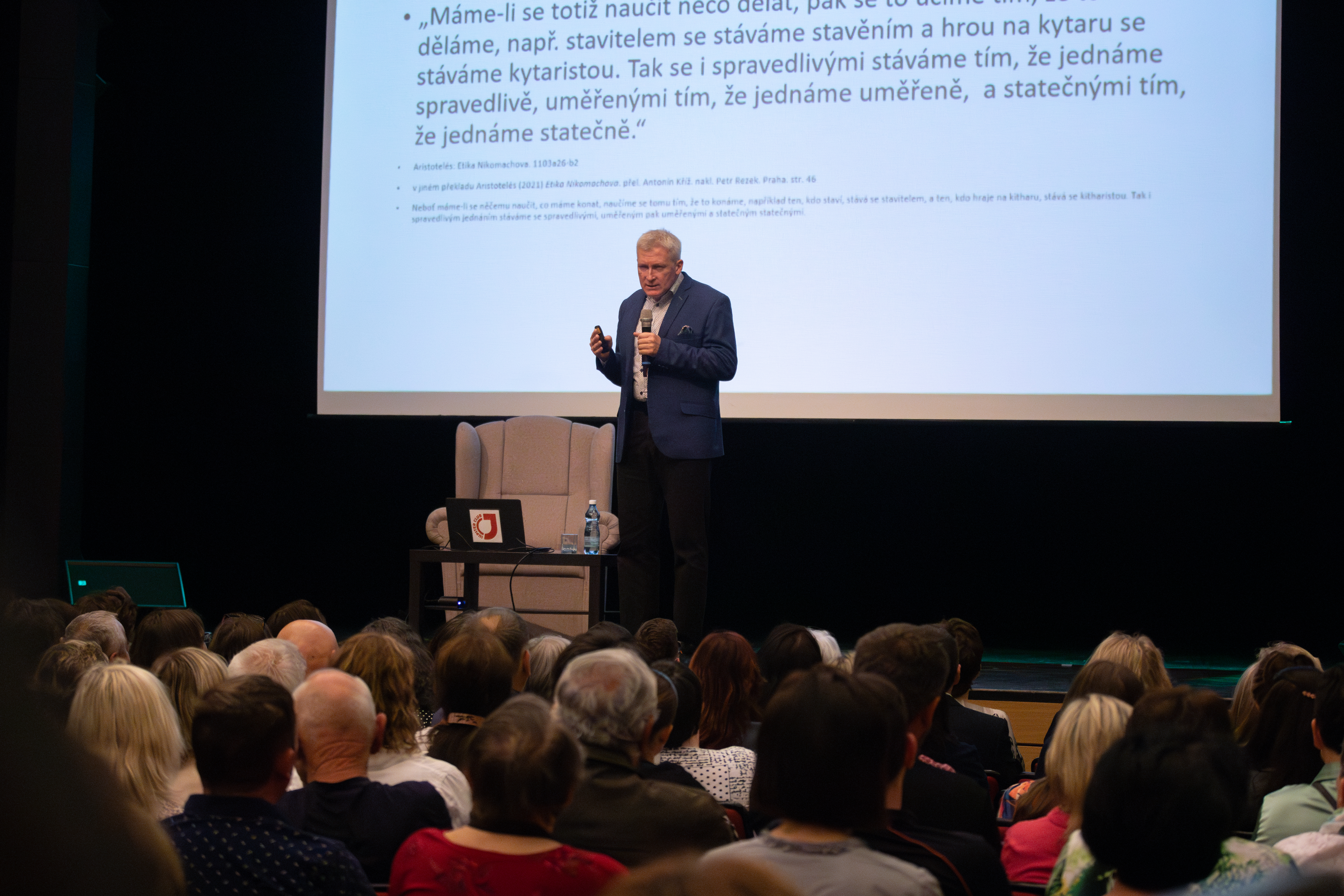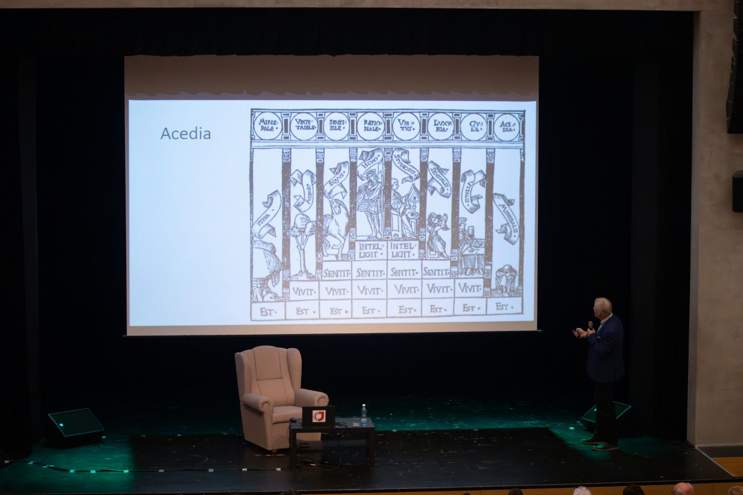 Velmi často při své besedě zmiňoval věty Aristotela či Sókratése. Vysvětlil, že člověk, který vybouchne vzteky je člověk „akrastický“. Toto slovo je odvozeno od slova acrasia, které v překladu z řečtiny znamená „neschopnost ovládat se“ nebo „bezmocnost“. Zdůraznil, že duši mají nejen lidé, ale i zvířata a rostliny.