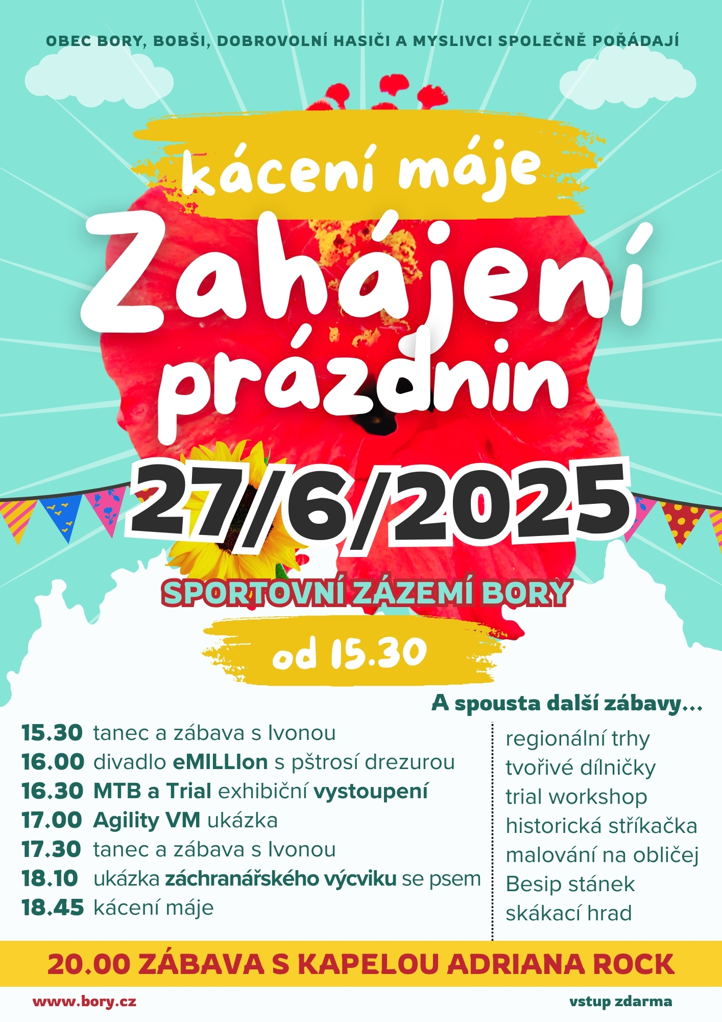 Obec Bory ve spolupráci s Bobši, dobrovolnými hasiči a myslivci zve širokou veřejnost na oblíbenou letní akci Zahájení prázdnin, která proběhne v pátek 27. června 2025 od 15.30 hodin ve sportovním areálu v Borech.