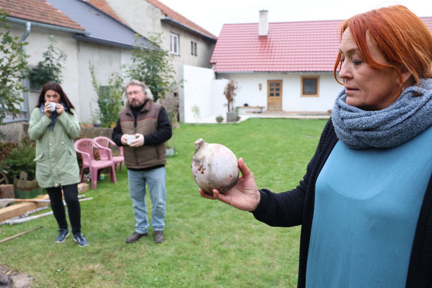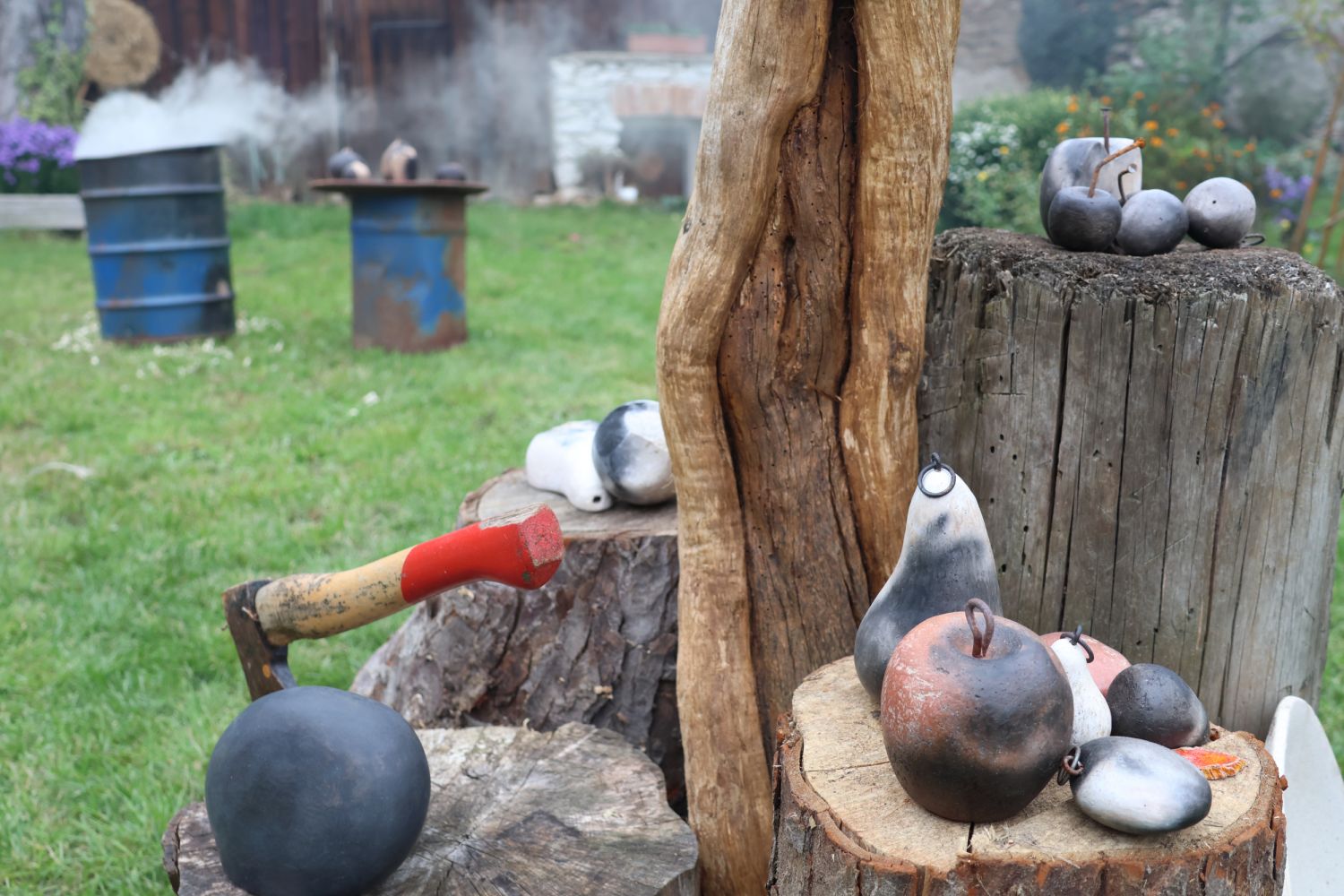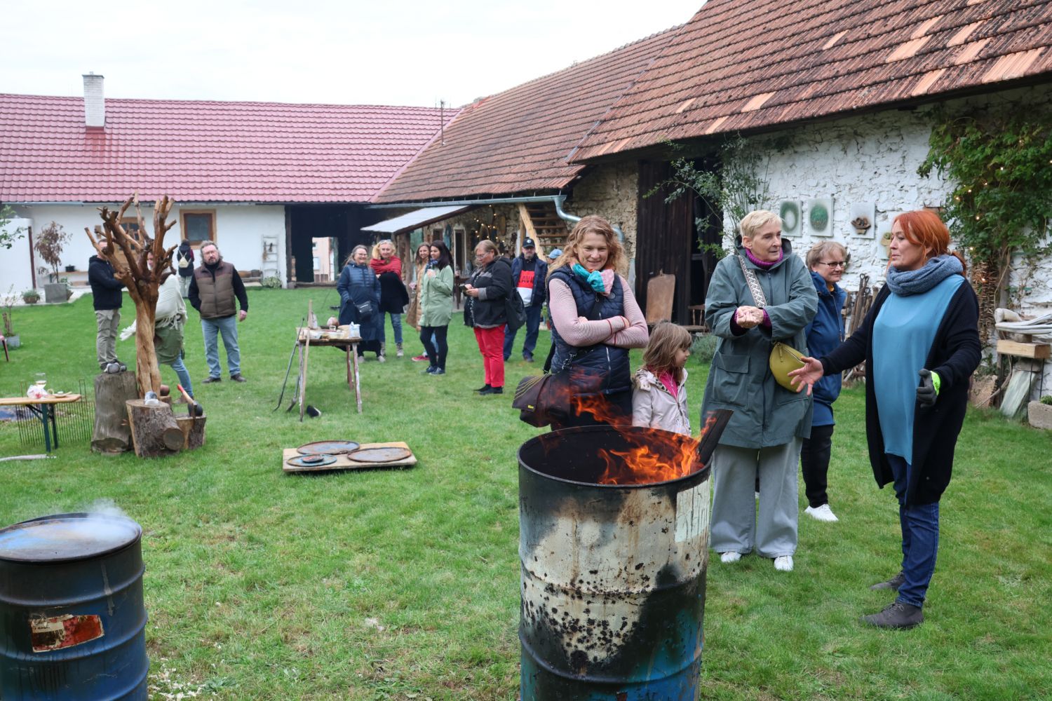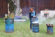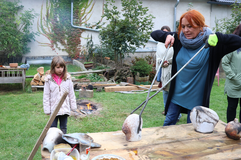 To nad statkem v Radostíně nad Oslavou se neustále vznášela oblaka dýmu. Jana Mikysková tu totiž předváděla přírodní výpaly keramiky. Kouřilo se nejen z ohniště na dvoře, ale také z několika sudů, kde doutnaly piliny či šlehaly plameny, zatímco výtvarnice představovala početné skupině přihlížejících již hotové kousky. „Tady ty černé tečky vznikly po posypání výrobku cukrem, tyhle jsou od soli a tady ty vzory vytvořily koňské žíně,“ vysvětlovala různé techniky jako třeba raku či zakuřování v pilinách. „Přírodní výpaly ovlivňuje tolik věcí, že výsledek je pro mě vždycky překvapením, a to se mi na tom líbí,“ dodala.