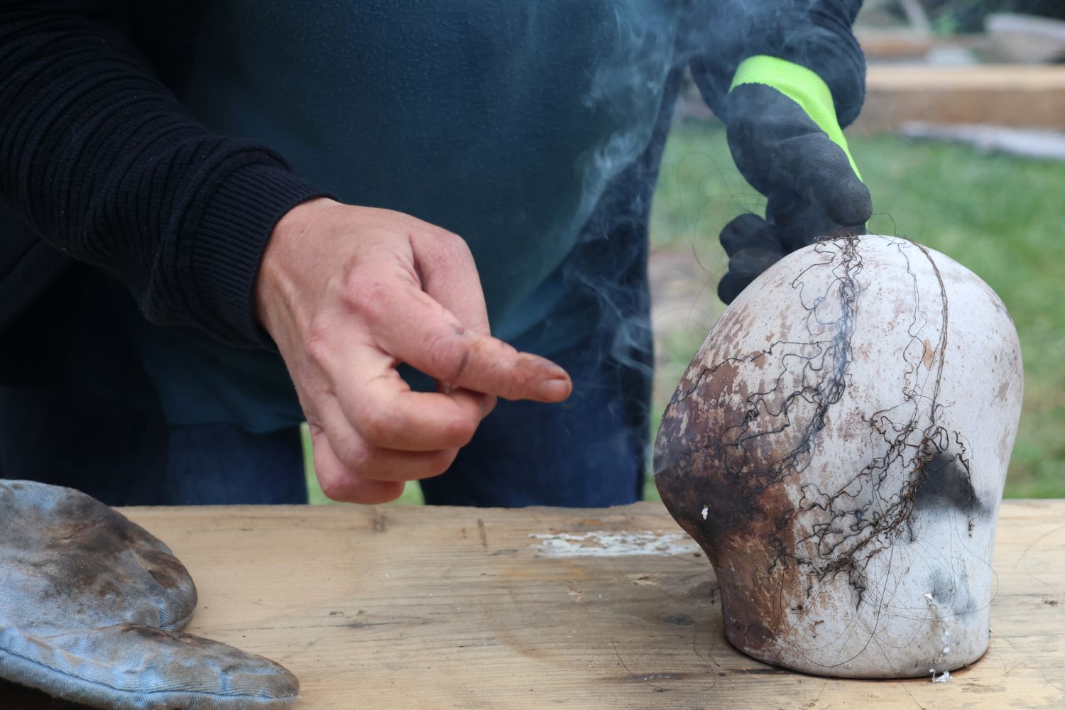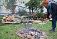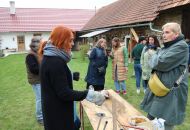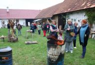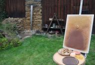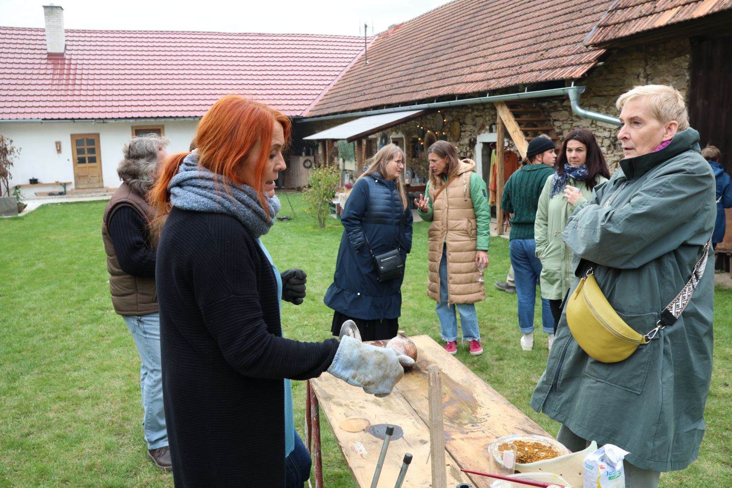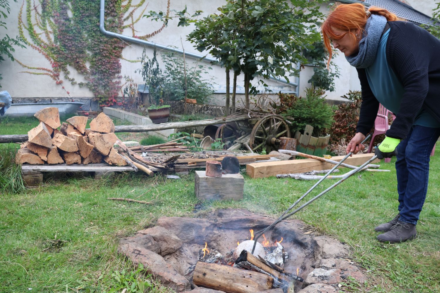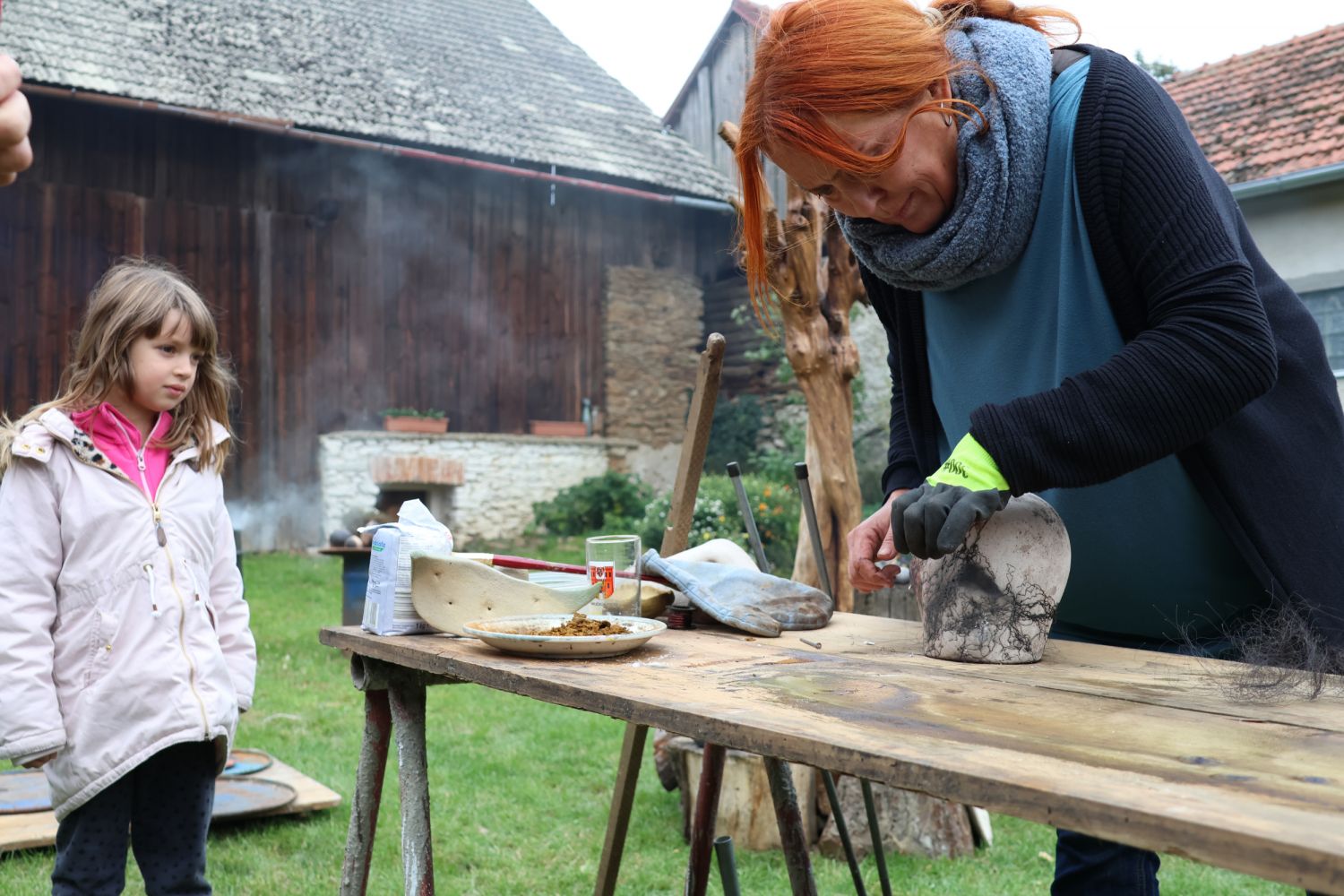 To nad statkem v Radostíně nad Oslavou se neustále vznášela oblaka dýmu. Jana Mikysková tu totiž předváděla přírodní výpaly keramiky. Kouřilo se nejen z ohniště na dvoře, ale také z několika sudů, kde doutnaly piliny či šlehaly plameny, zatímco výtvarnice představovala početné skupině přihlížejících již hotové kousky. „Tady ty černé tečky vznikly po posypání výrobku cukrem, tyhle jsou od soli a tady ty vzory vytvořily koňské žíně,“ vysvětlovala různé techniky jako třeba raku či zakuřování v pilinách. „Přírodní výpaly ovlivňuje tolik věcí, že výsledek je pro mě vždycky překvapením, a to se mi na tom líbí,“ dodala.